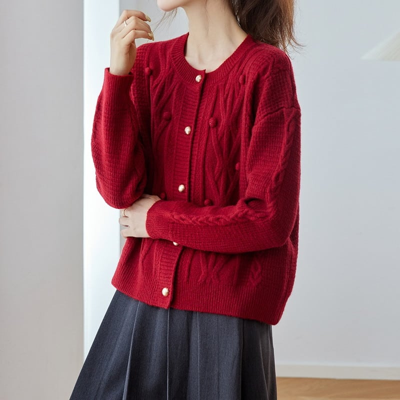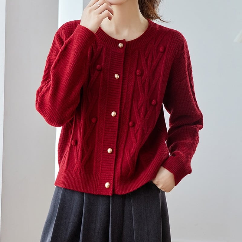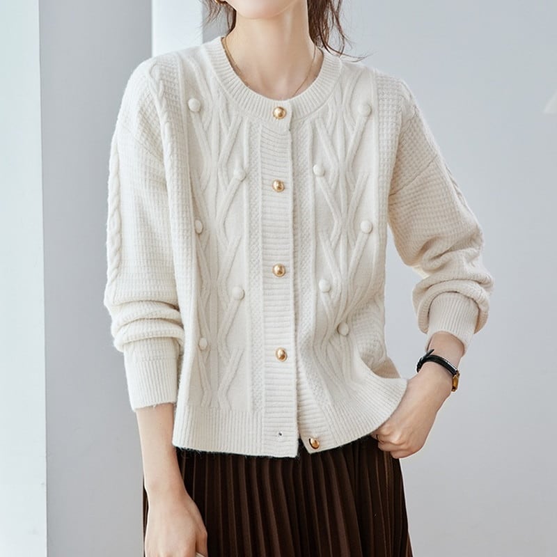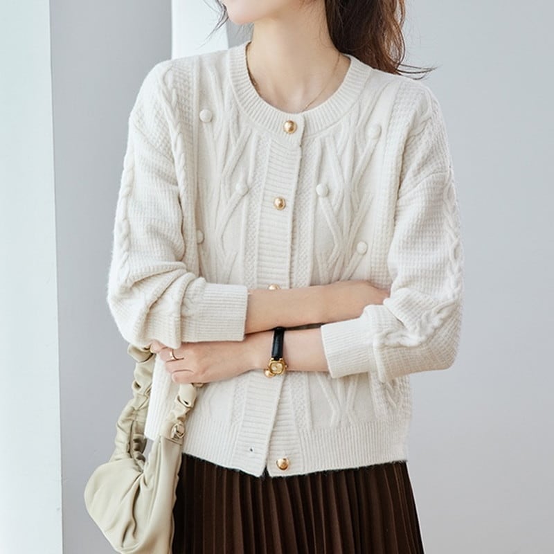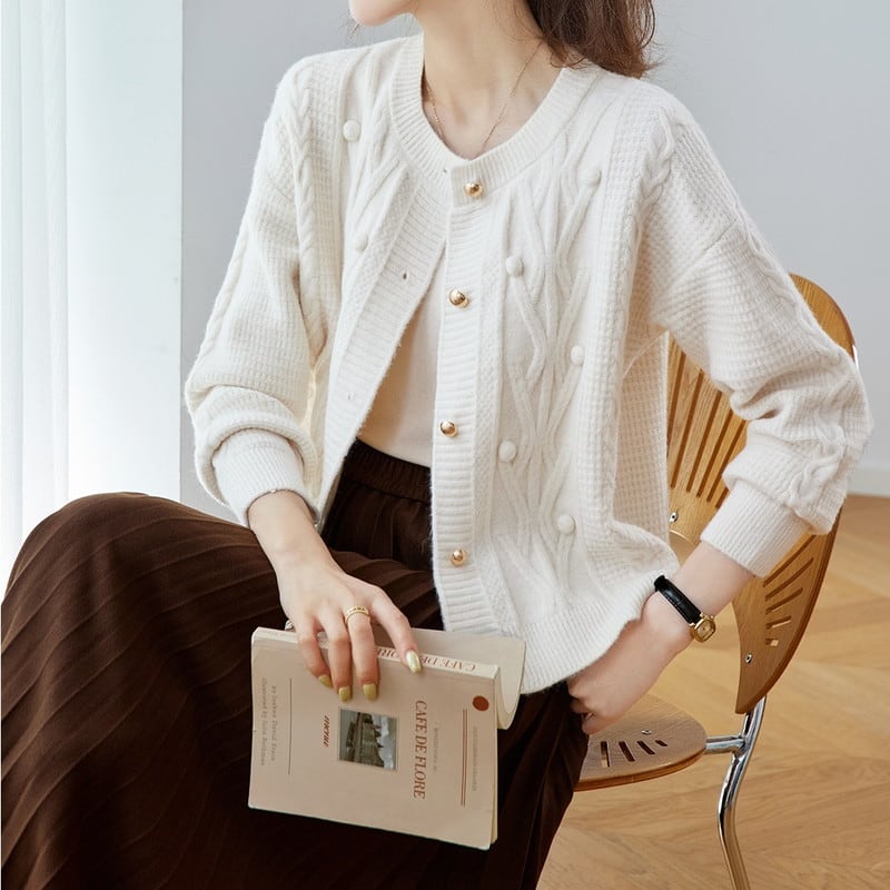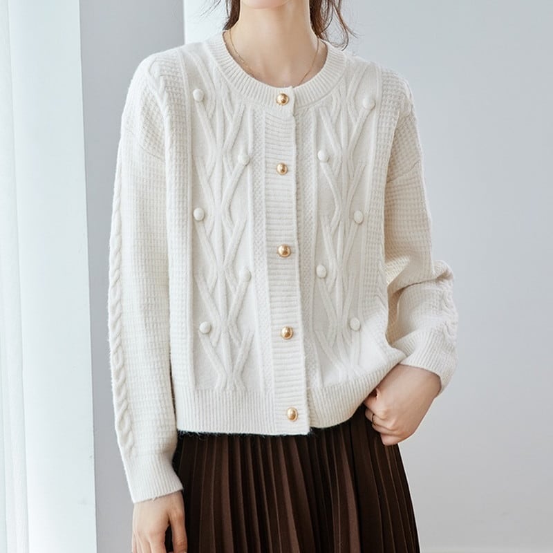 フロントのボタンがさりげなく華やかさを添え、顔まわりをやわらかく見せてくれます。
