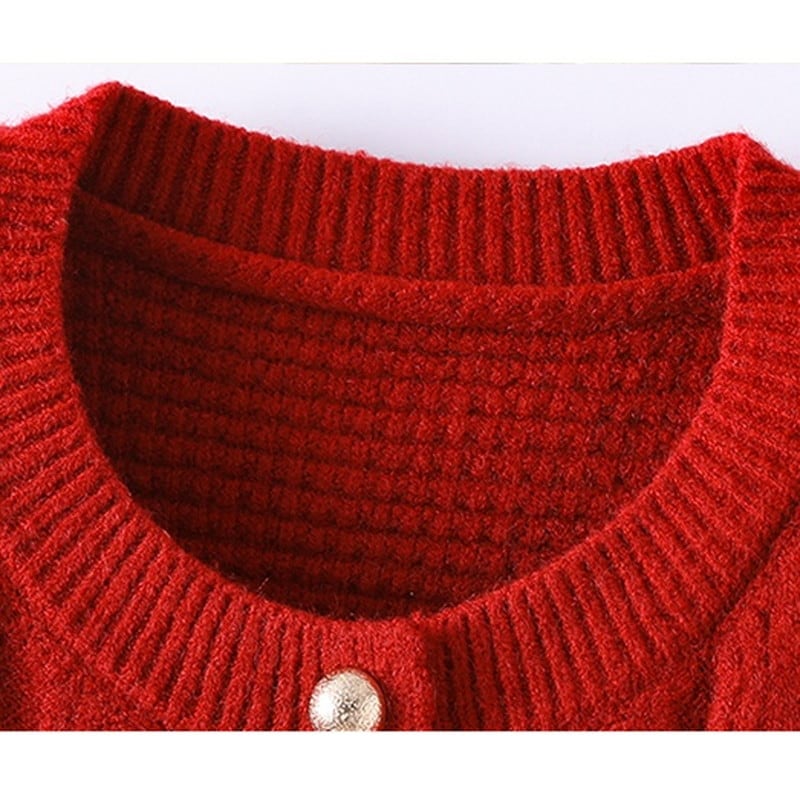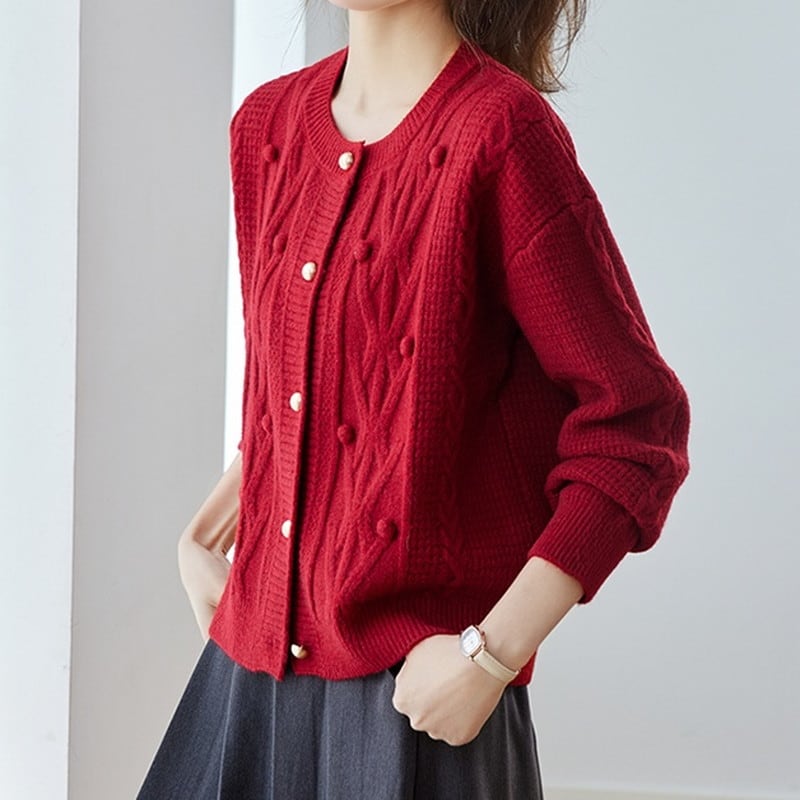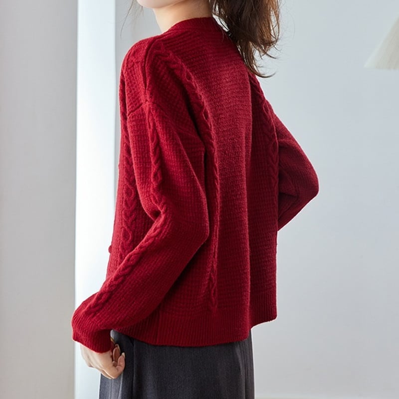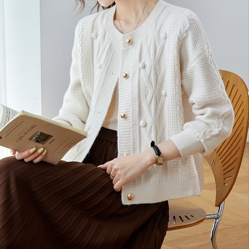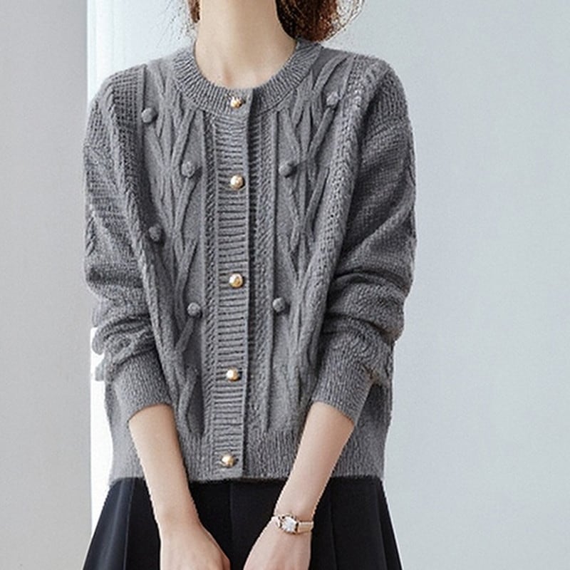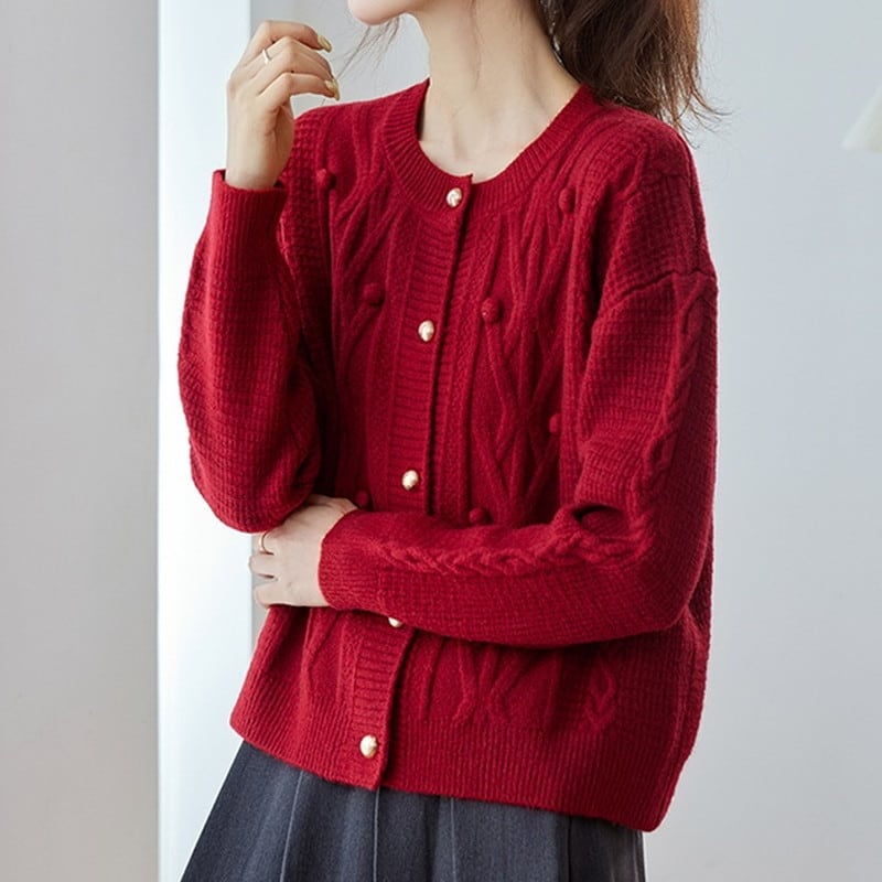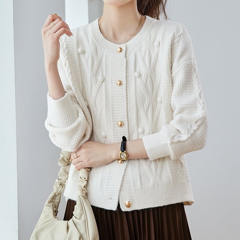 フロントのボタンがさりげなく華やかさを添え、顔まわりをやわらかく見せてくれます。