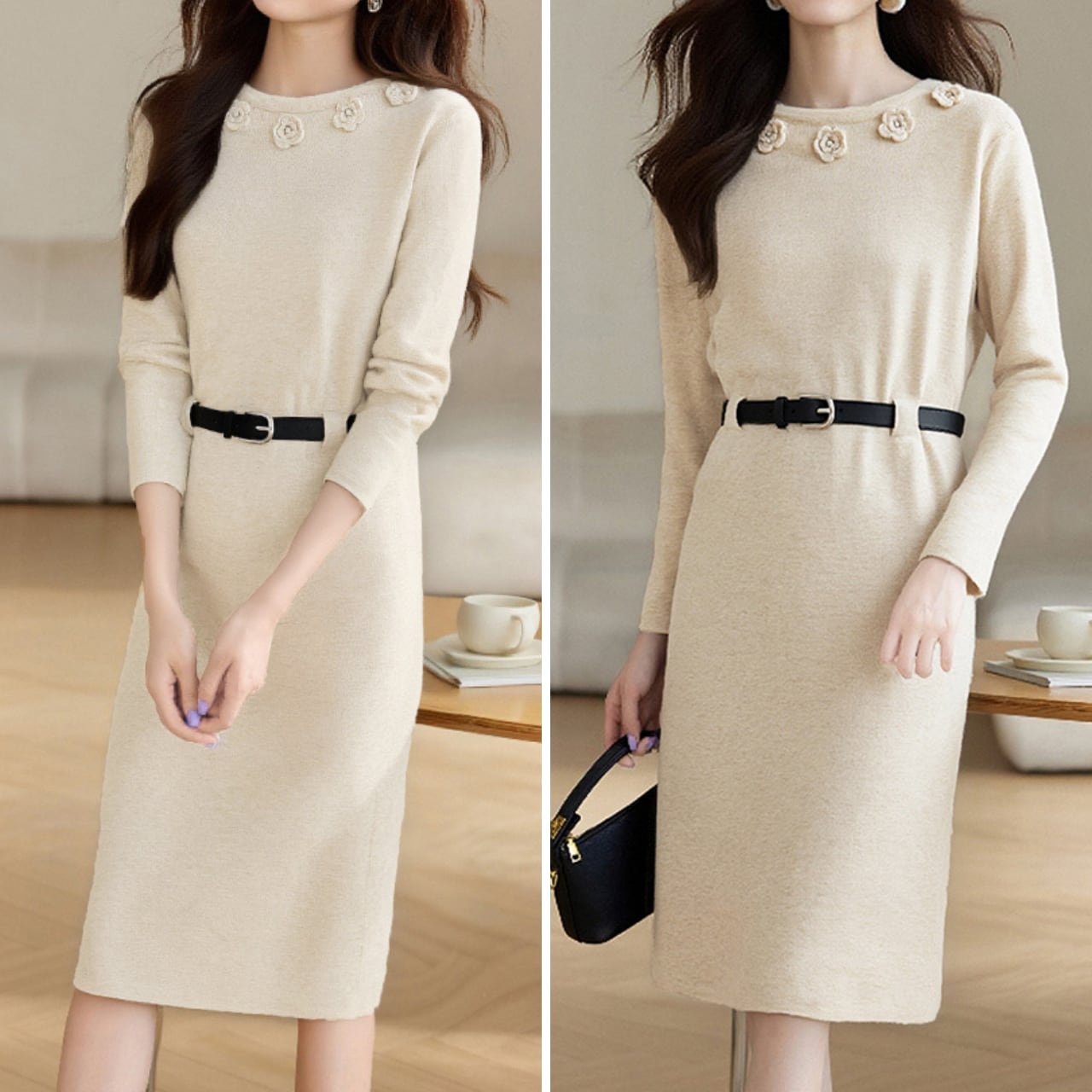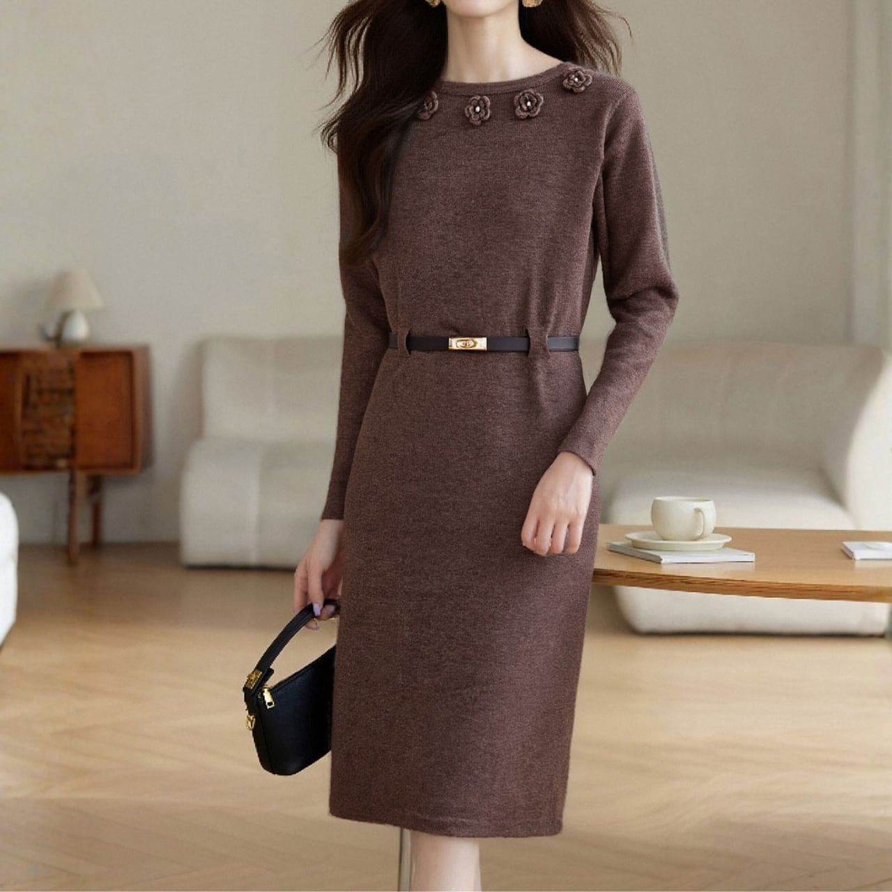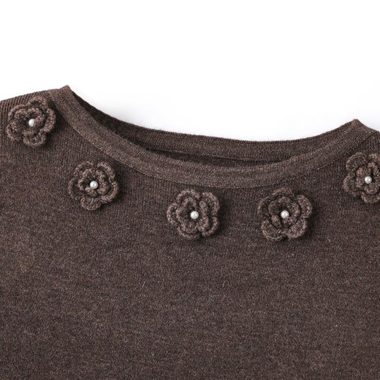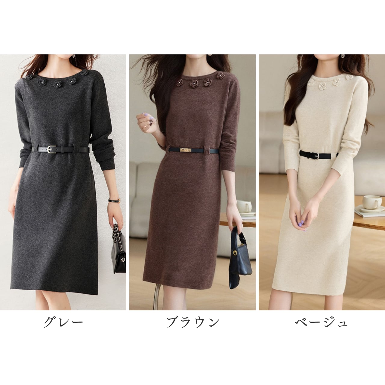 立体的なフラワーモチーフが、さりげなく華やかさを添えるニットワンピース。
