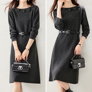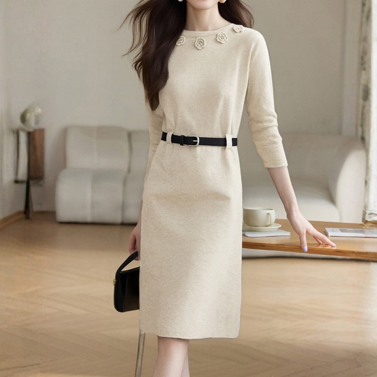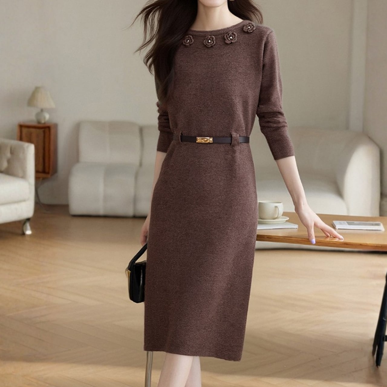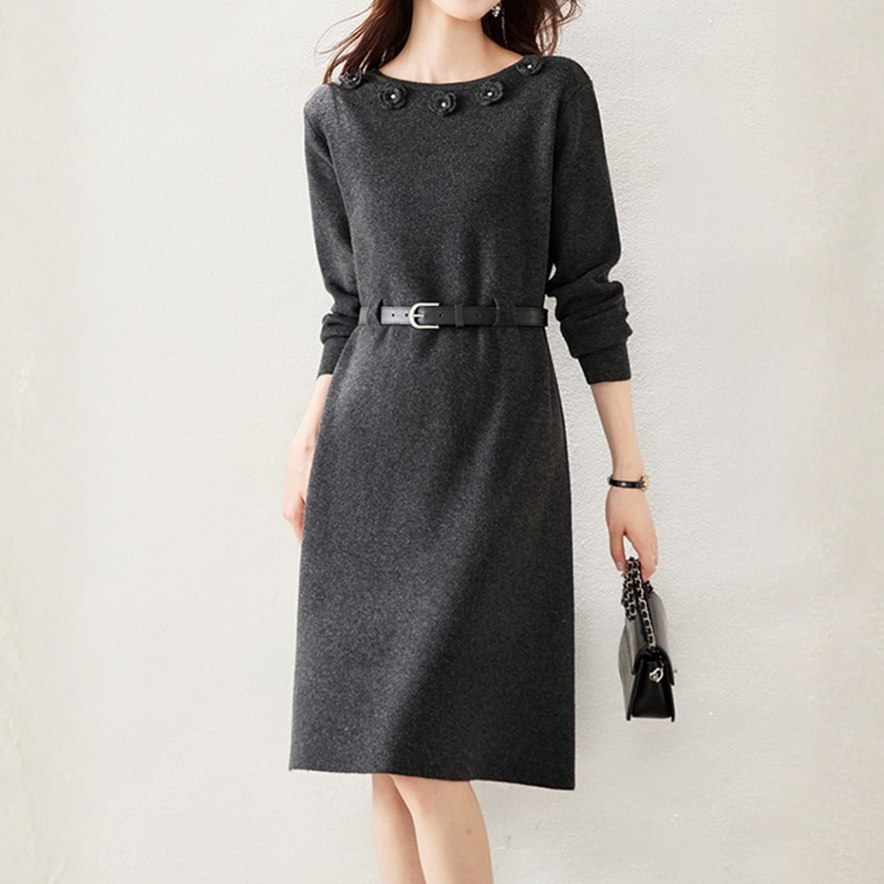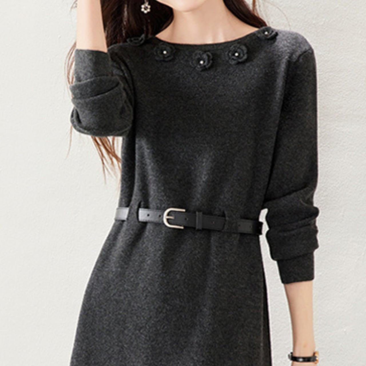 立体的なフラワーモチーフが、さりげなく華やかさを添えるニットワンピース。