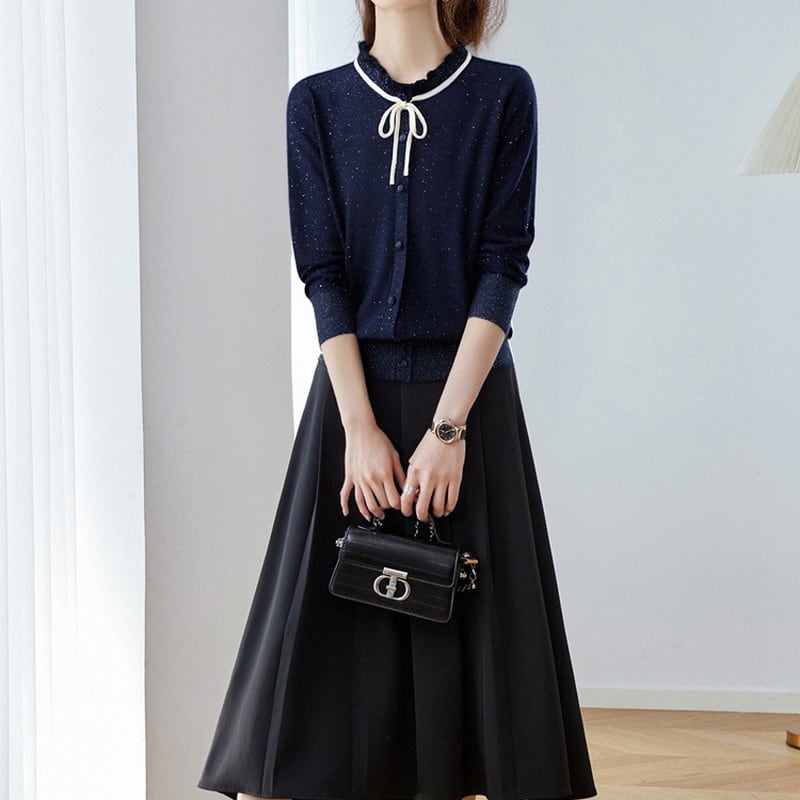 バイカラーのリボンが可憐に映えるカーディガンです。
