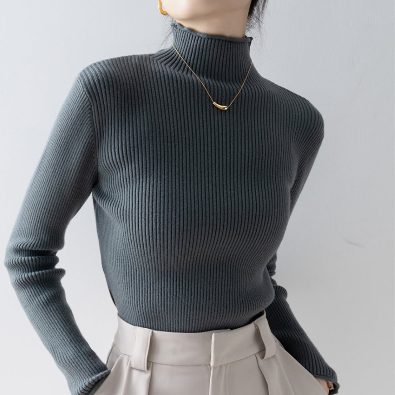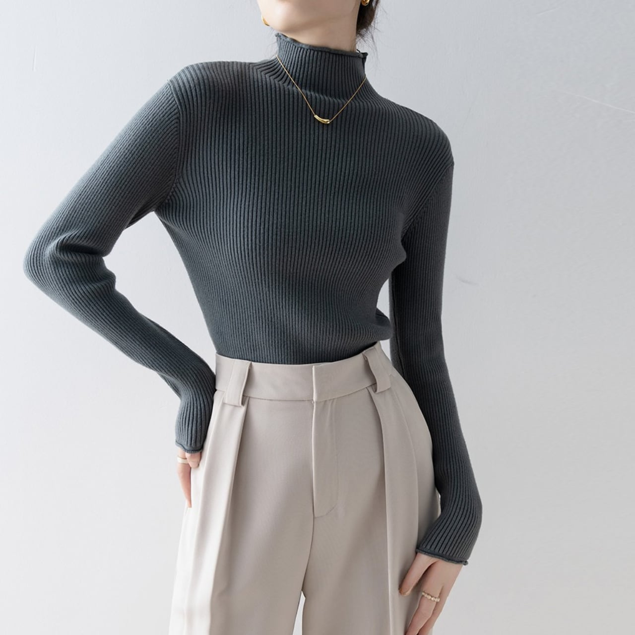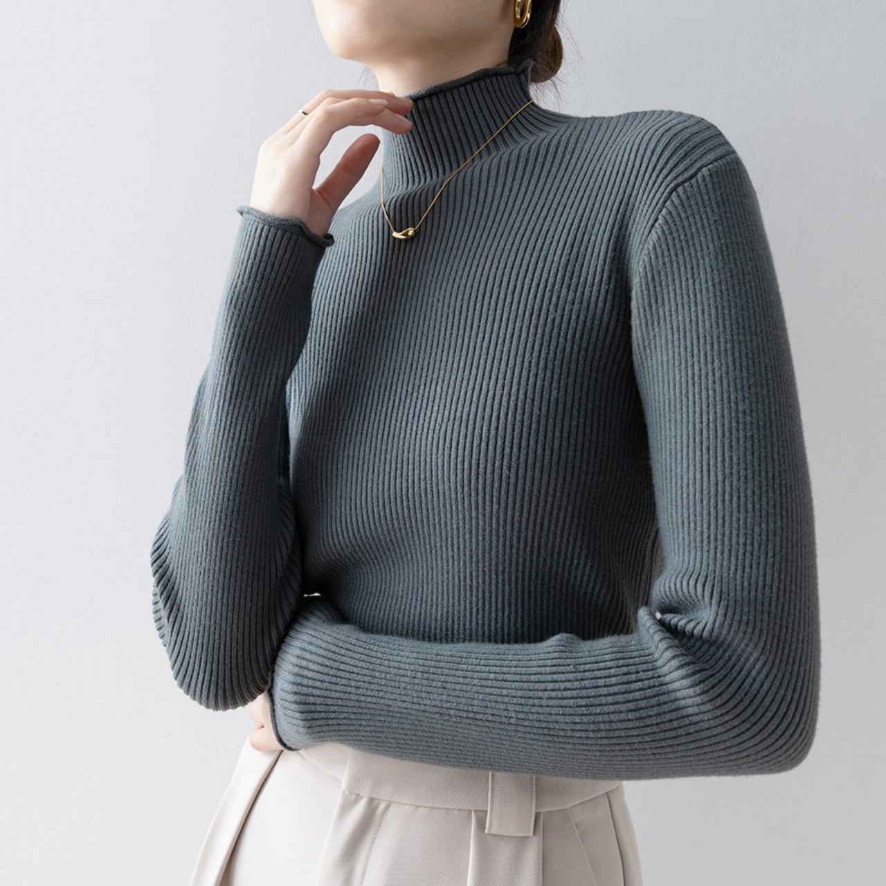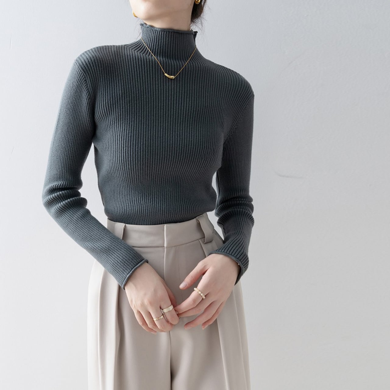 ハイネックのデザインが上品さを演出し、オフィスシーンにもおすすめです。
