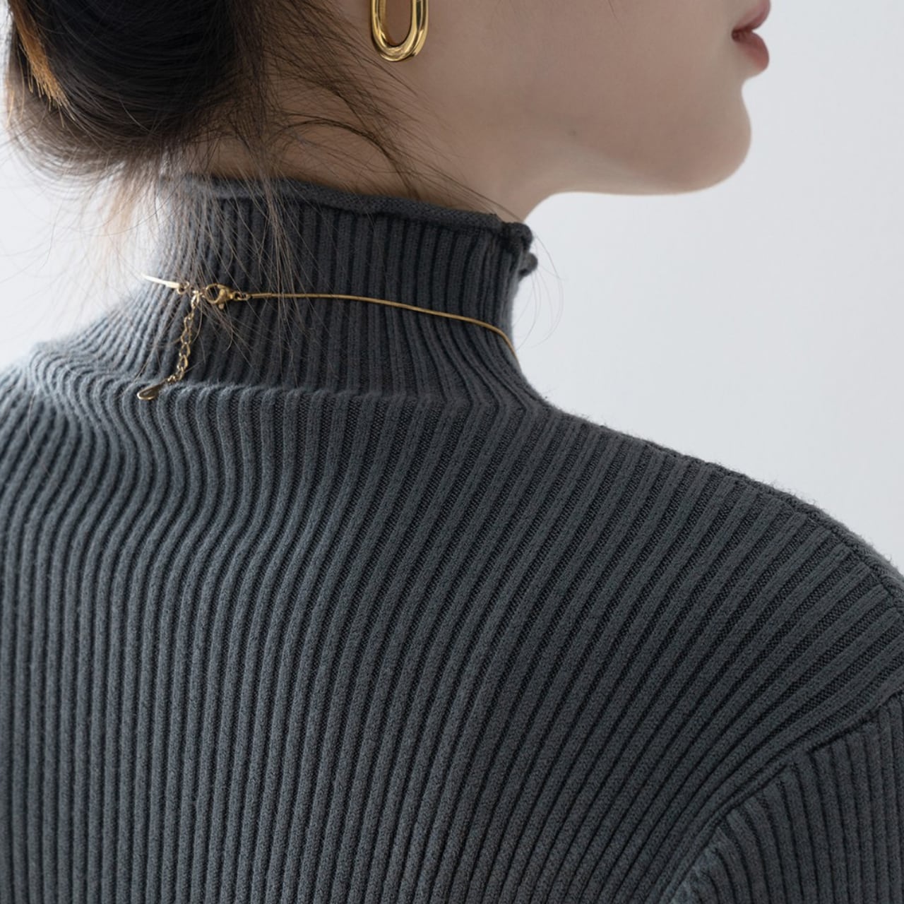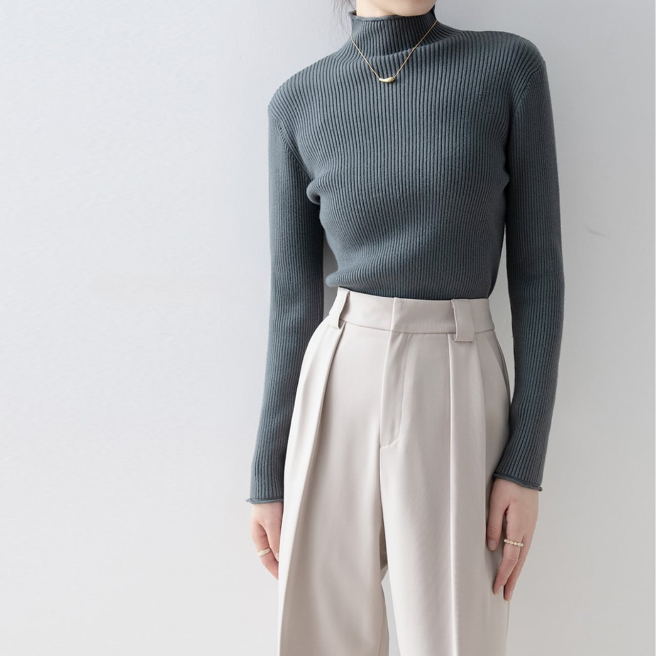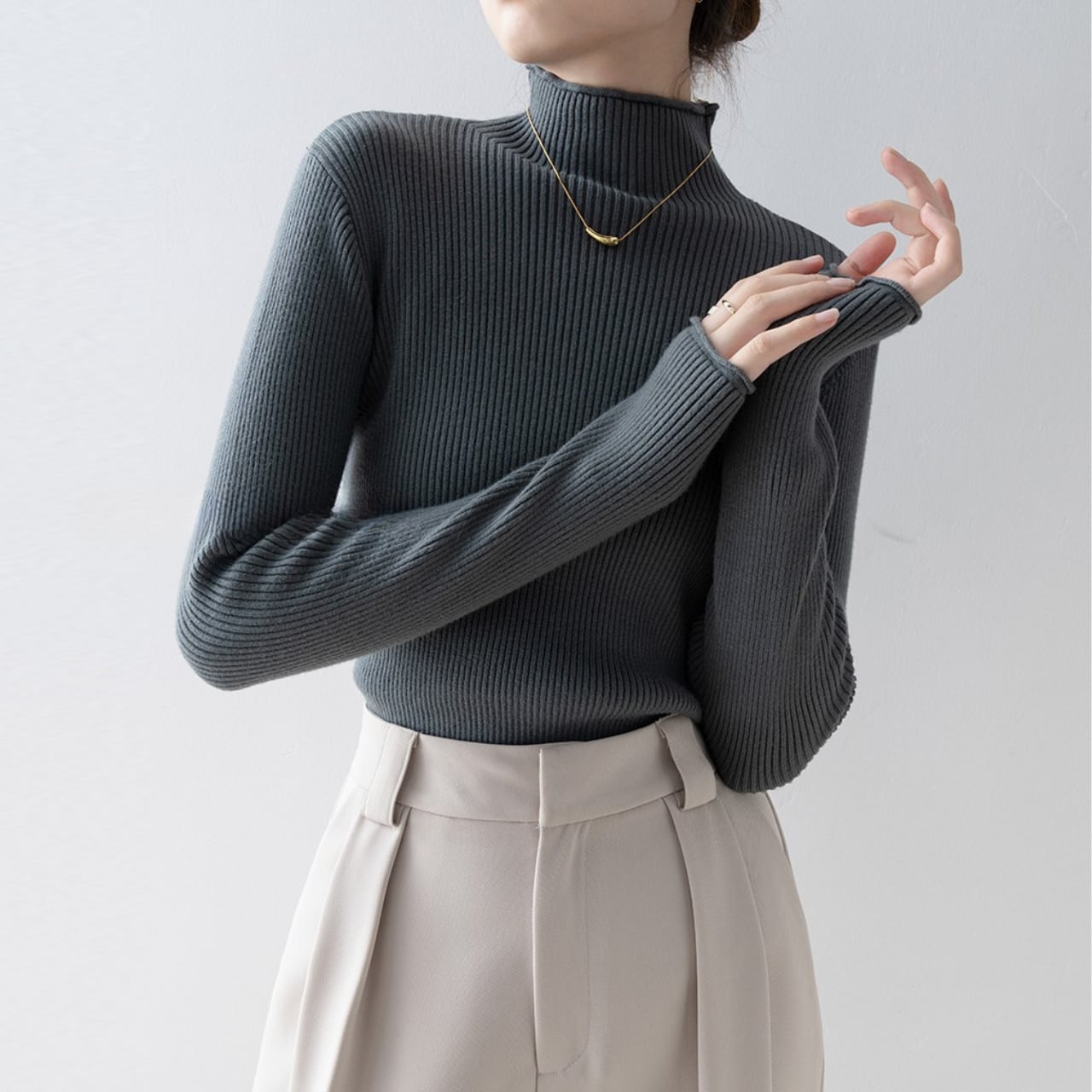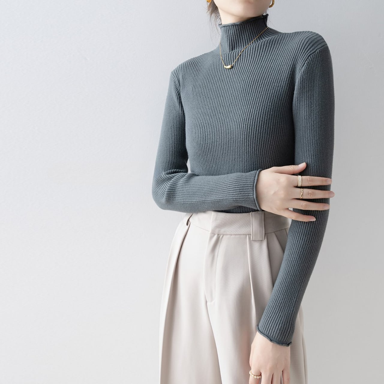 ハイネックのデザインが上品さを演出し、オフィスシーンにもおすすめです。