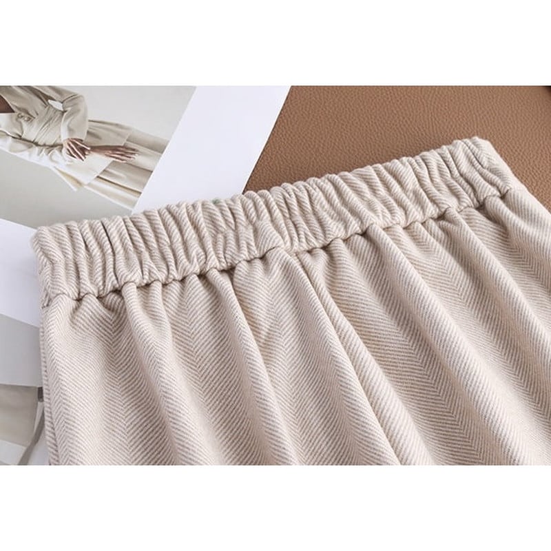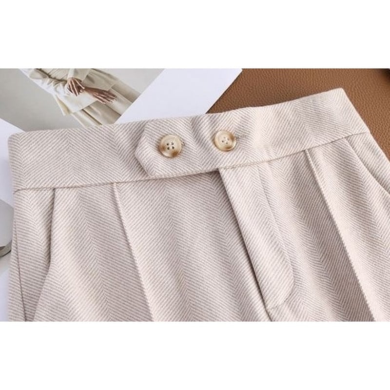ウエストボタンのデザインが上品なアクセントになり、どんなトップスとも合わせやすいのが魅力。