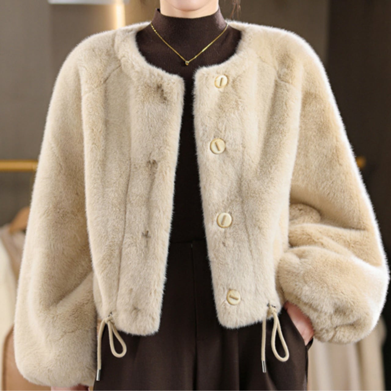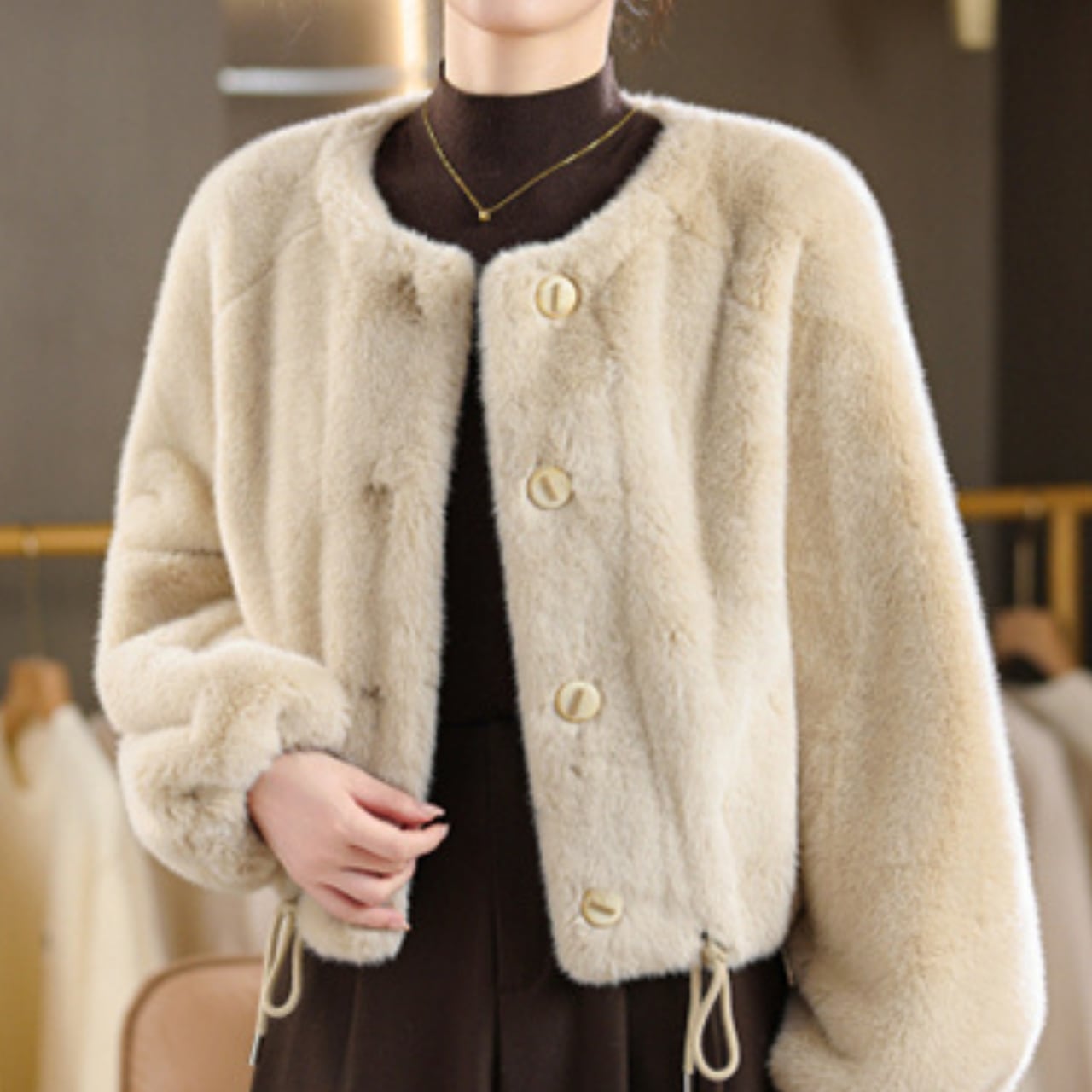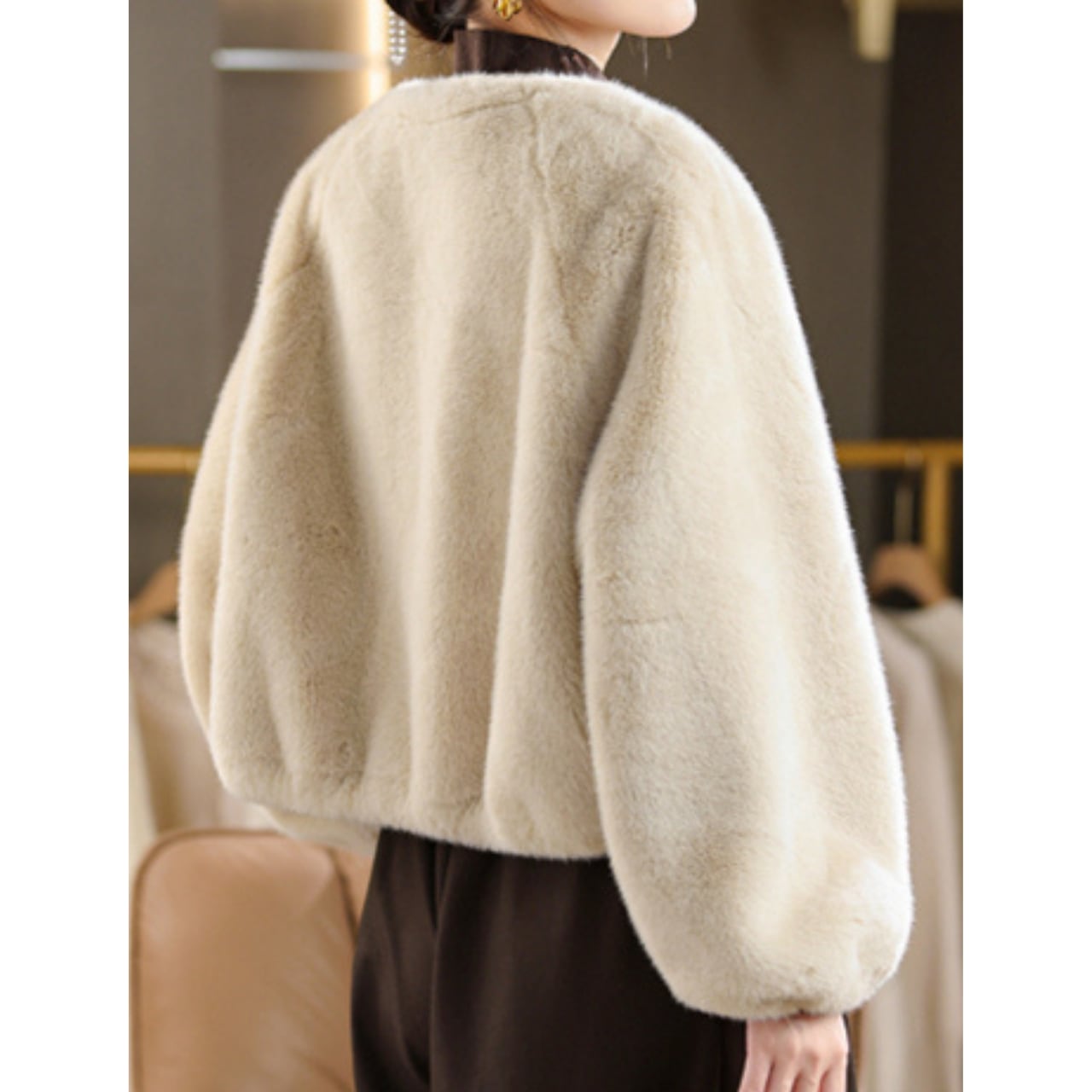 首元をすっきりと見せるノーカラーデザインで、マフラーやストールとの相性も抜群。