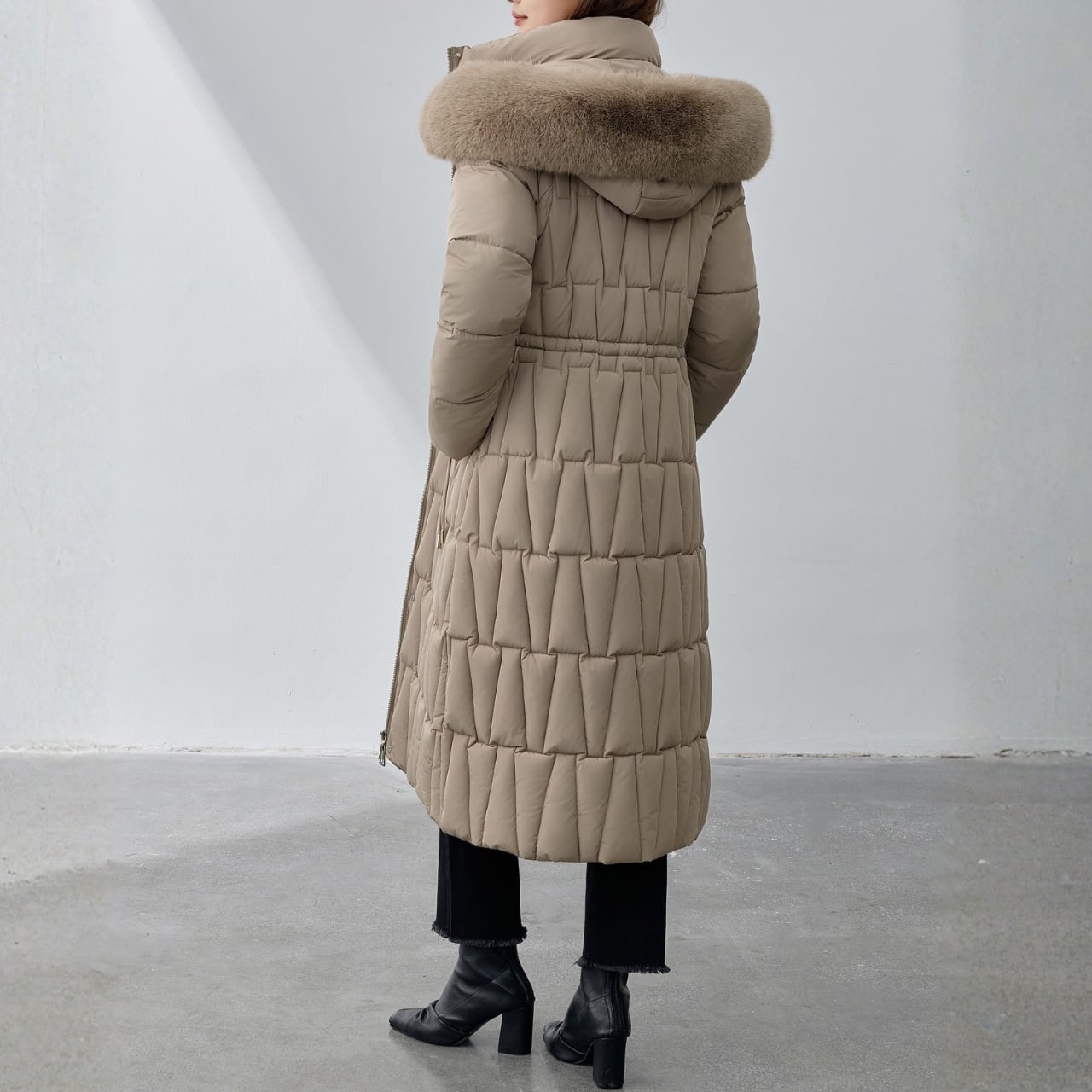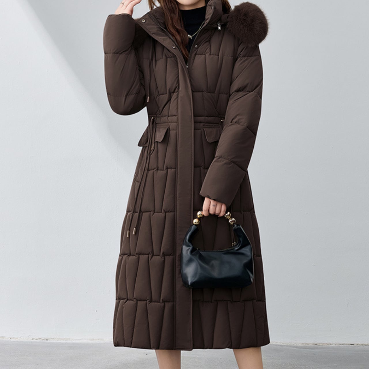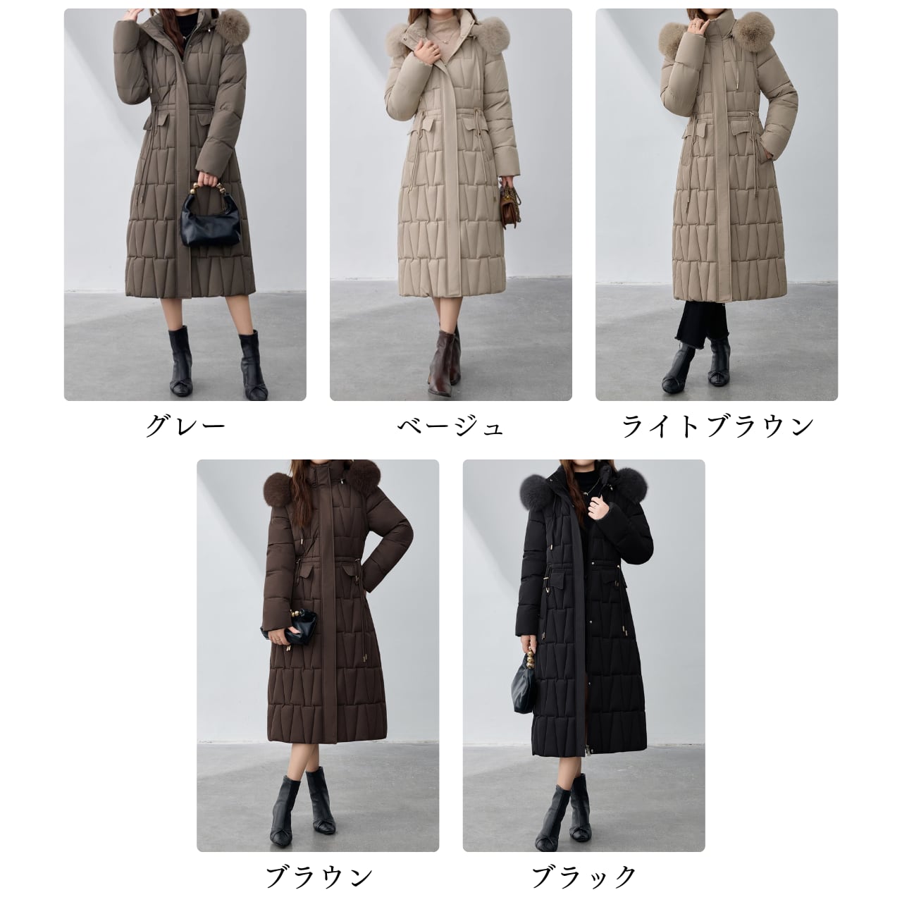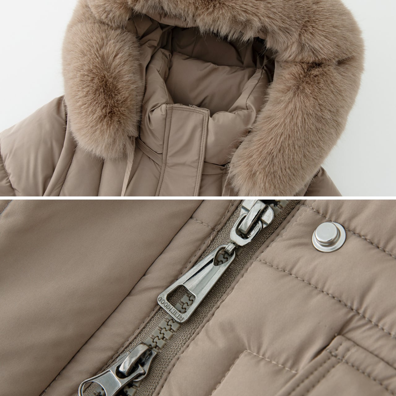 フードにあしらわれたファーが、顔周りを華やかに演出するダウンコートです。