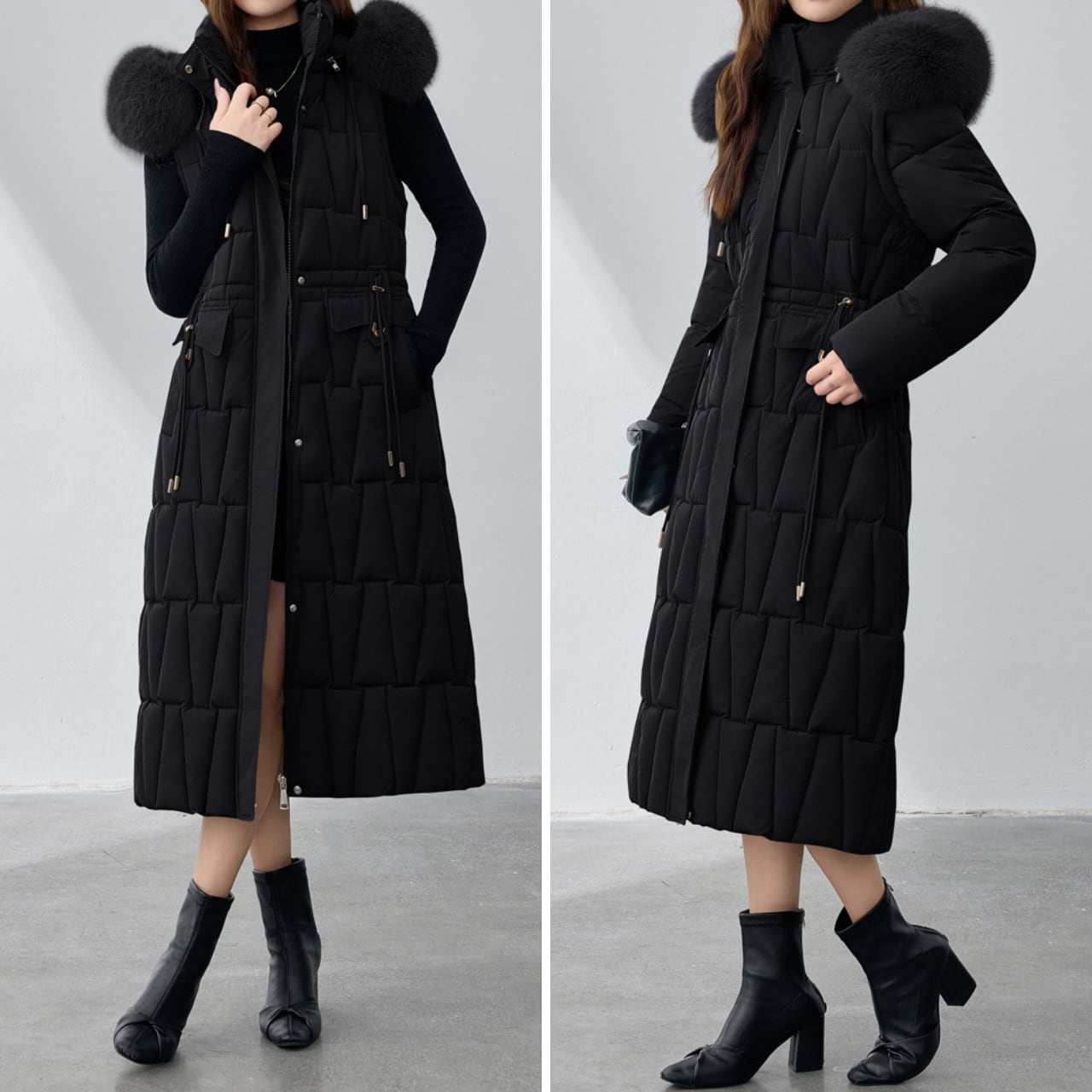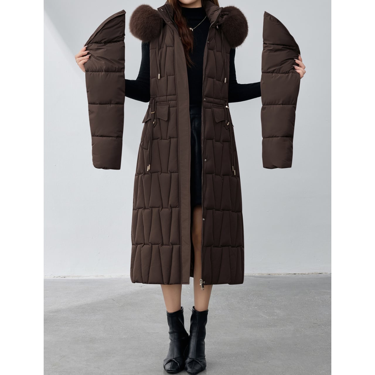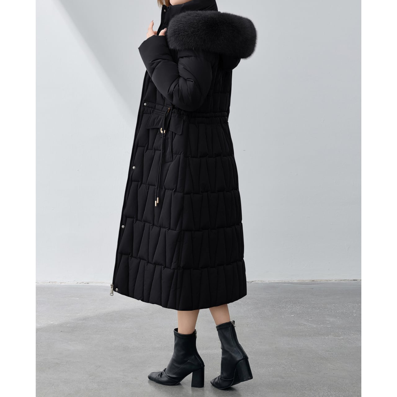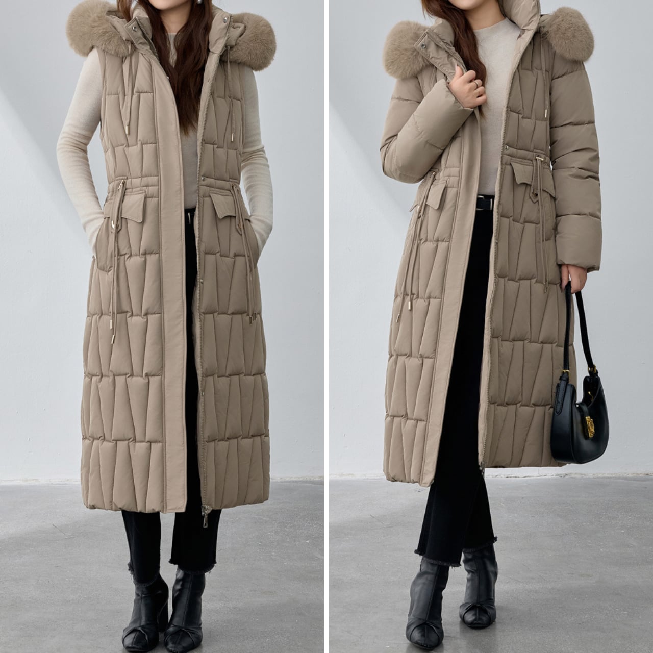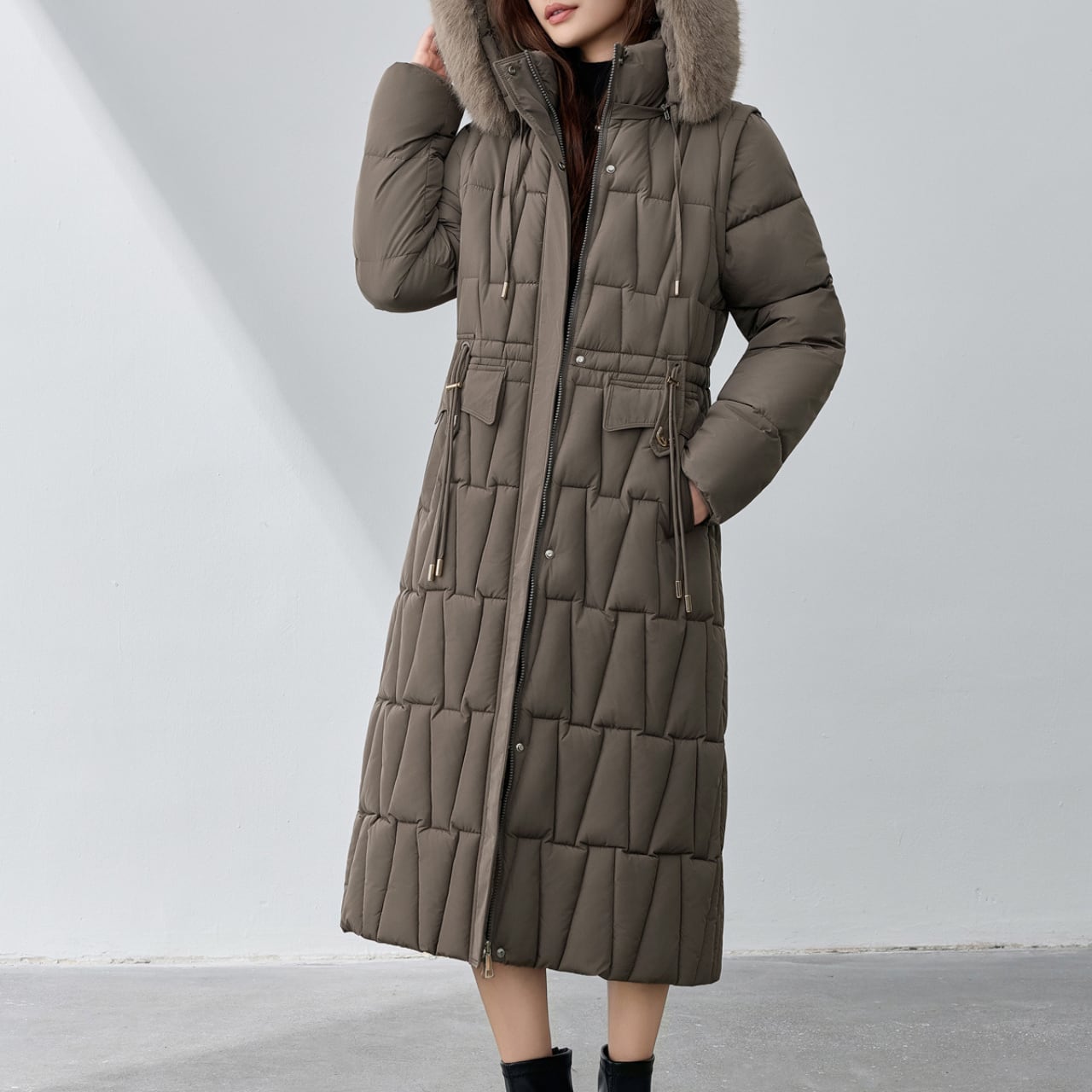フードにあしらわれたファーが、顔周りを華やかに演出するダウンコートです。