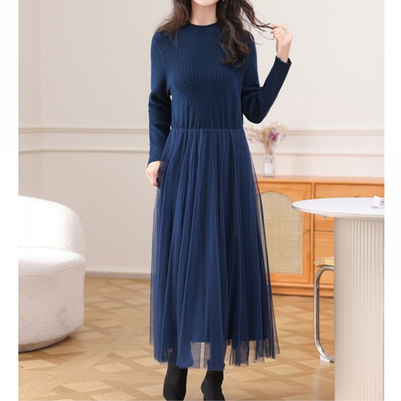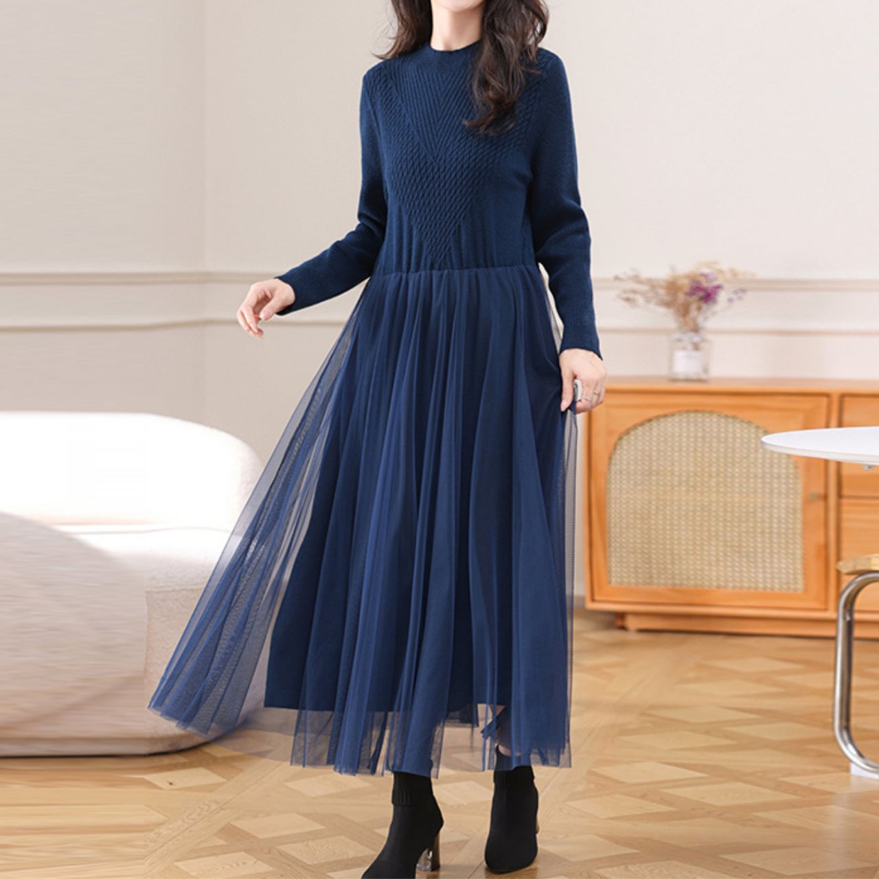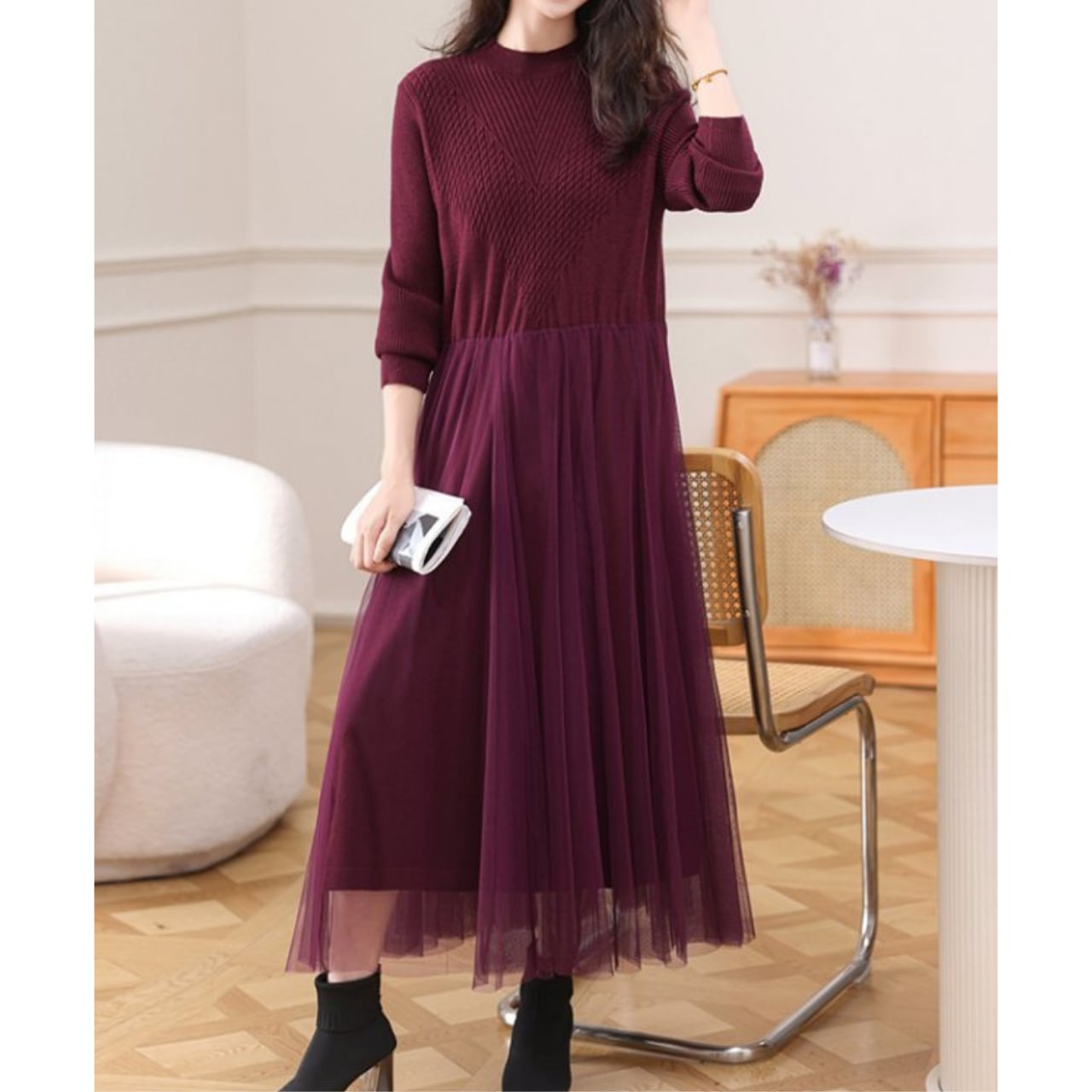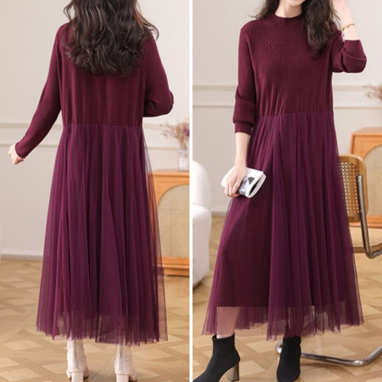 トップス部分のニットと、ふんわりとしたチュールスカートの組み合わせが、エレガントな印象を与えます。
