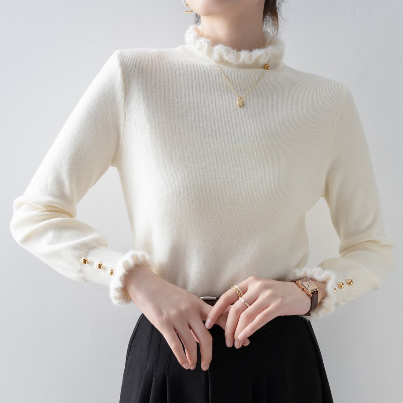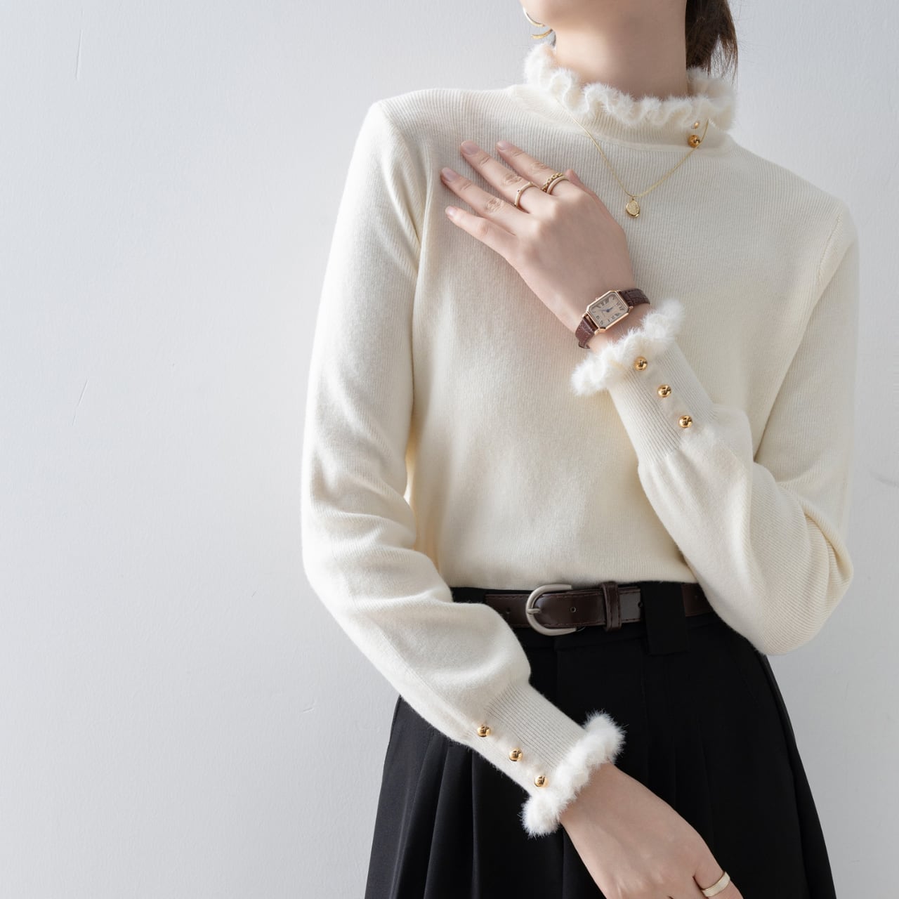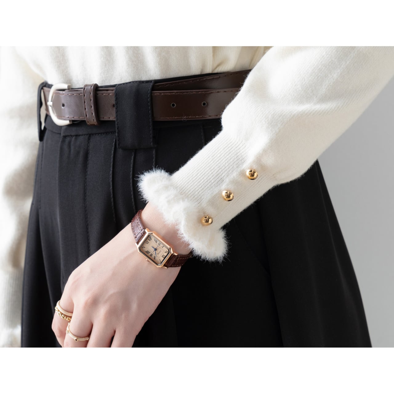 袖にあしらわれたゴールドのボタンが、さりげないアクセントになっています。