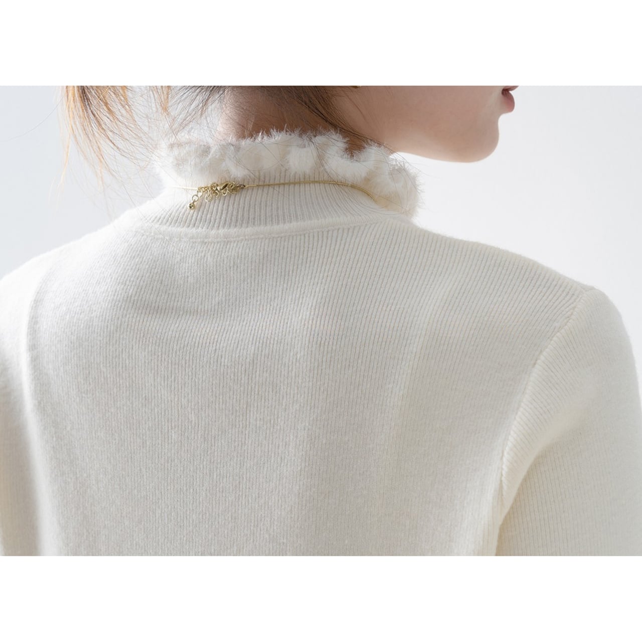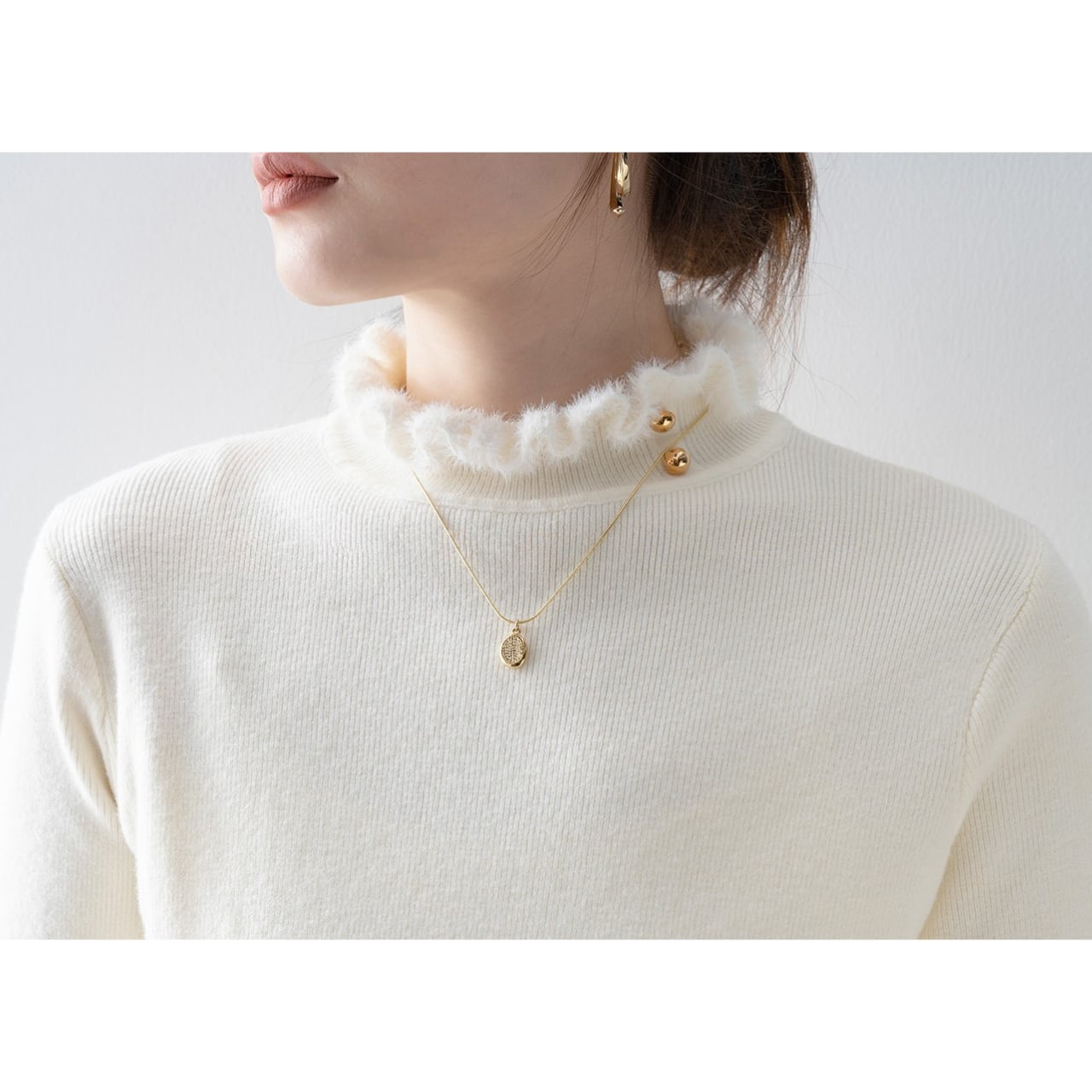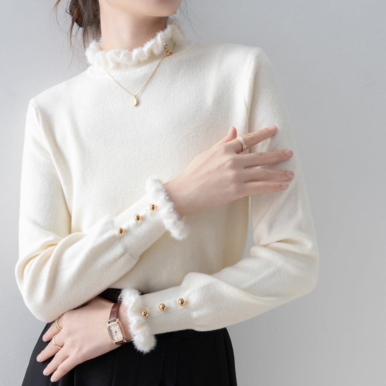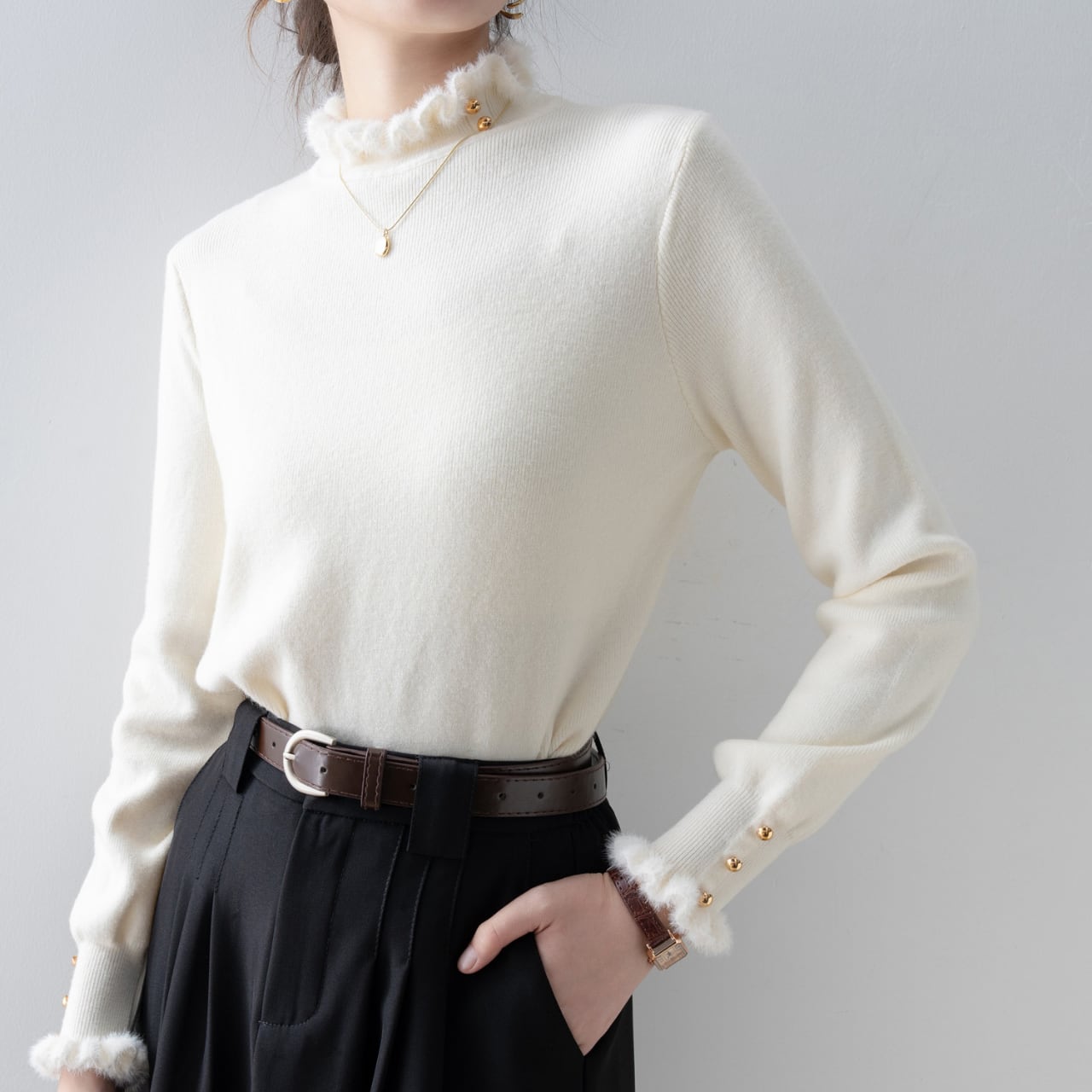 袖にあしらわれたゴールドのボタンが、さりげないアクセントになっています。