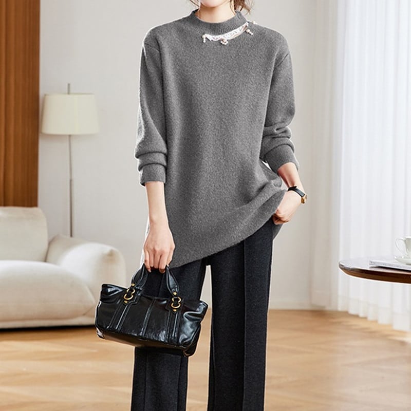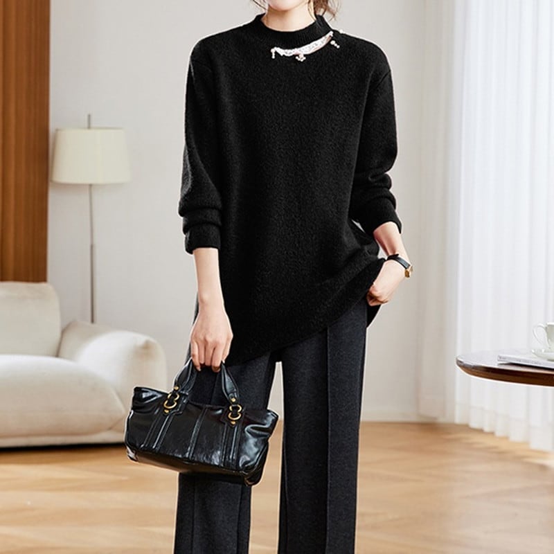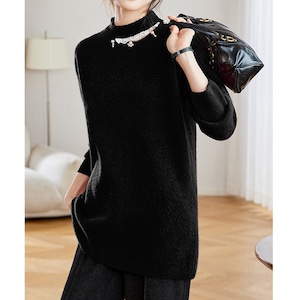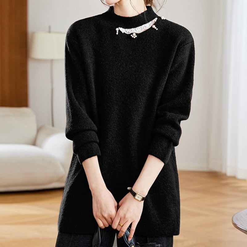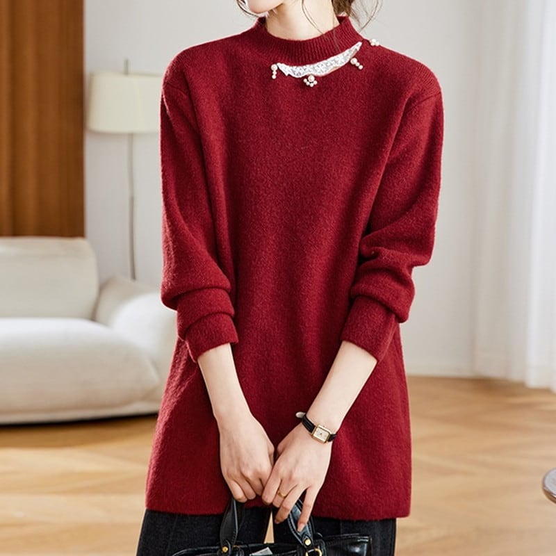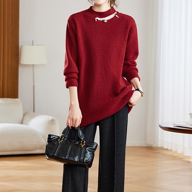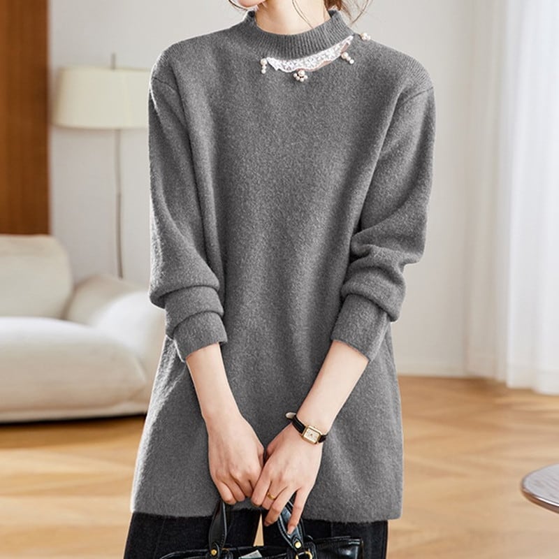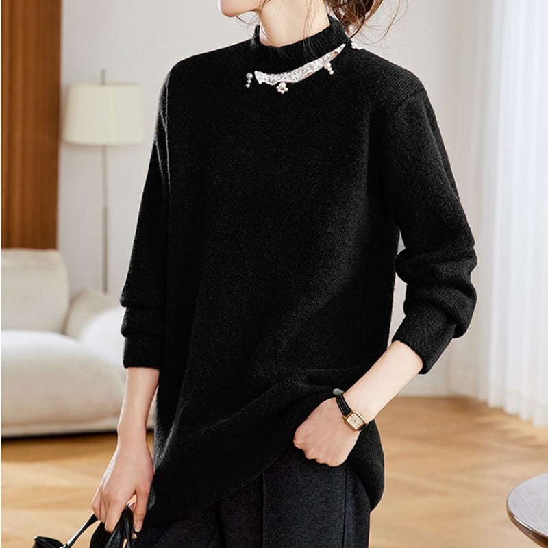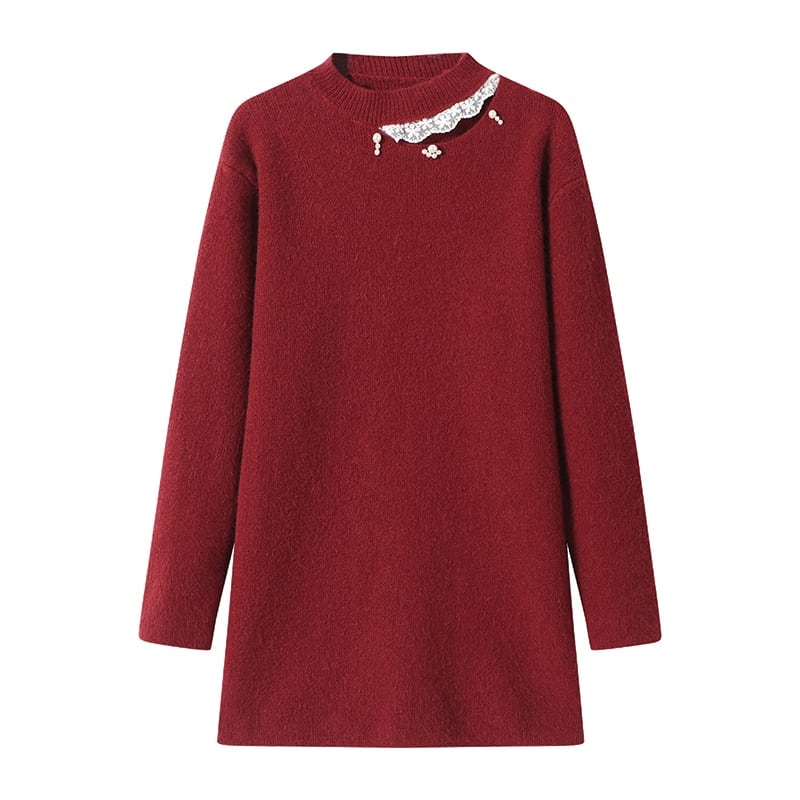 首元を上品に彩るパールとレースが愛らしい、ニットトップスです。