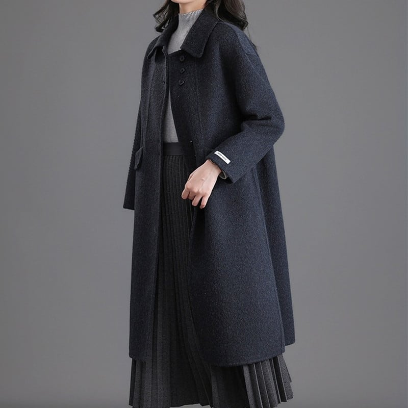 すっきりとしたステンカラーが大人の品を引き立てる、ロングコートです。