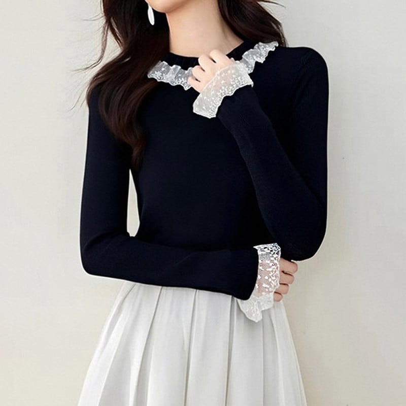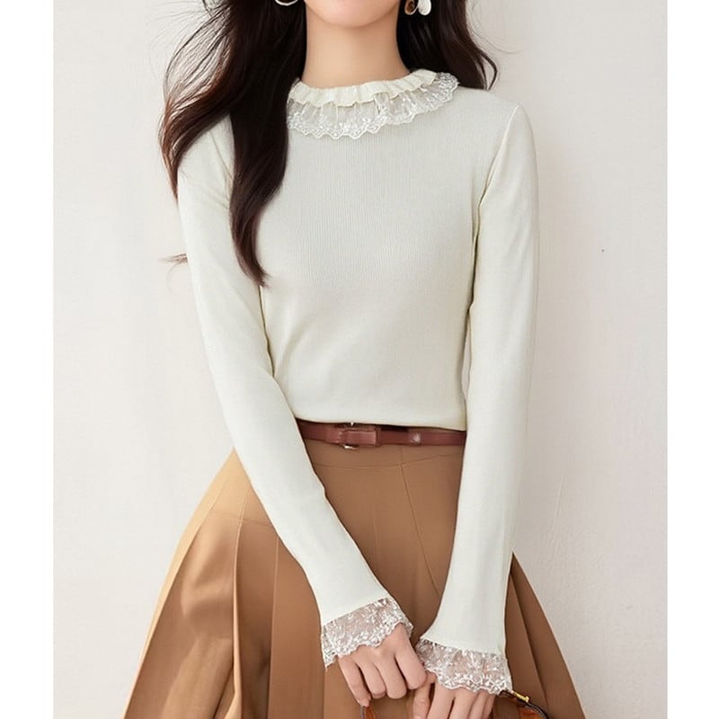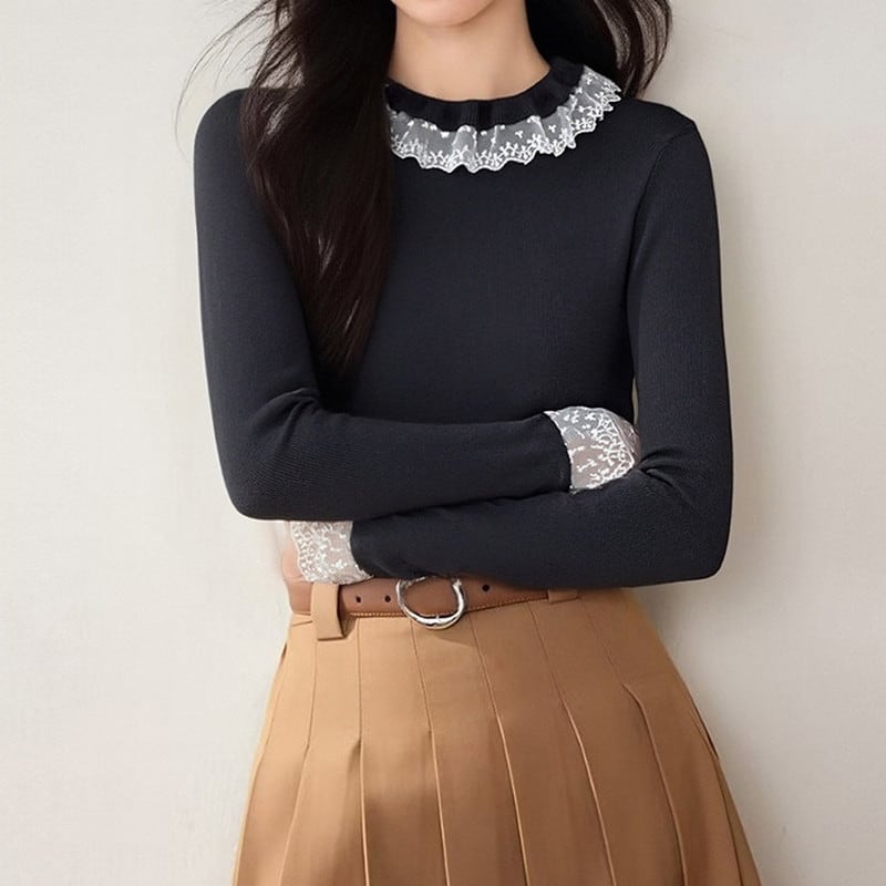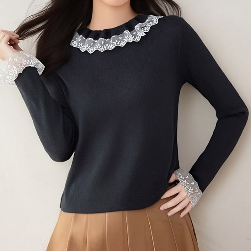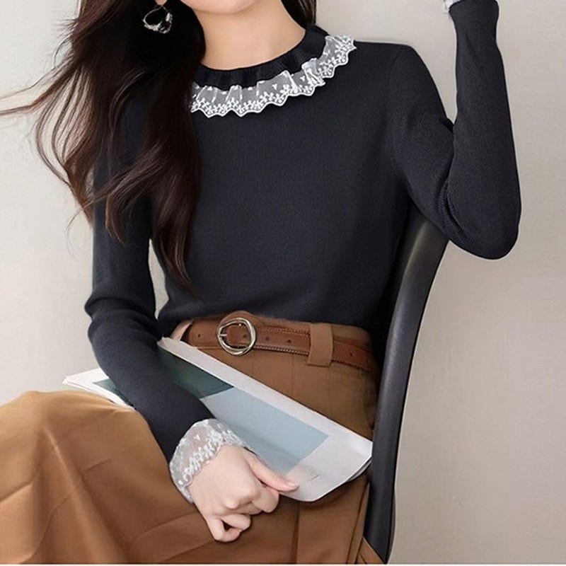 繊細なレース襟が顔まわりをやさしく彩る、上品なニットトップスです。