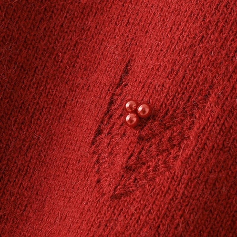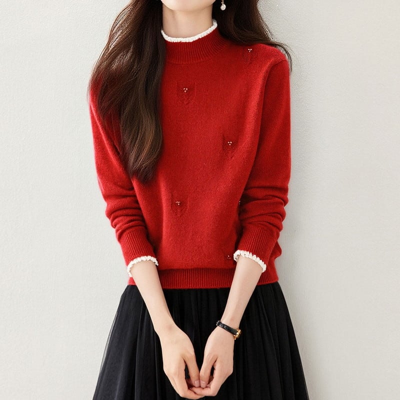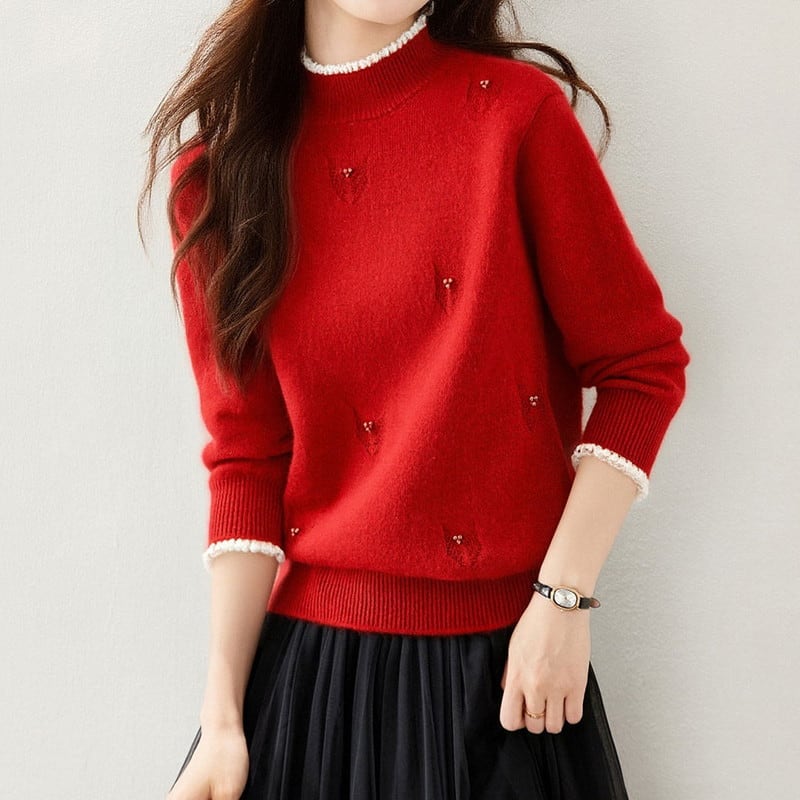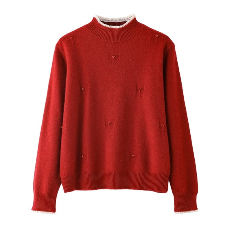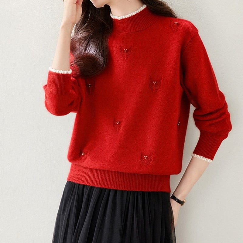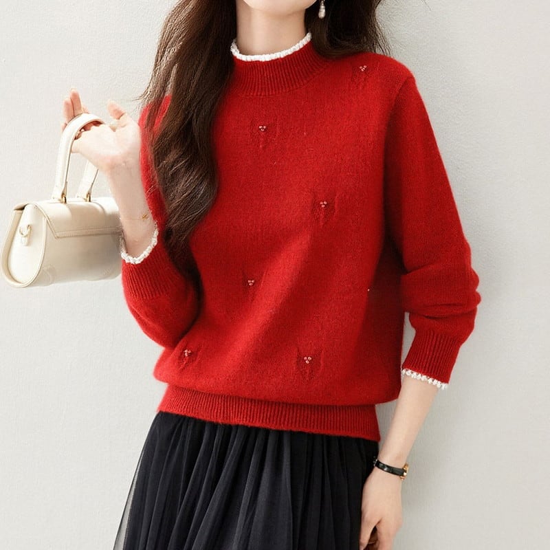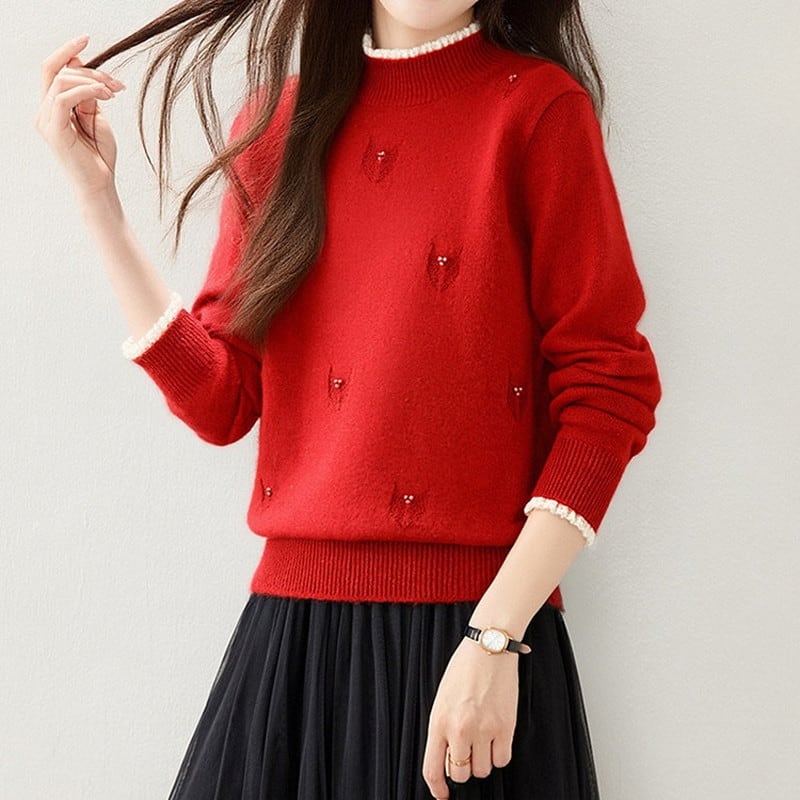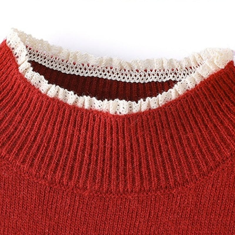 首元と袖口のレースがやさしく映える、上品なニットトップスです。