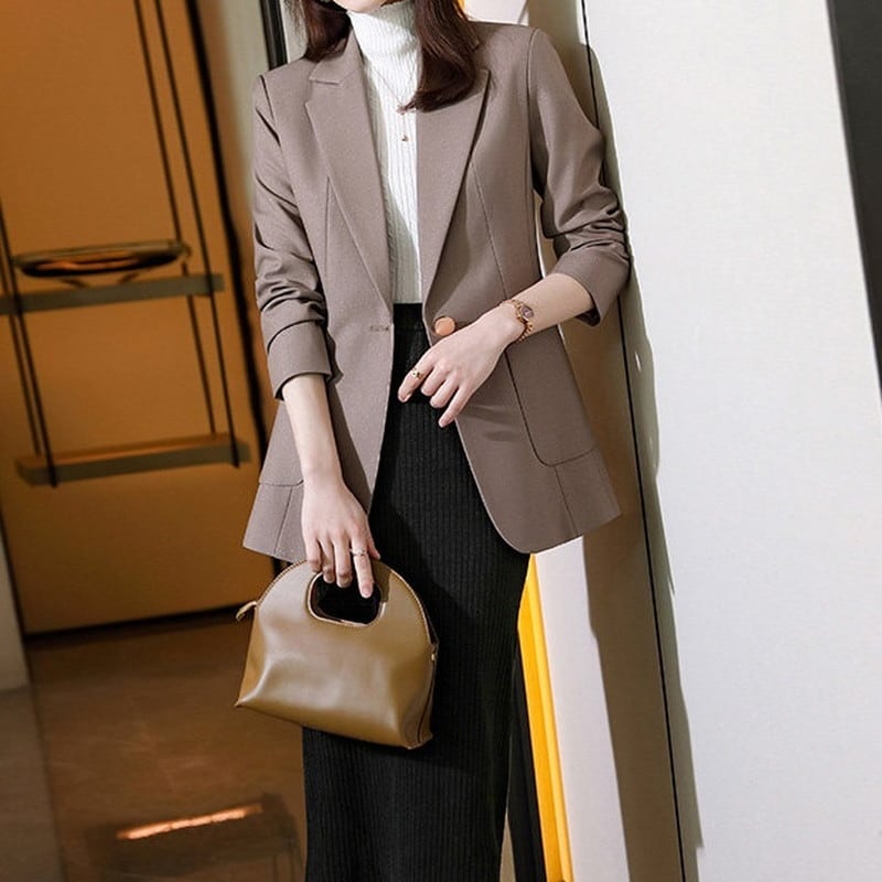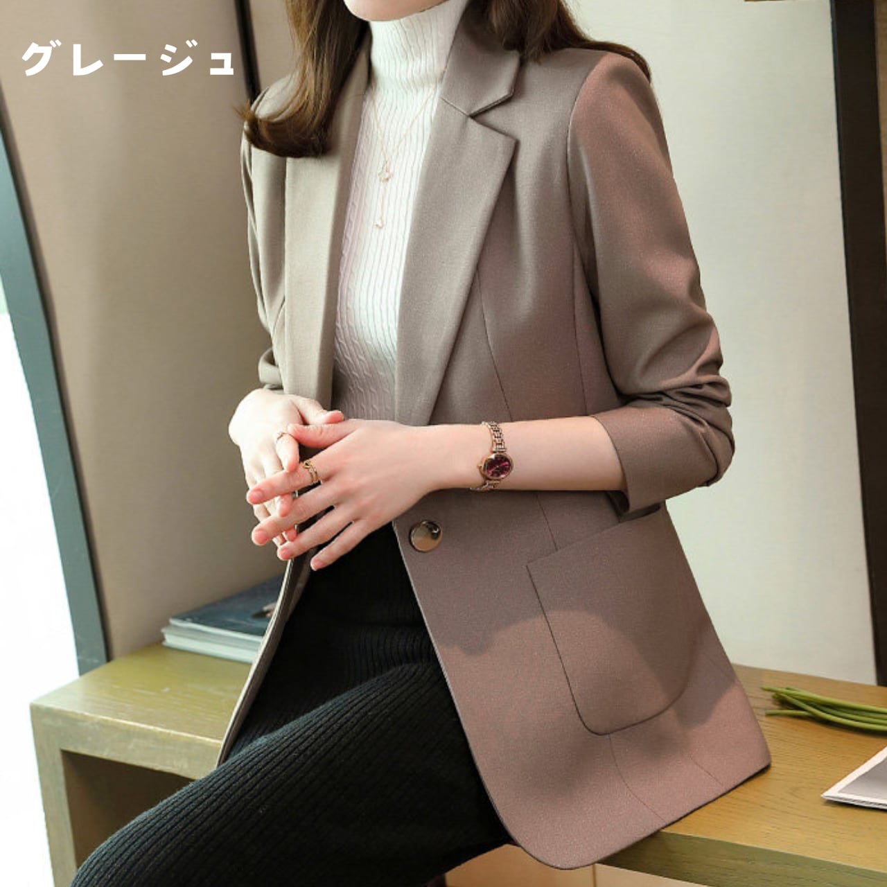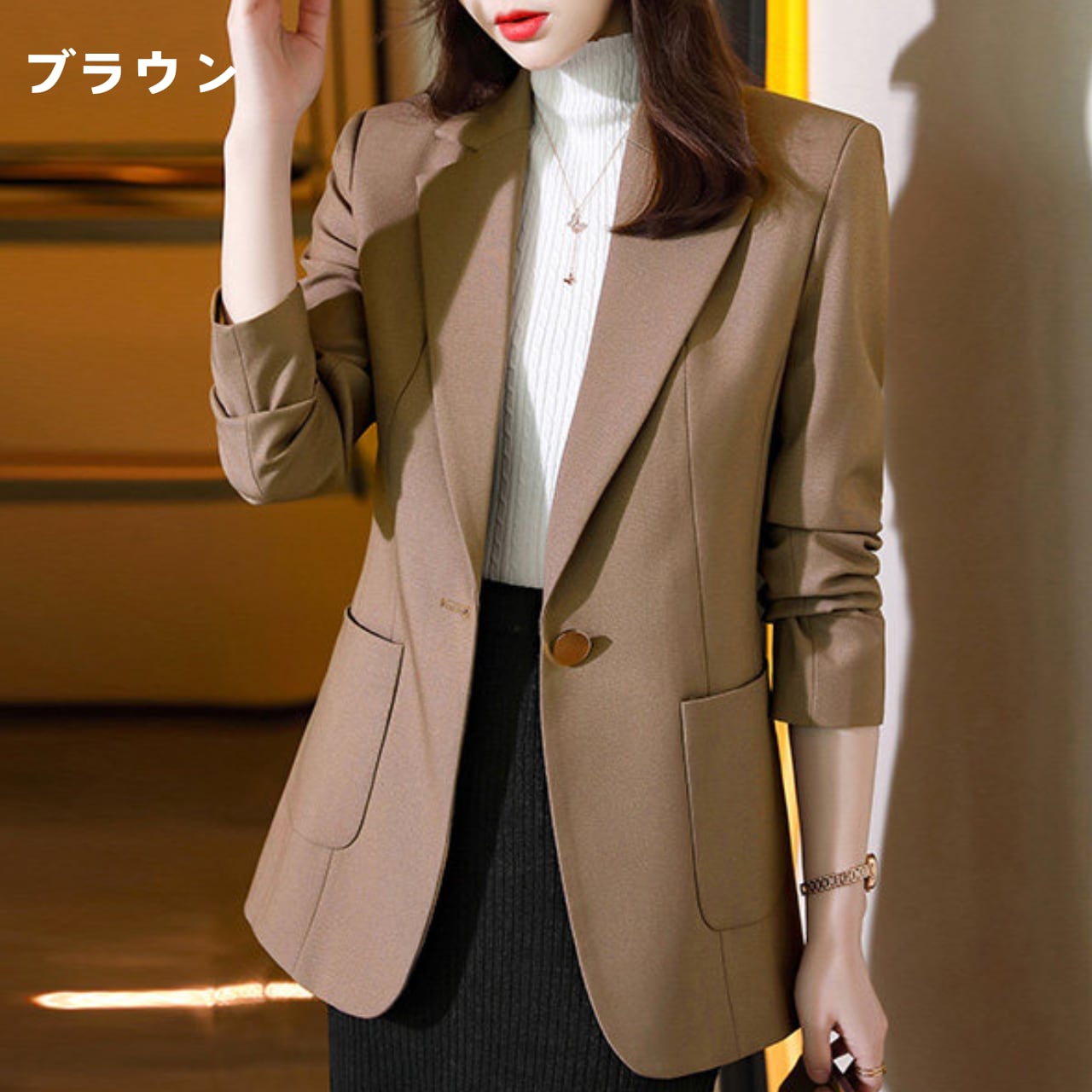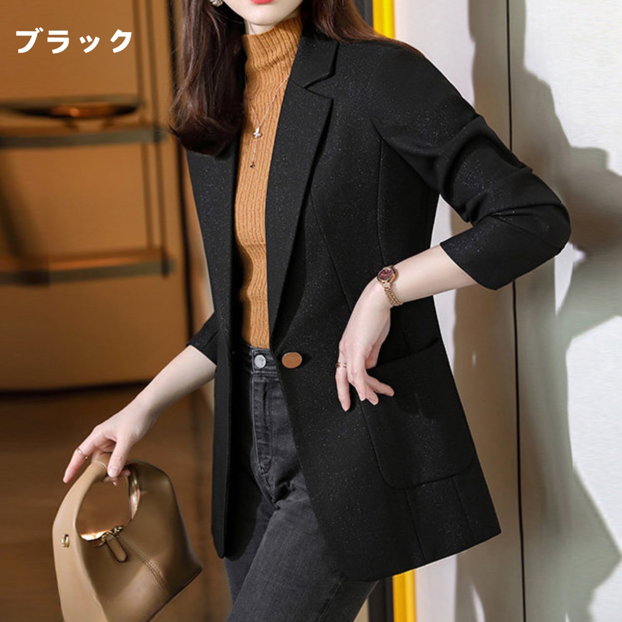 オフィスシーンの羽織りとしてはもちろん、デニムと合わせた大人のカジュアルダウンにも幅広く重宝する一着です。