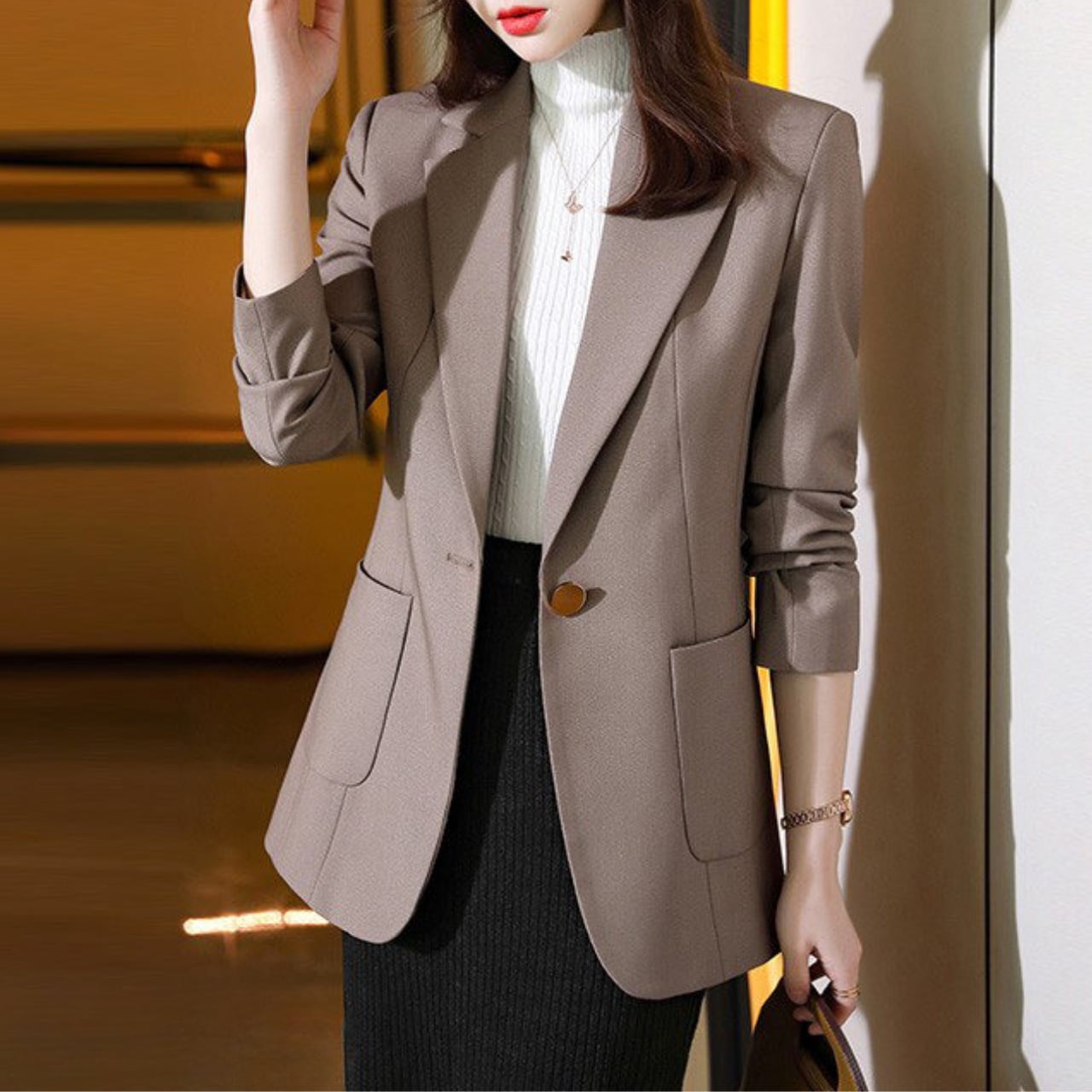 洗練されたシャープな襟元と、美しくシェイプされたウエストラインが都会的なシルエットを演出してくれます。