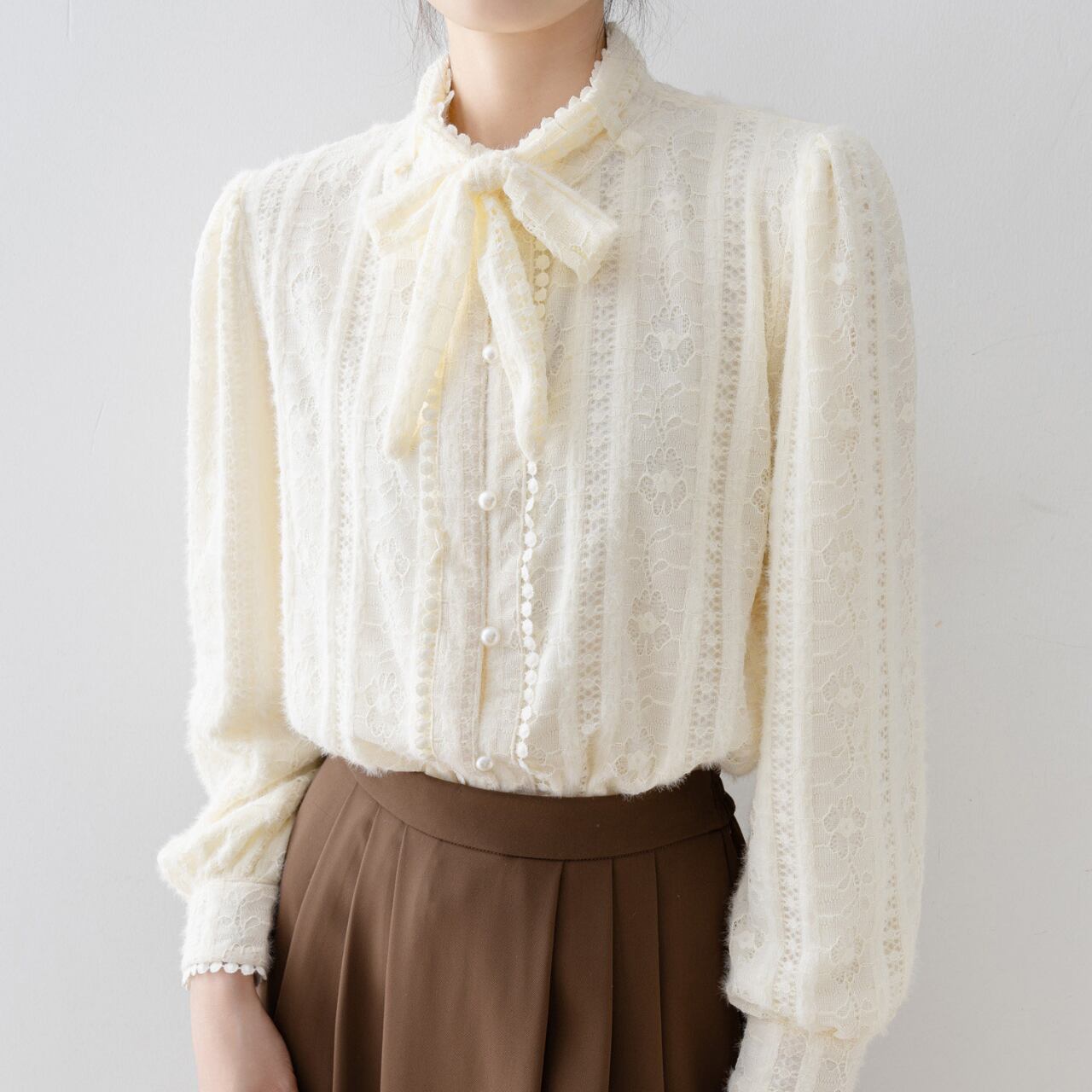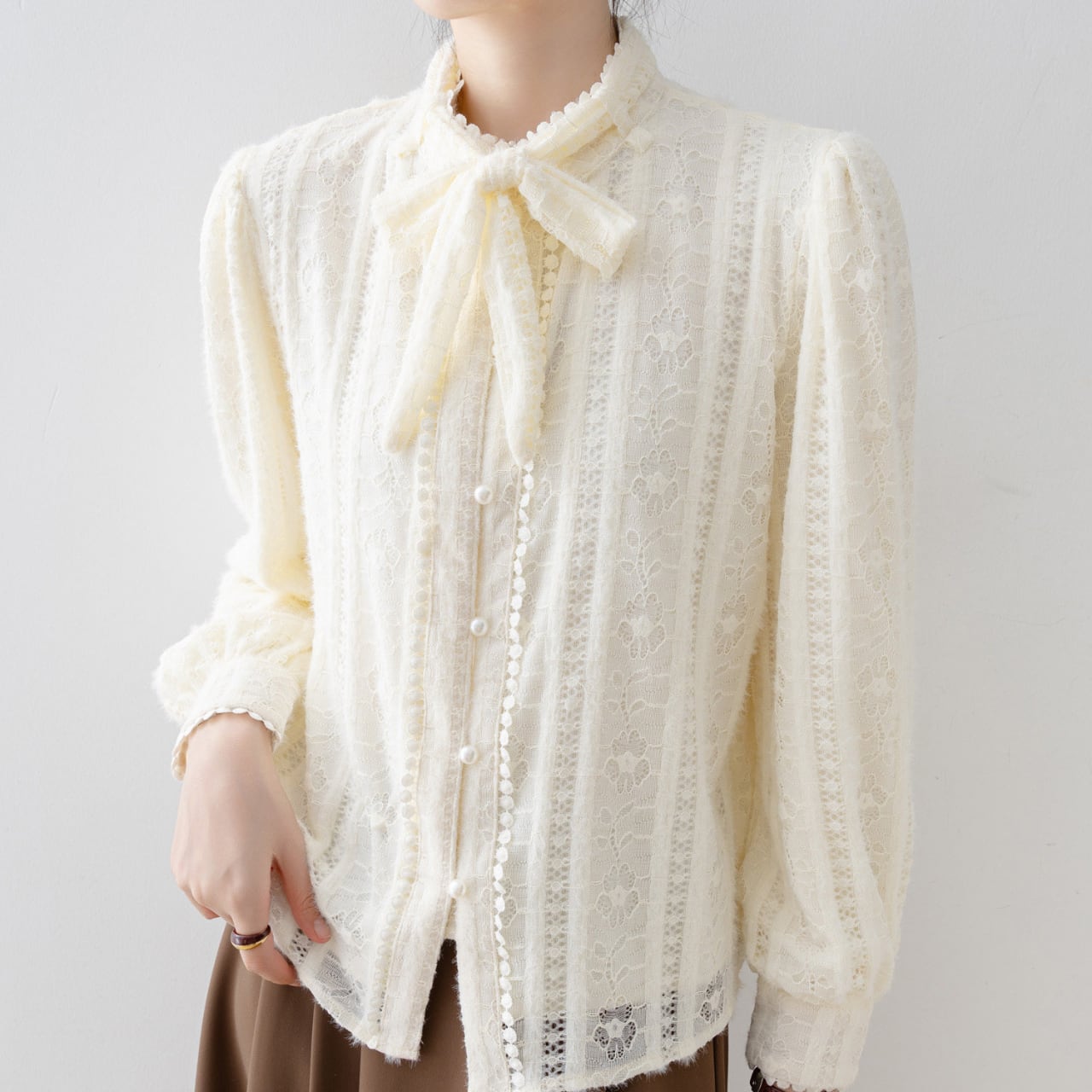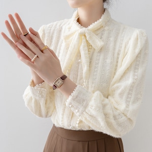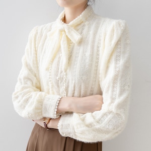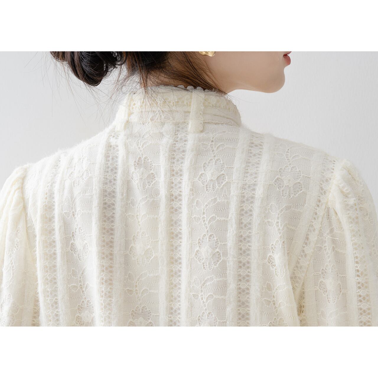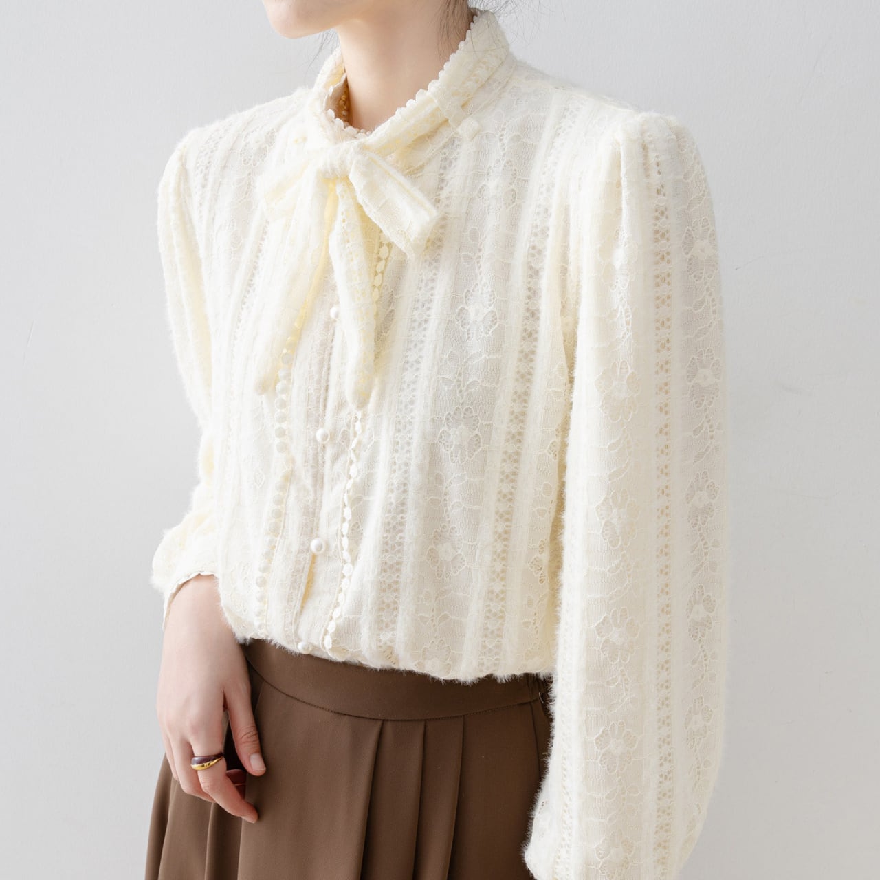 フラワーモチーフのレースが上品な印象を与えるブラウスです。