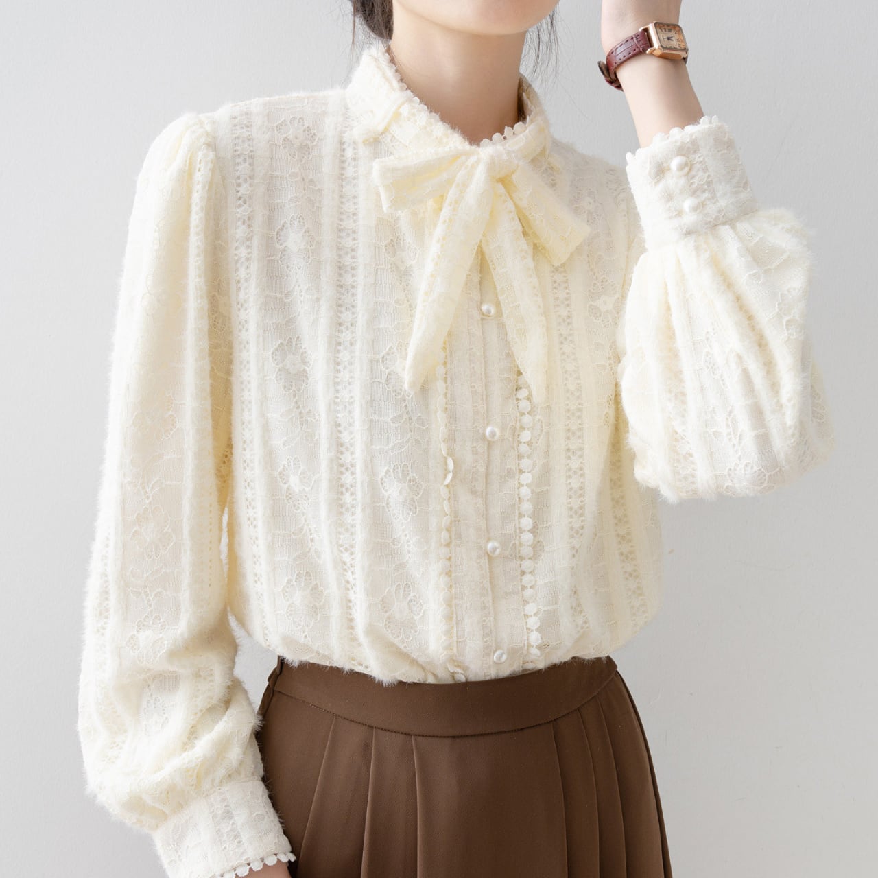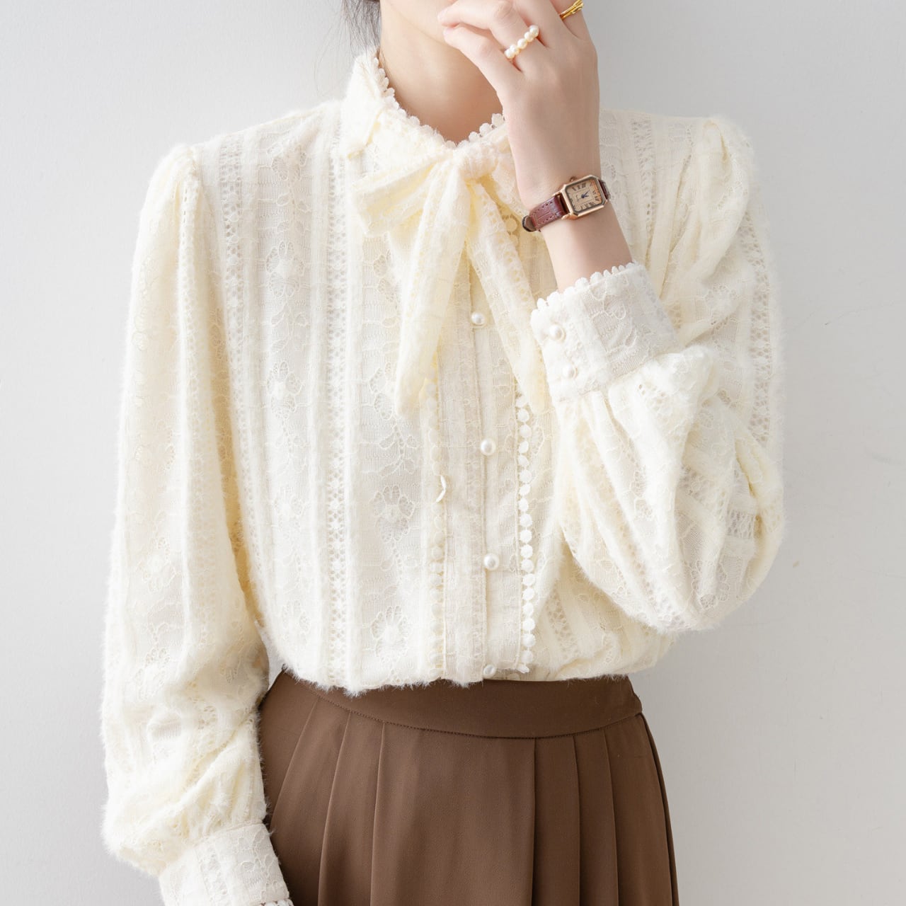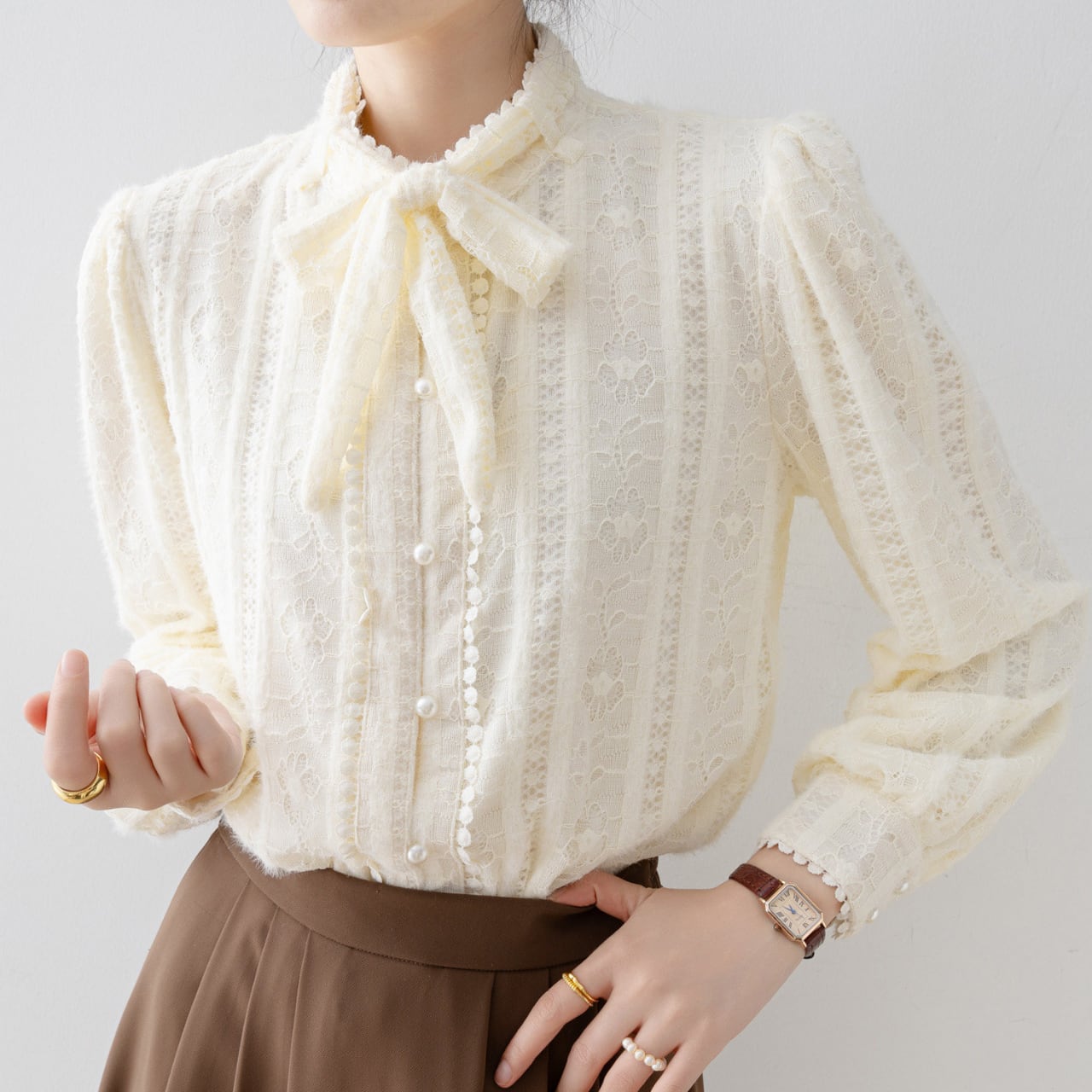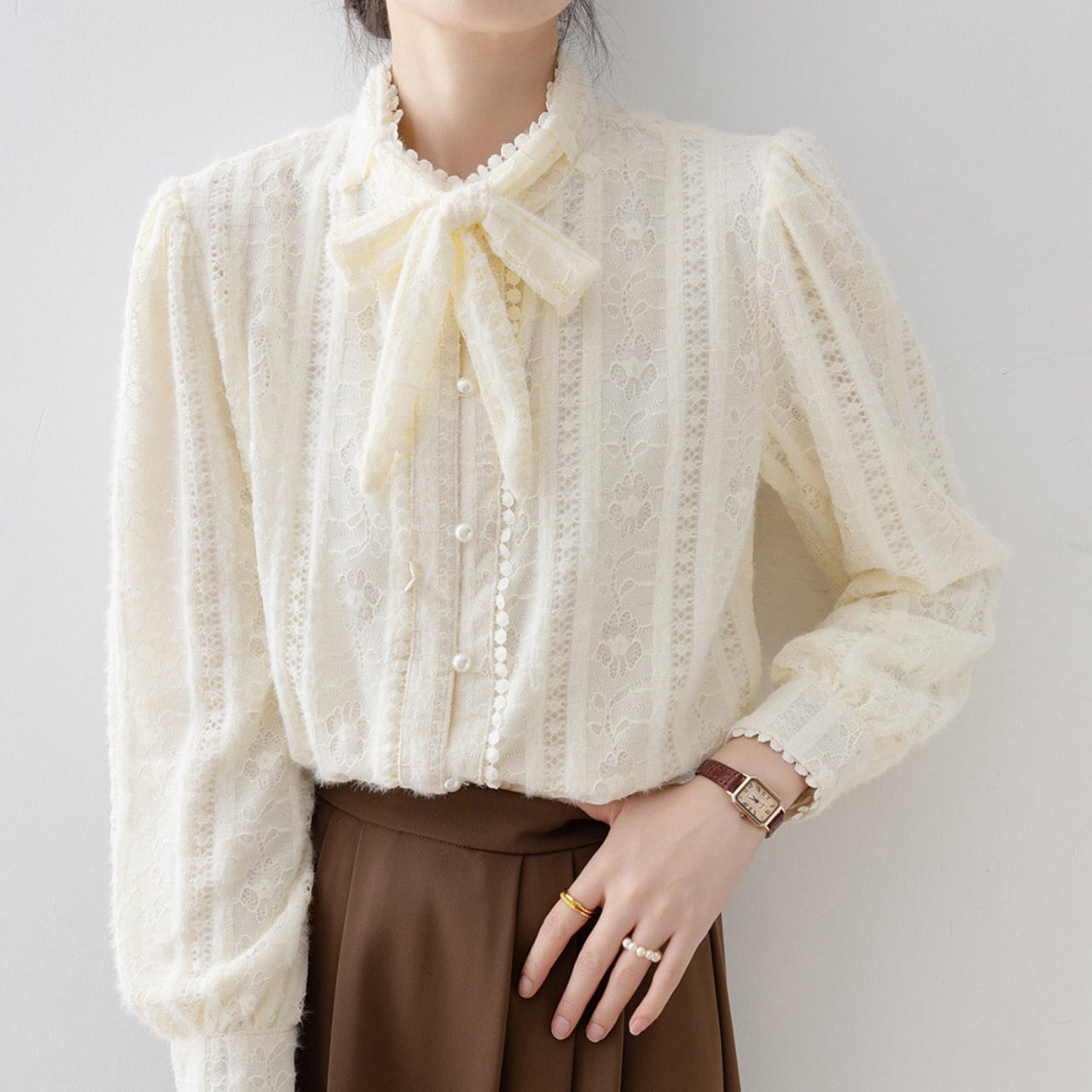 フラワーモチーフのレースが上品な印象を与えるブラウスです。