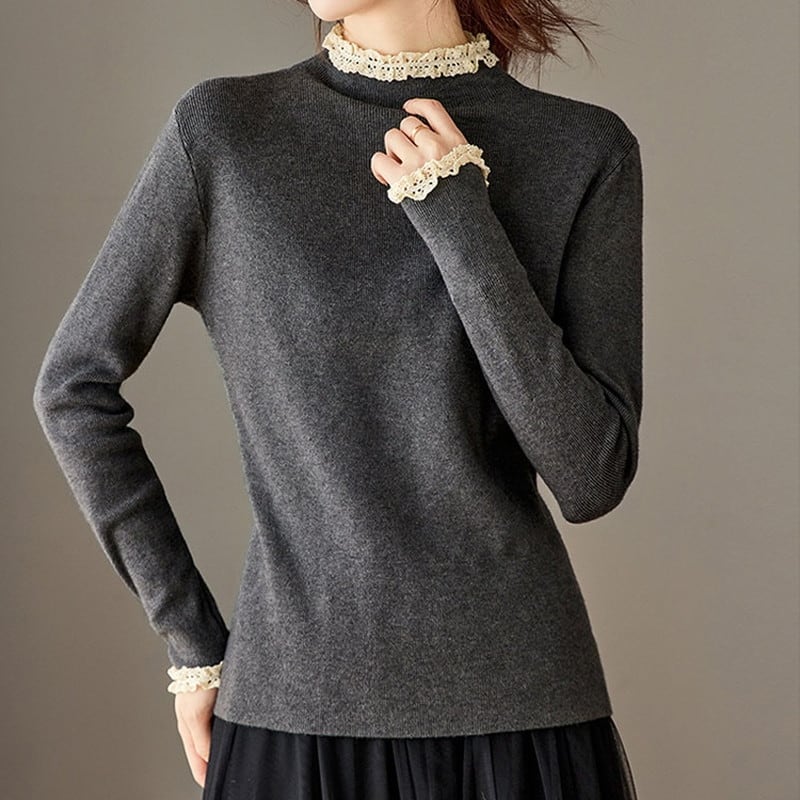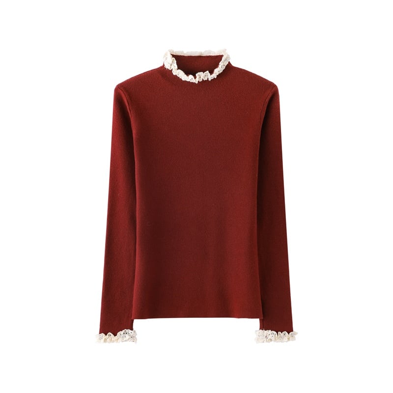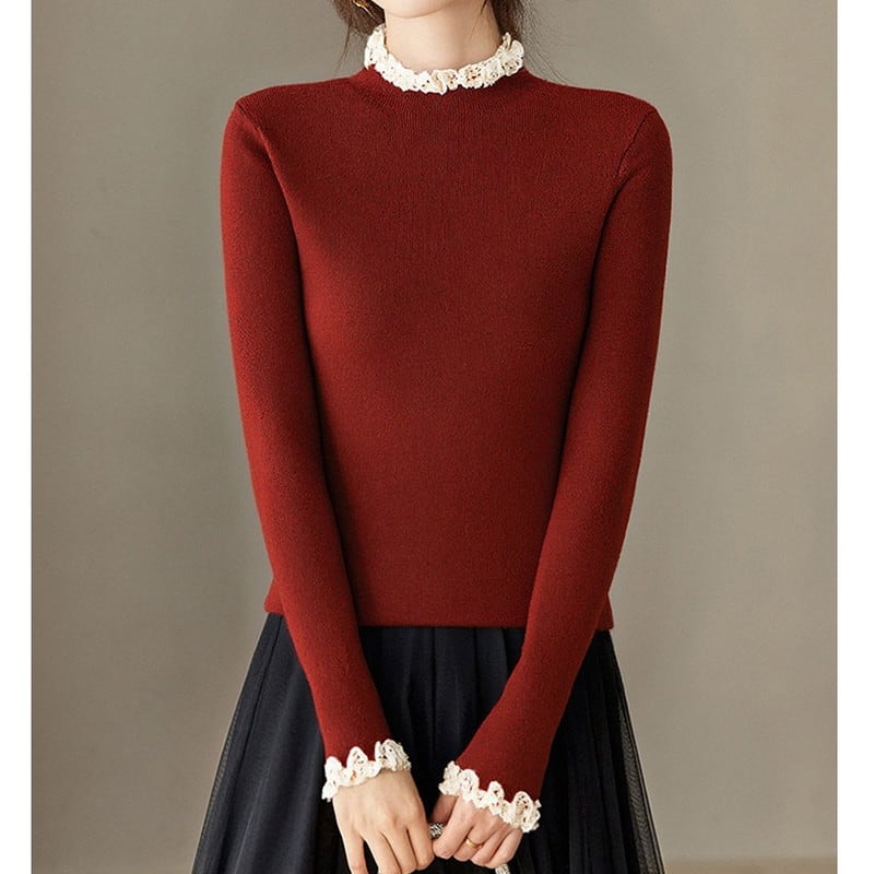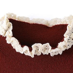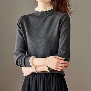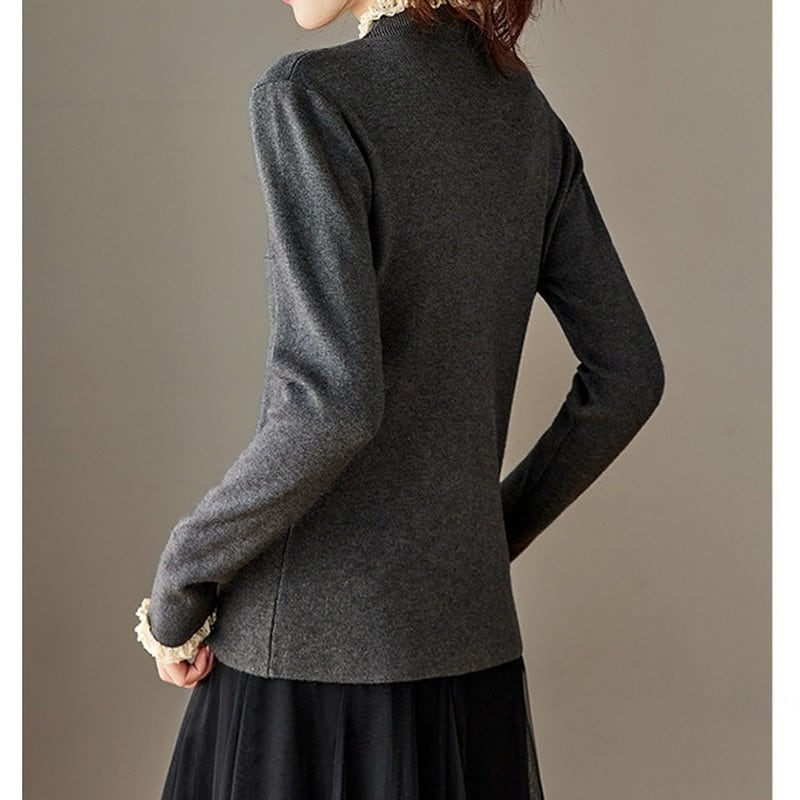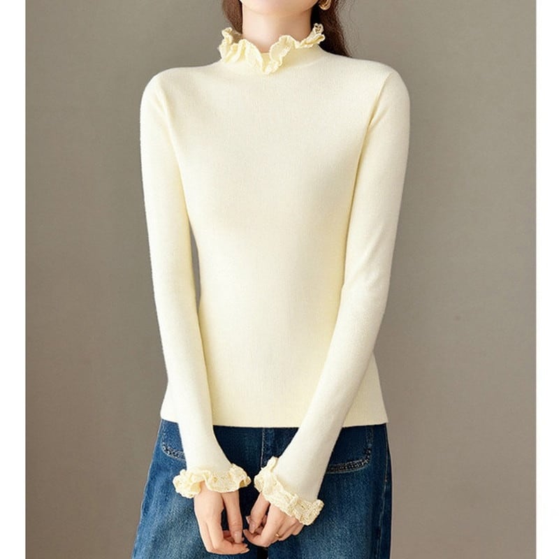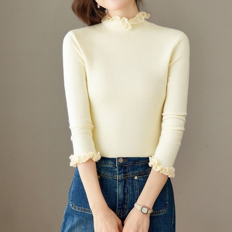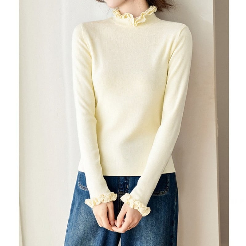首元と袖口のフリルが甘さを添えるリブニットトップスです。