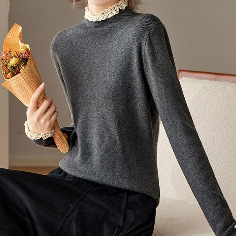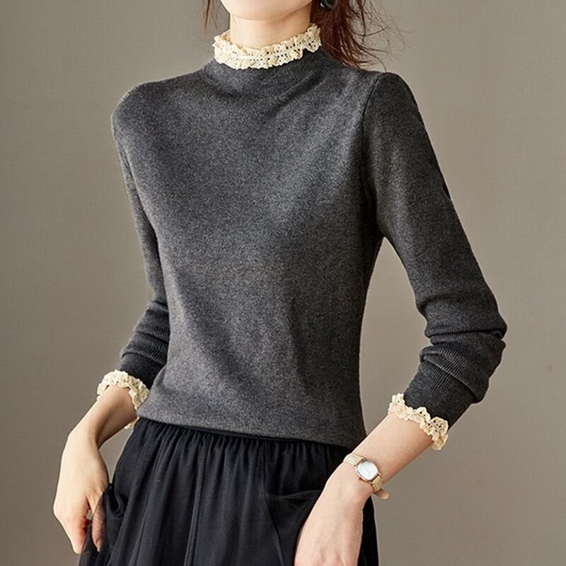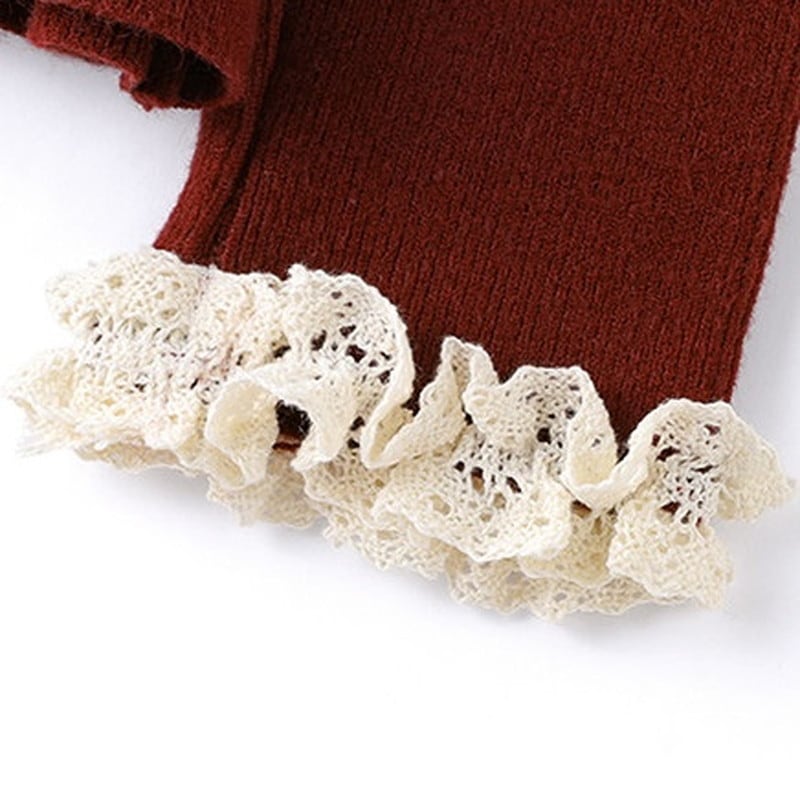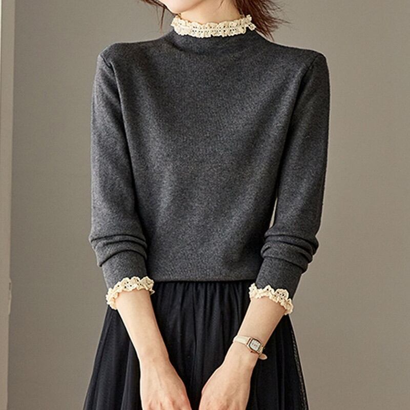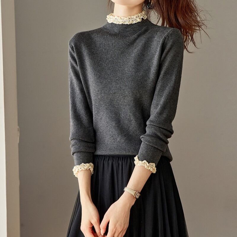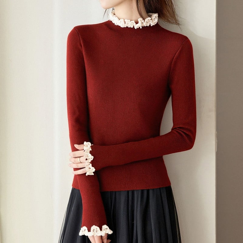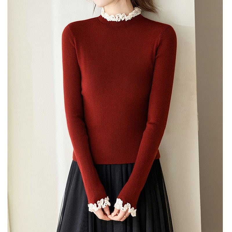 首元と袖口のフリルが甘さを添えるリブニットトップスです。