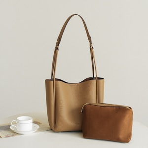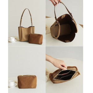 付属のポーチで小物をスマートに整理できるほか、持ち手の長さを変えることで肩掛けや手提げなどシーンに合わせた使い分けが可能。