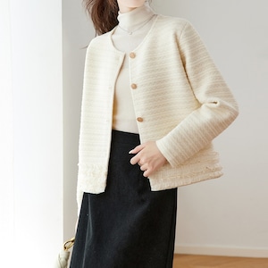 裾のフリルが可愛らしさと上品な印象を与えるジャケットです。