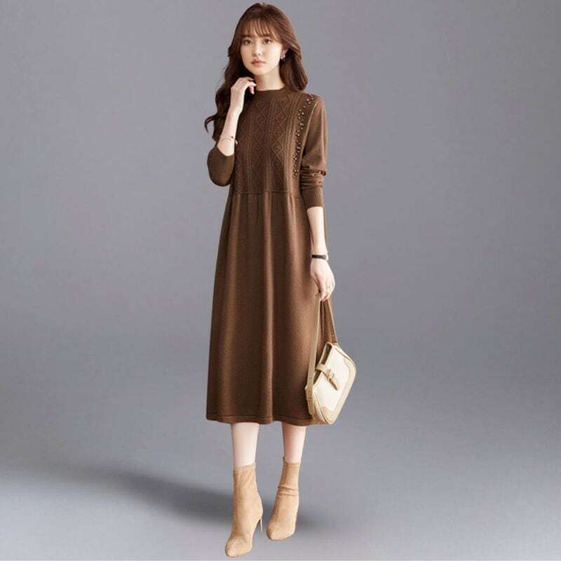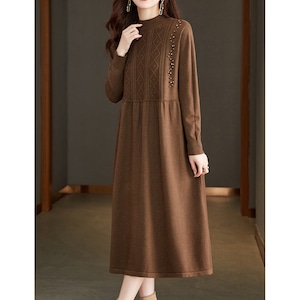 細かめのケーブル編みと、同色のパールが上品な印象のニットワンピースです。