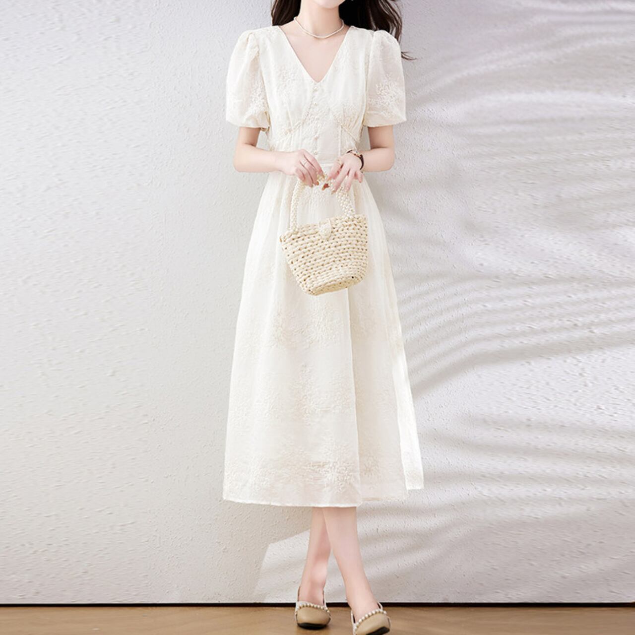 全面に施されたフラワー刺繍が、華やかさと気品を添えるワンピースです。