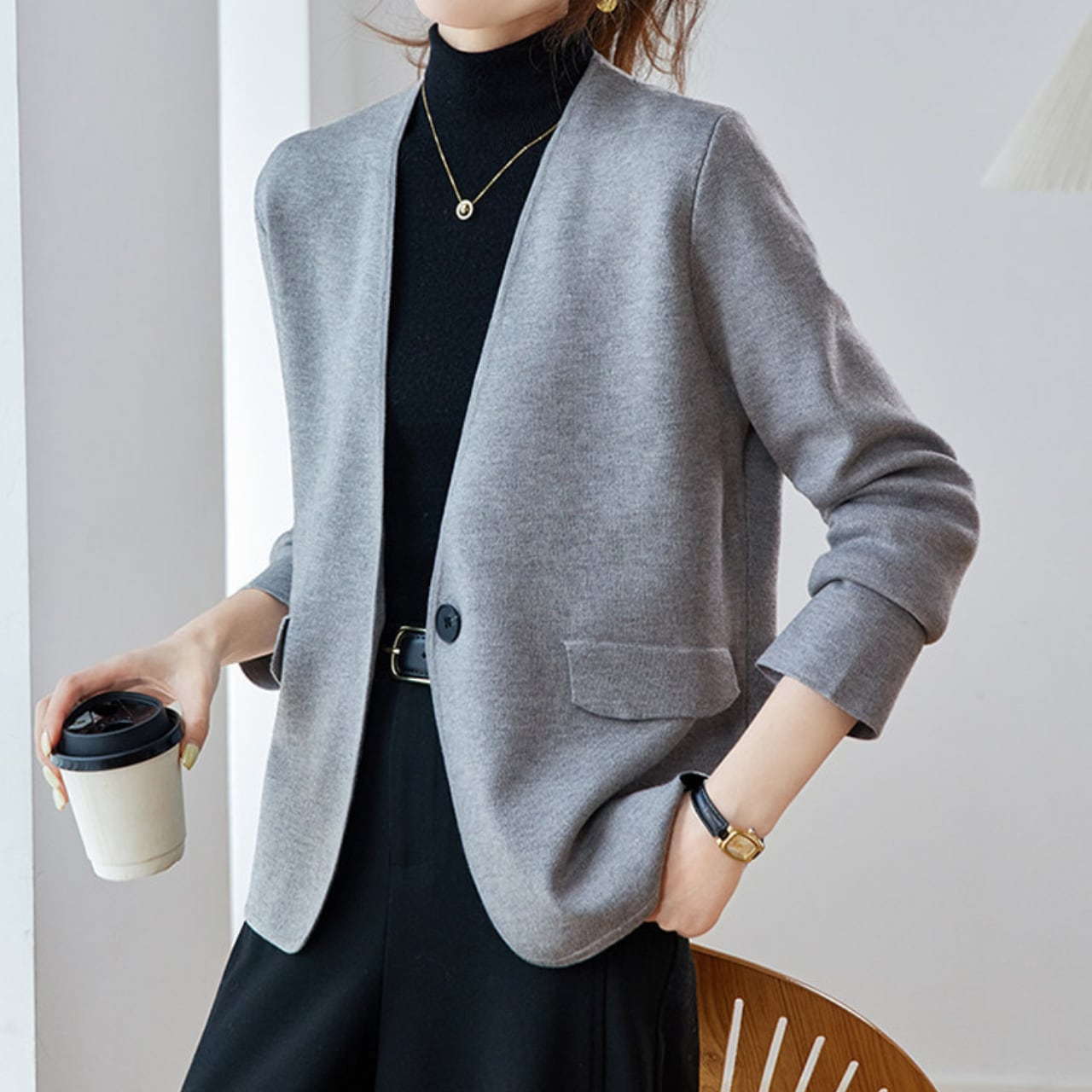 ジャケット風のデザインなので、きちんと感がありながらも、気軽に羽織れるのが魅力。