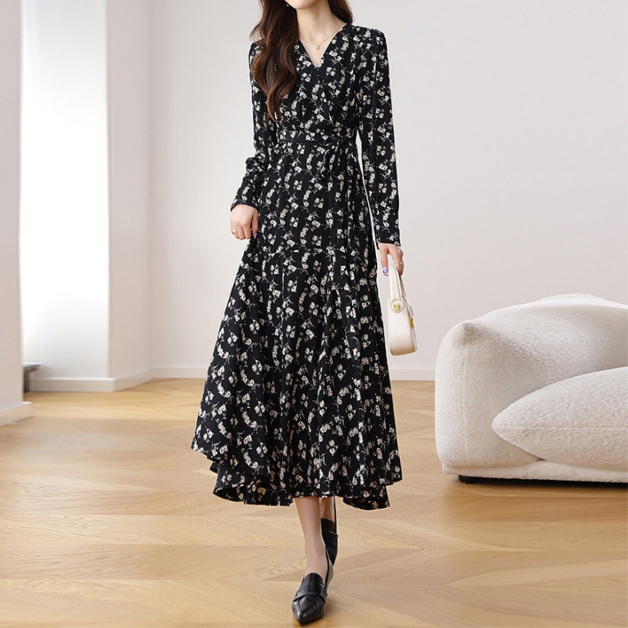 落ち着いた色合いの花柄が大人可愛さを演出。