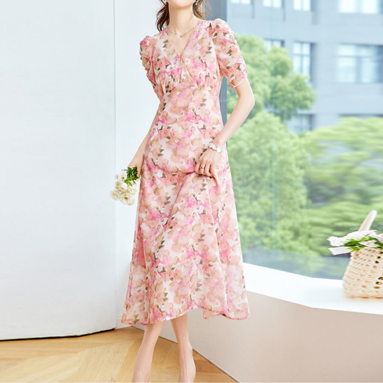 Vネックと花柄が、大人の女性らしさを引き立てます。