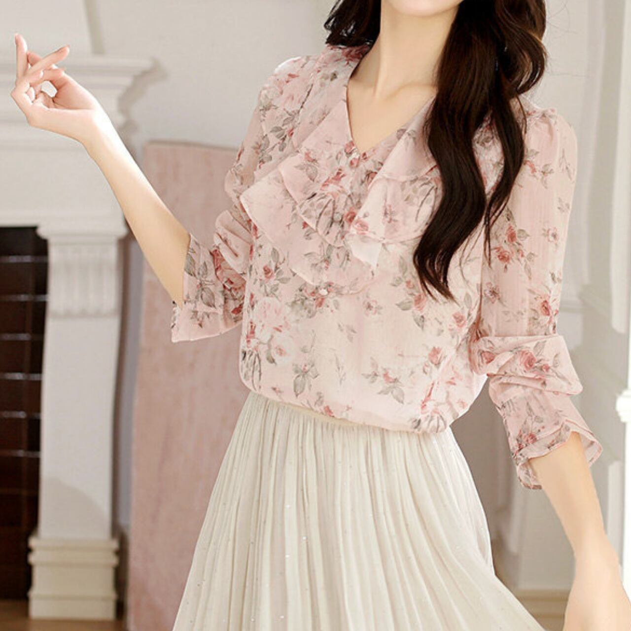 フリルネックフラワープリントブラウス Me1772