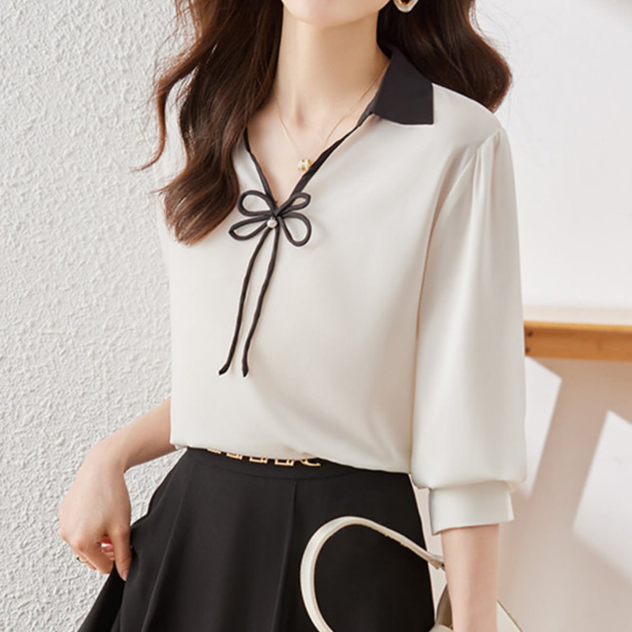 リボンタイがアクセントになった、上品な印象のブラウスです。