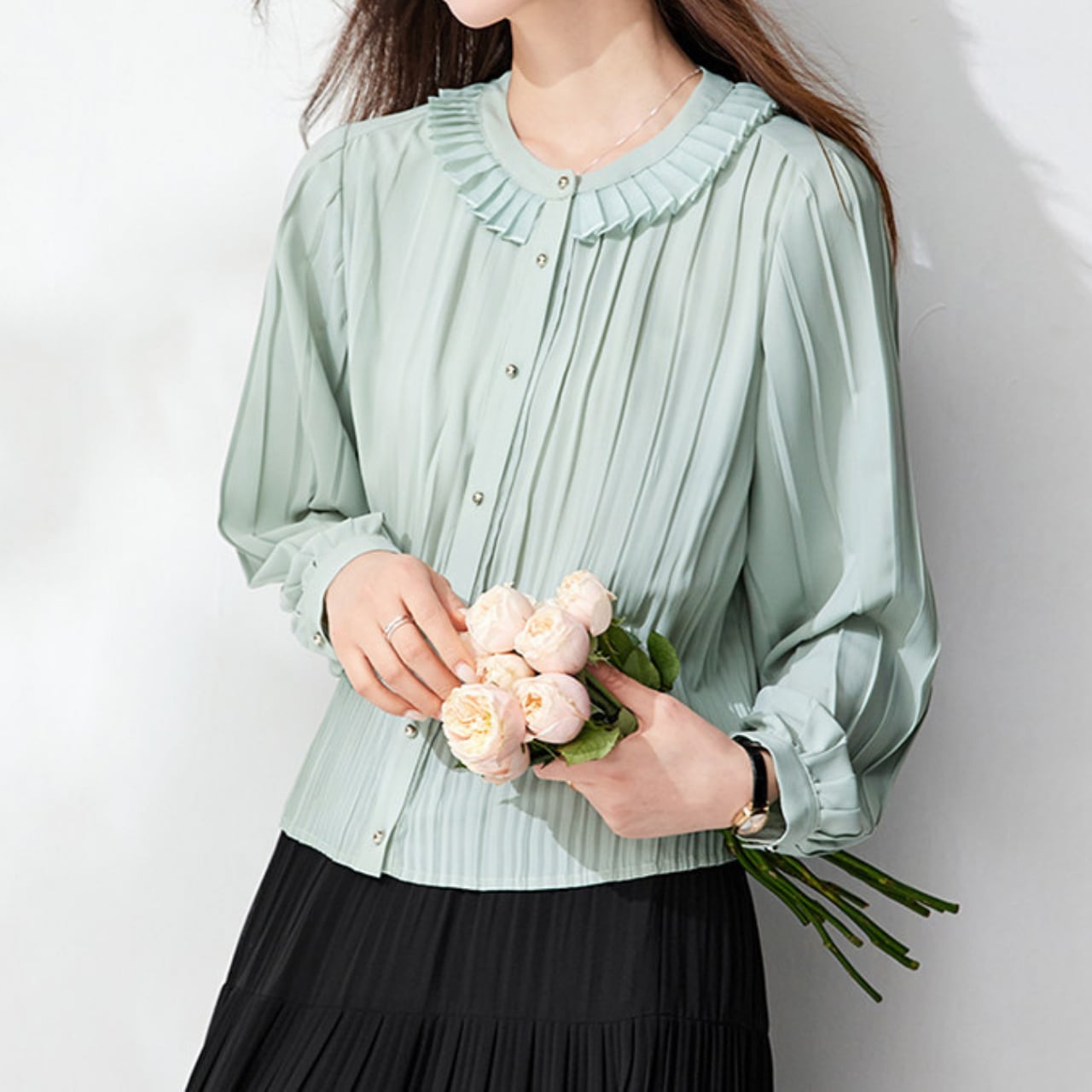 繊細なプリーツとフリル襟が特徴的なブラウスです。