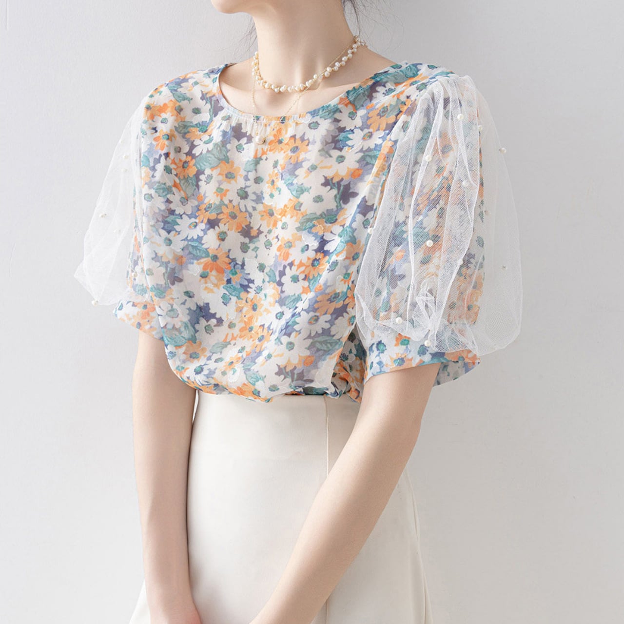 パール付きメッシュスリーブ花柄トップス Me1809