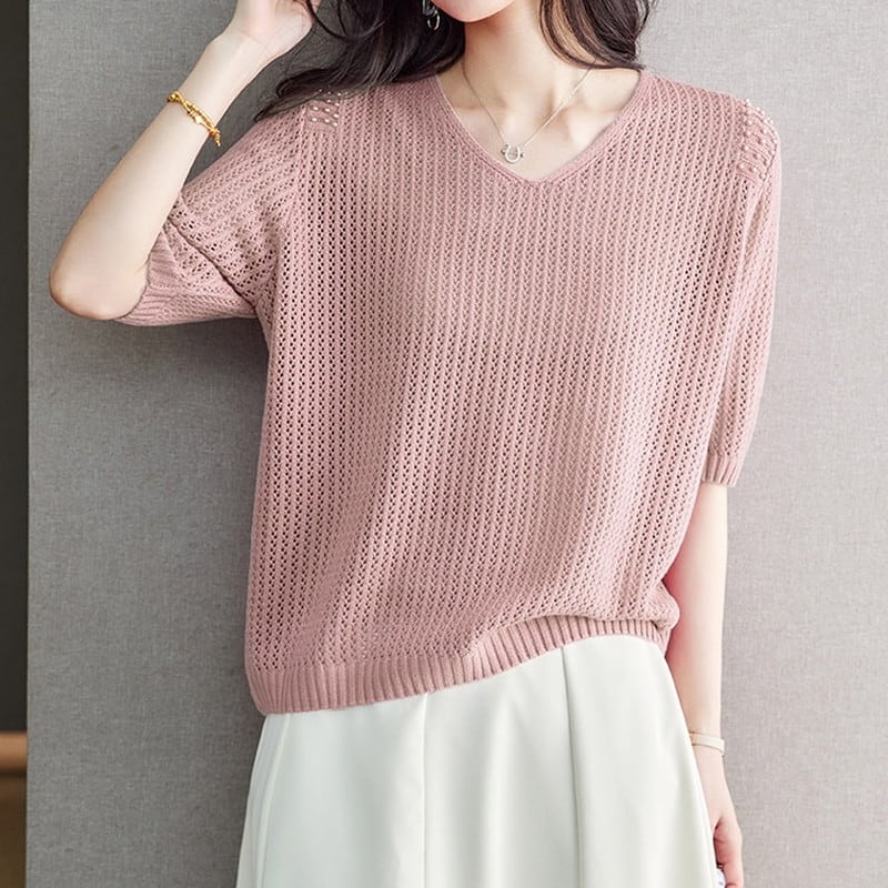 Vネックがデコルテを美しく見せ、女性らしい印象を与えます。