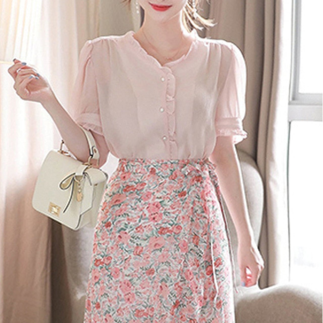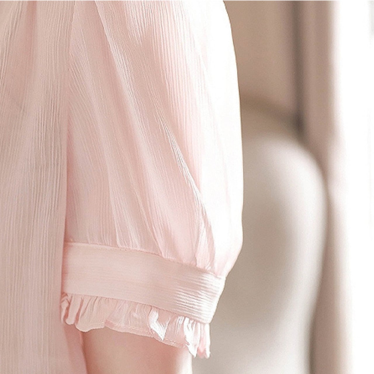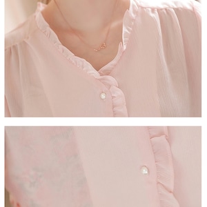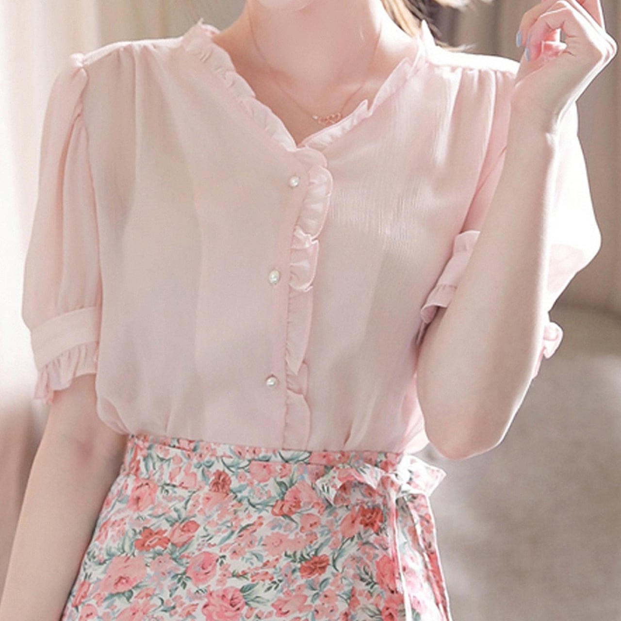 袖口や襟元のフリルが印象的なブラウスです。