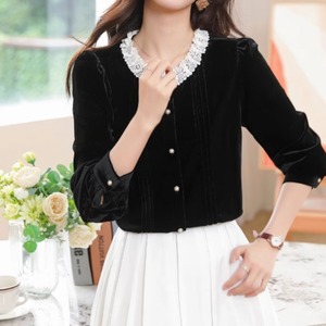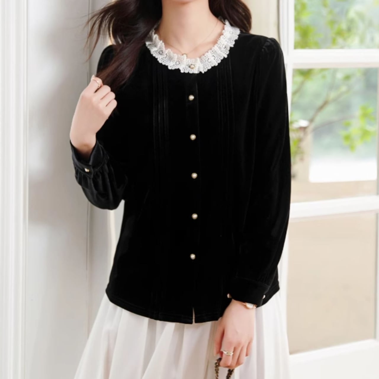 ゴールドのボタンが主張しすぎない華やかさで、オンオフ問わず活躍するアイテムです。