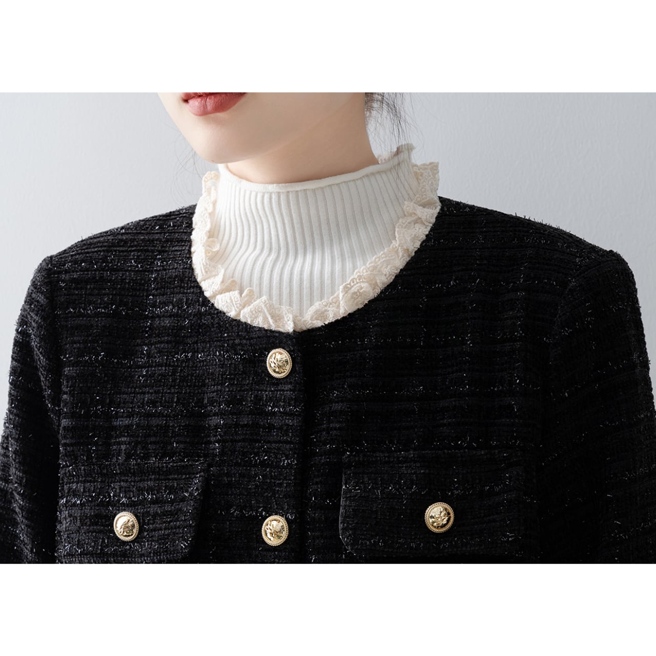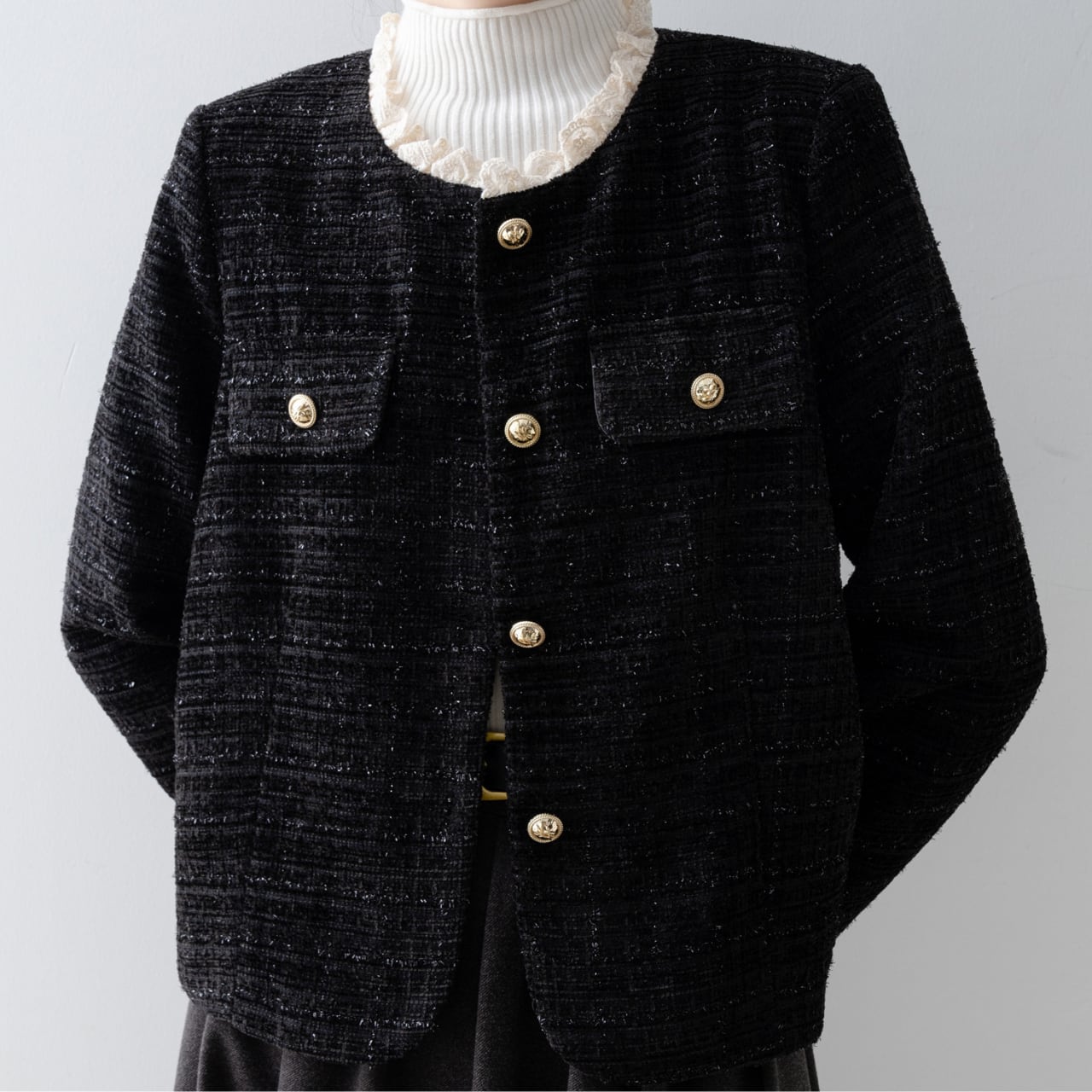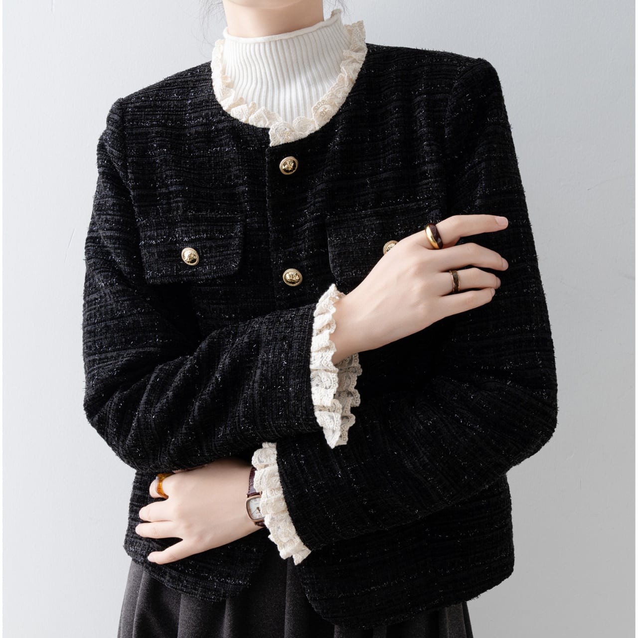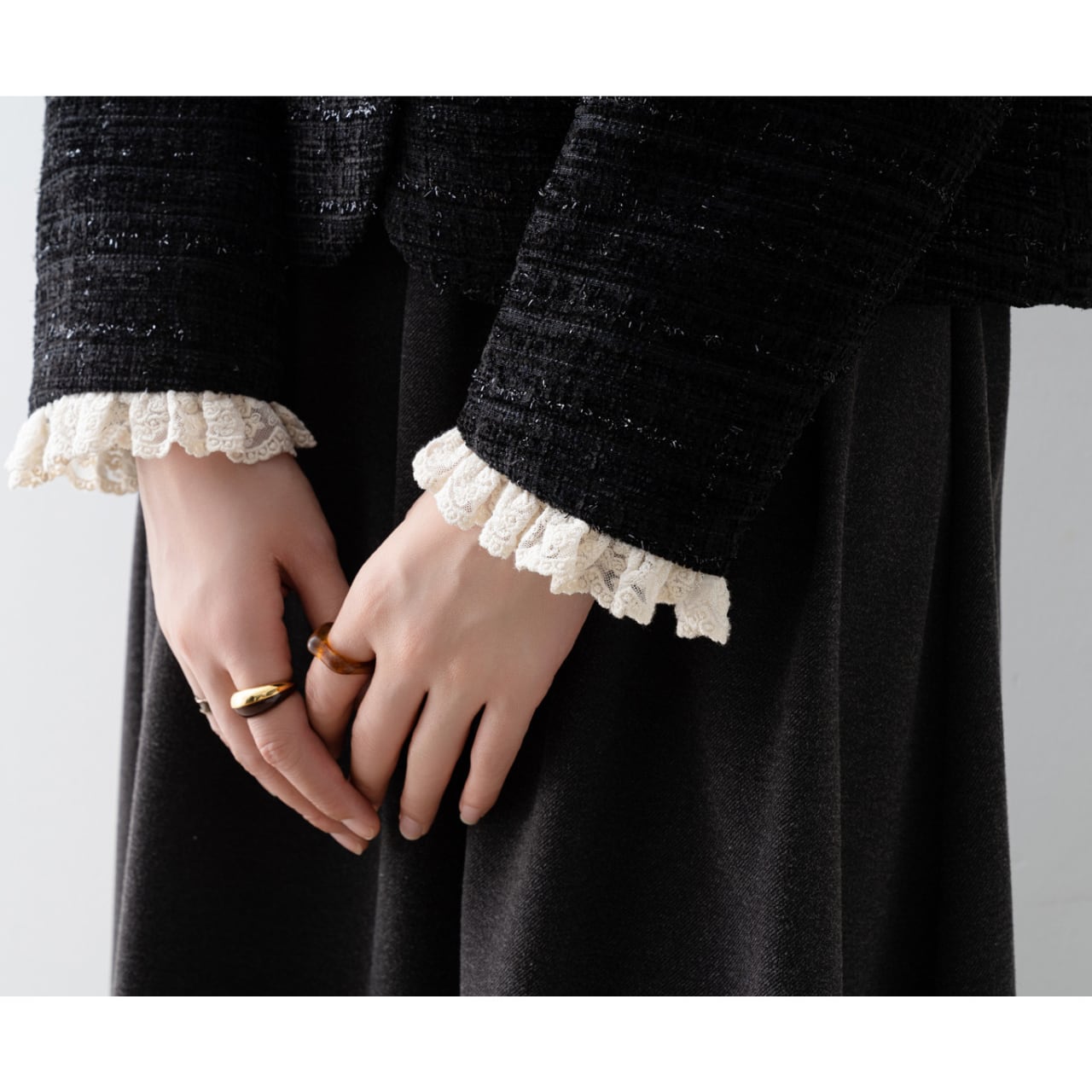 襟元と袖口のレースフリルが可愛らしいジャケットです。