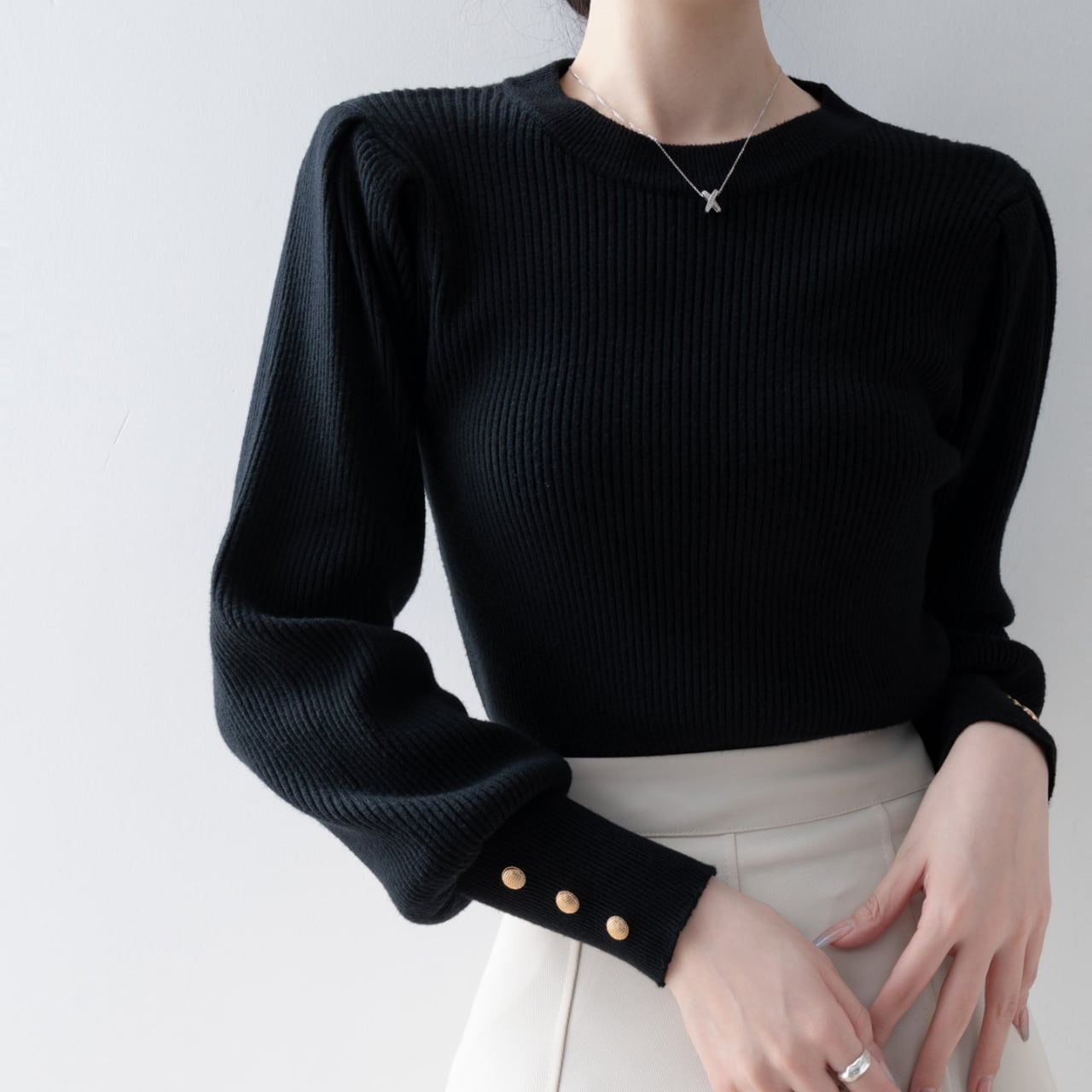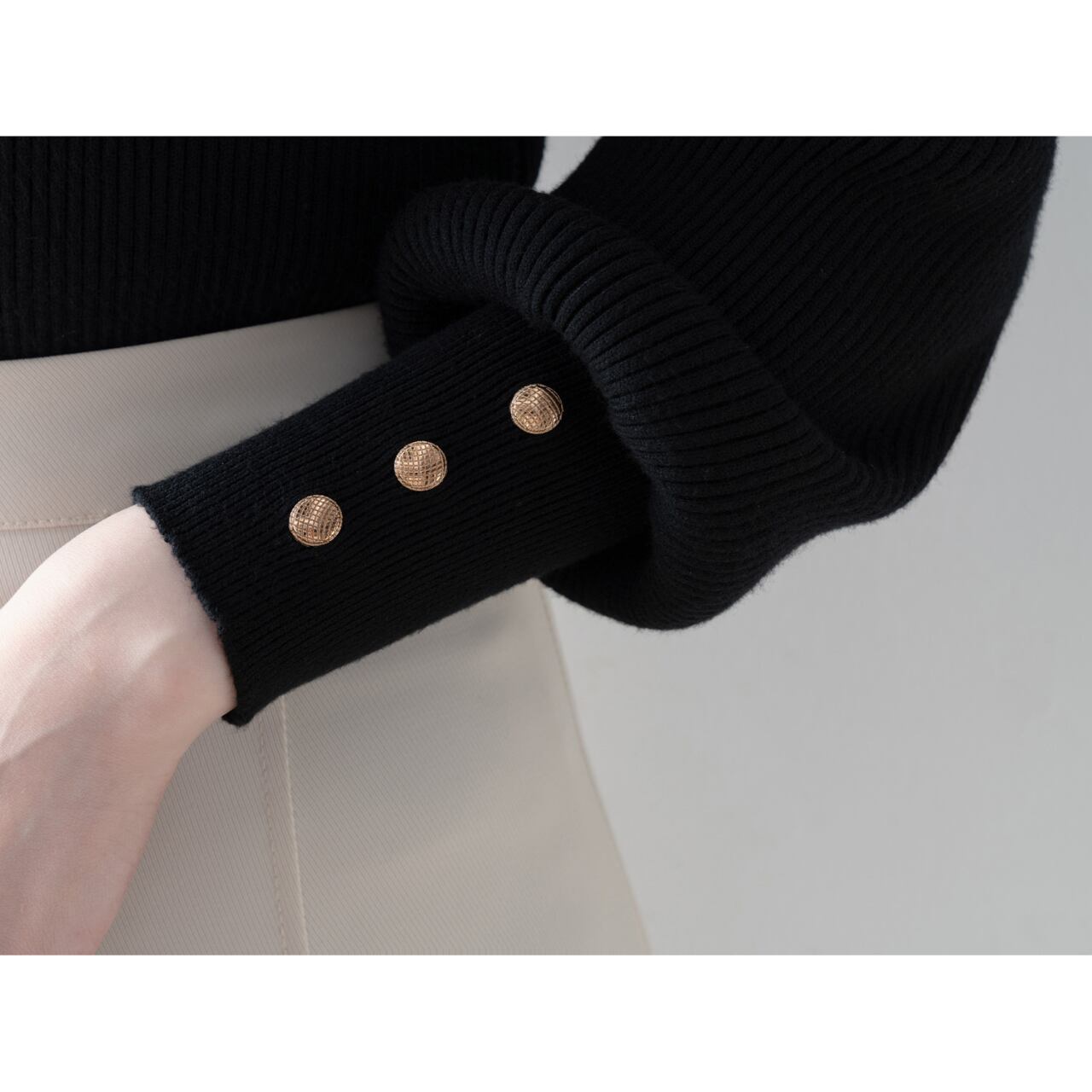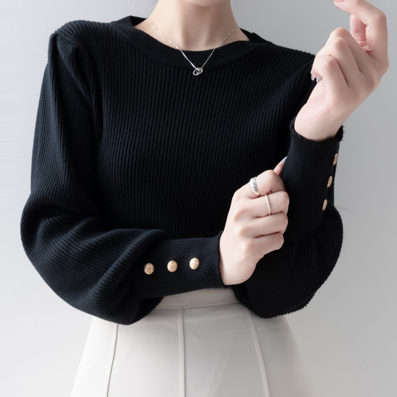 袖についたゴールドのボタンがアクセントになったニットトップスです。
