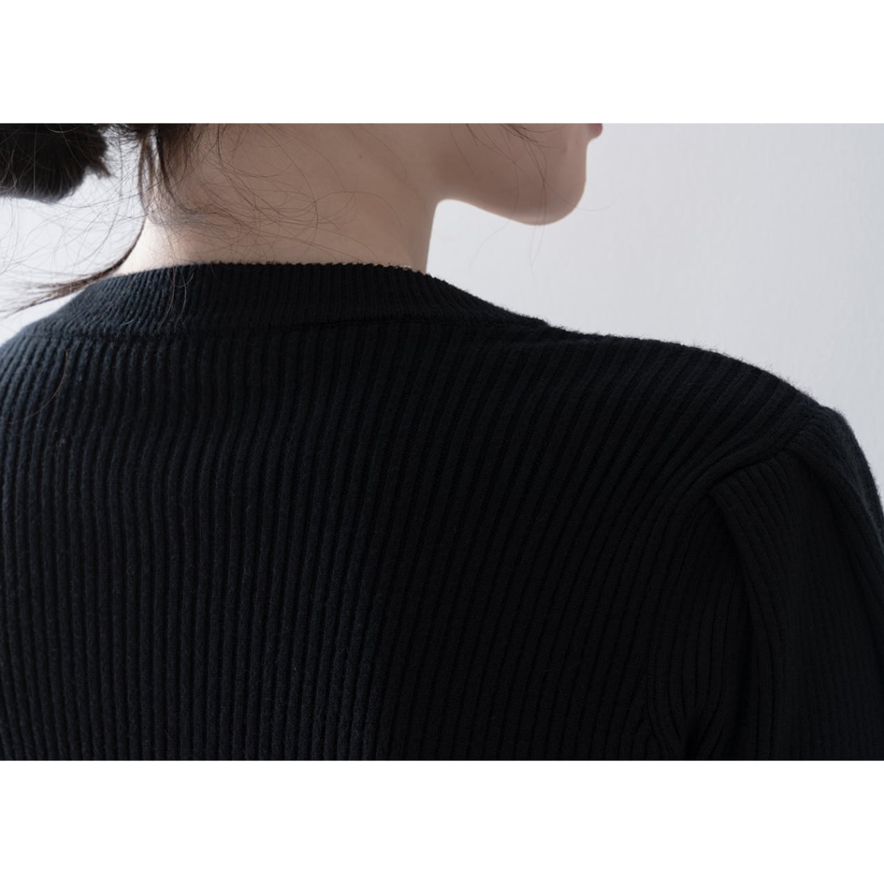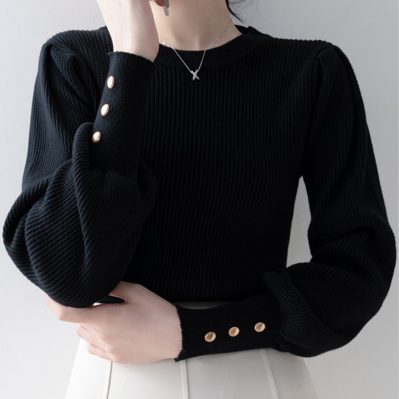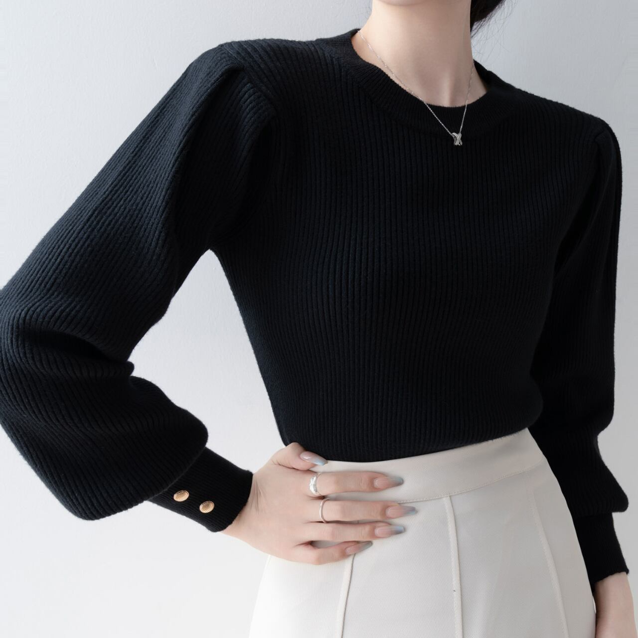 袖についたゴールドのボタンがアクセントになったニットトップスです。