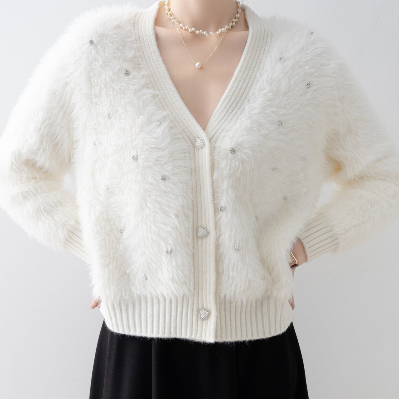 散りばめられたビジューとハート型のボタンが可愛らしさを演出してくれます。