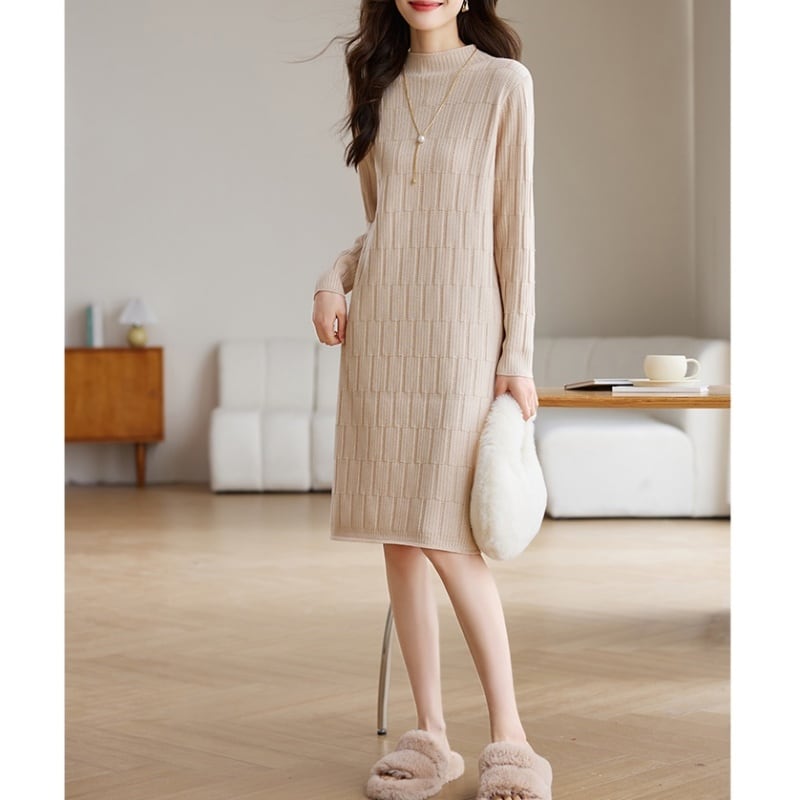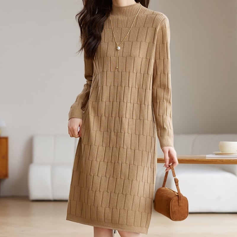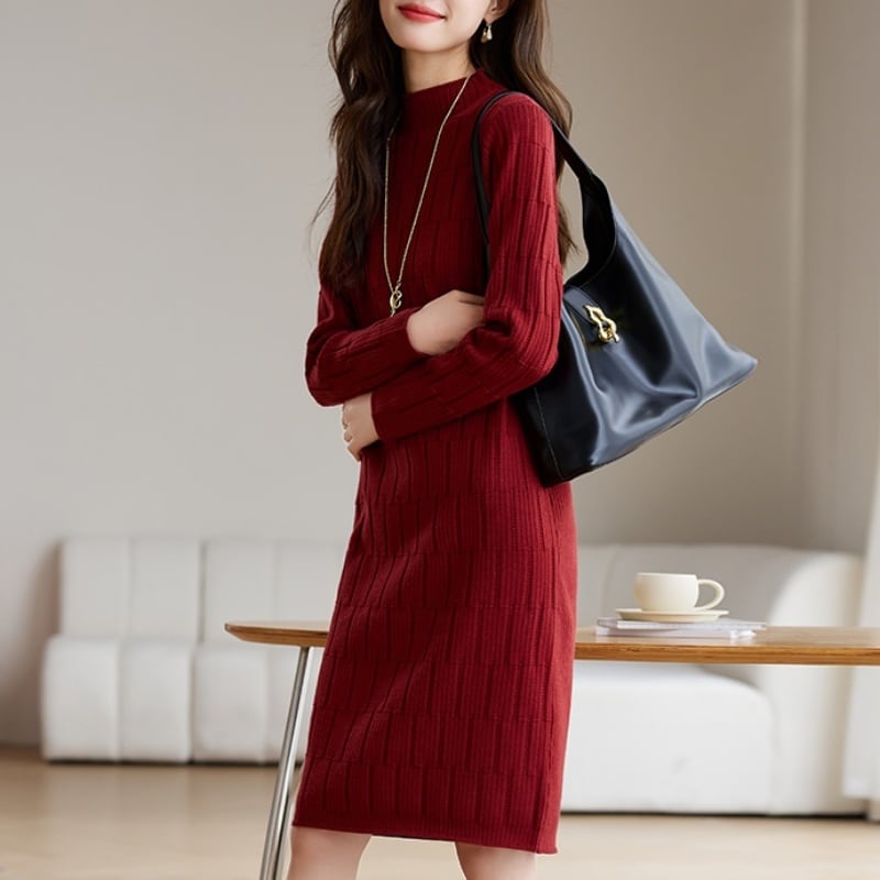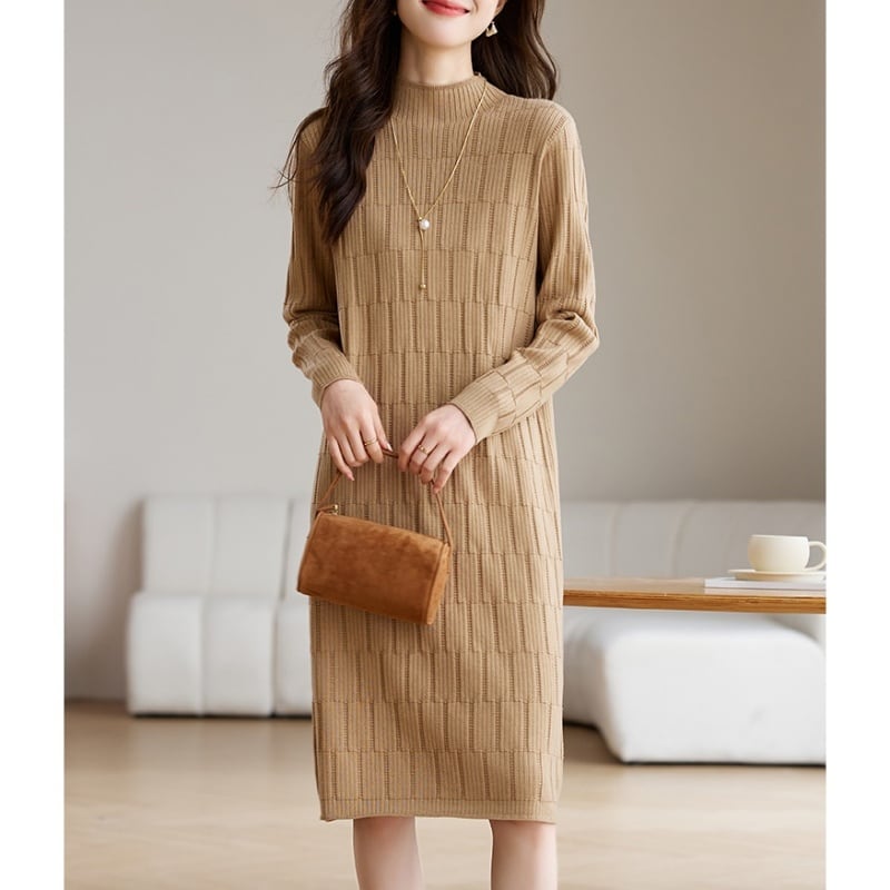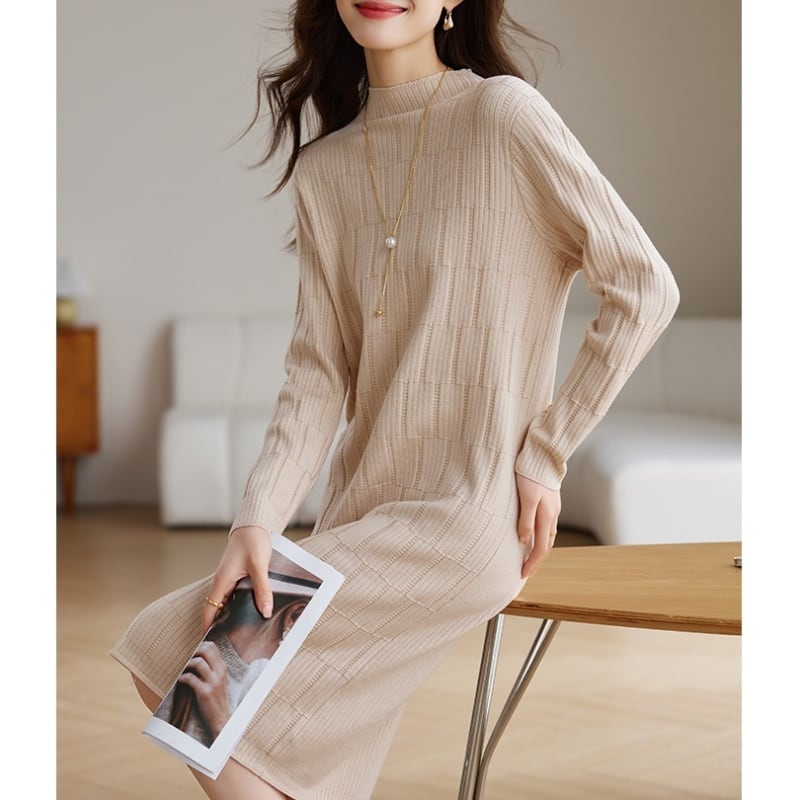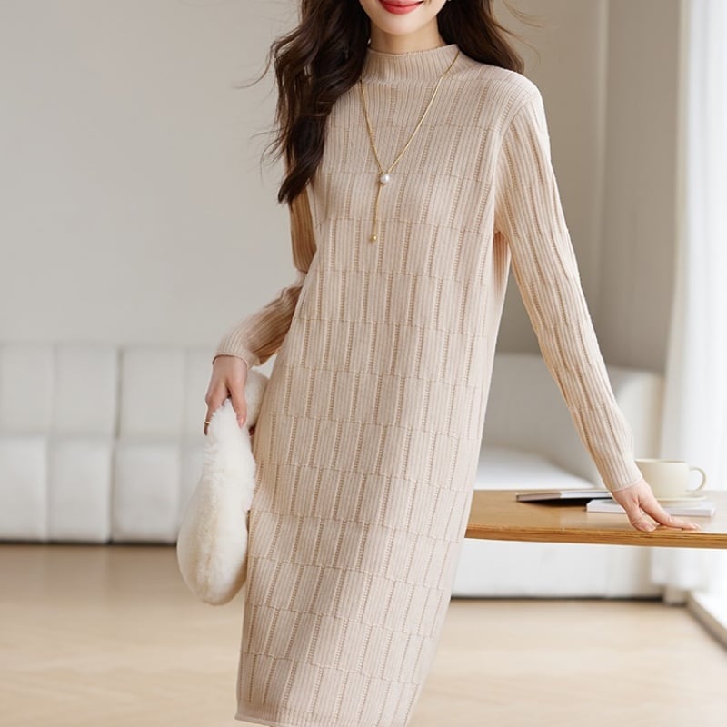 すっきりとしたハイネックと、リブ編みの美しい凹凸が特徴的なワンピースです。