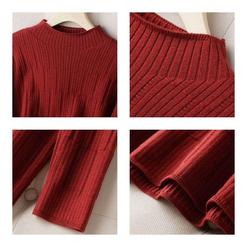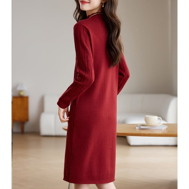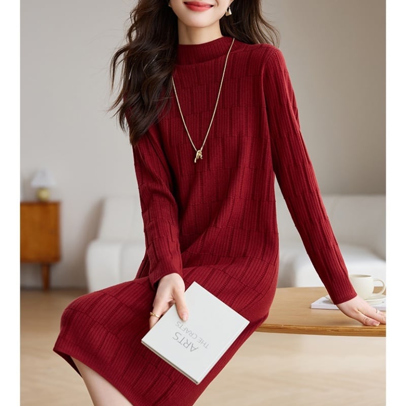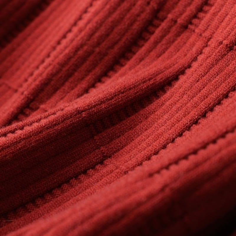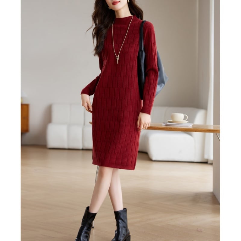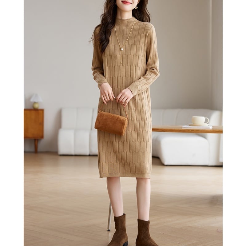 すっきりとしたハイネックと、リブ編みの美しい凹凸が特徴的なワンピースです。
