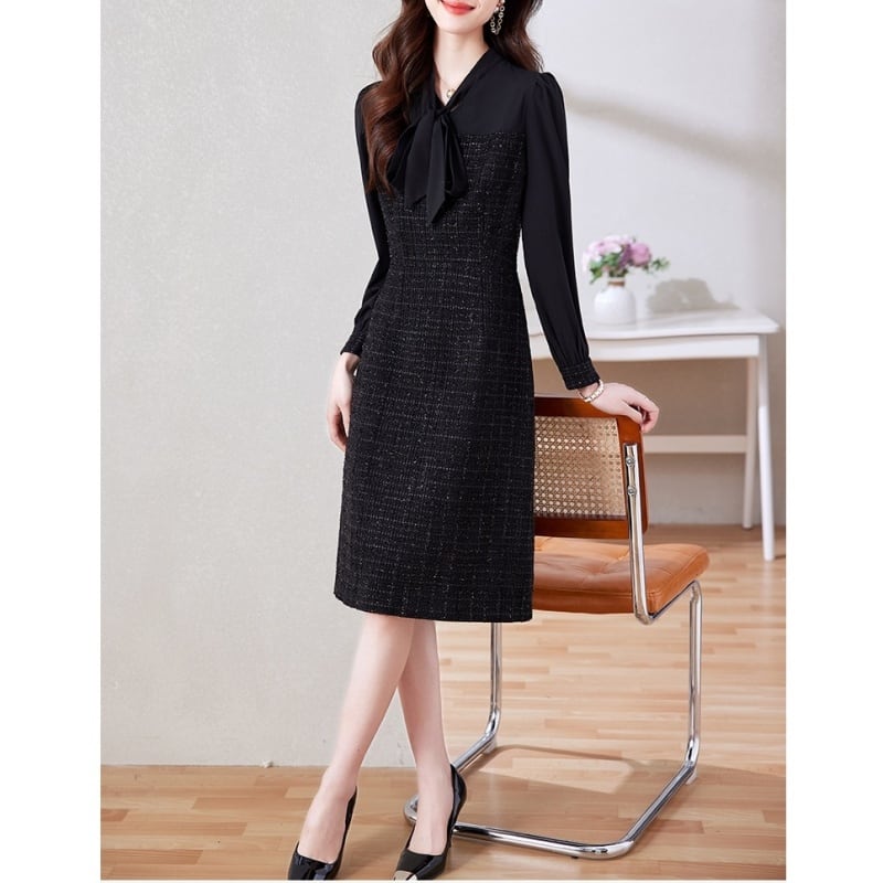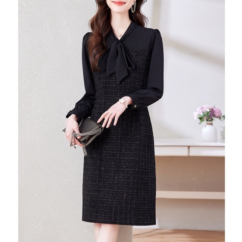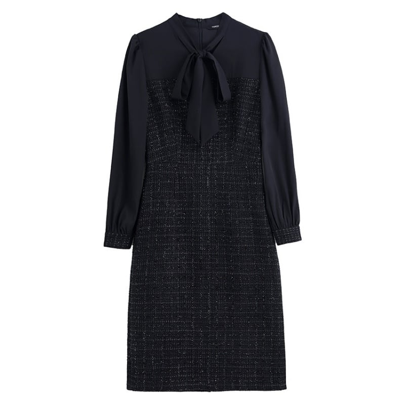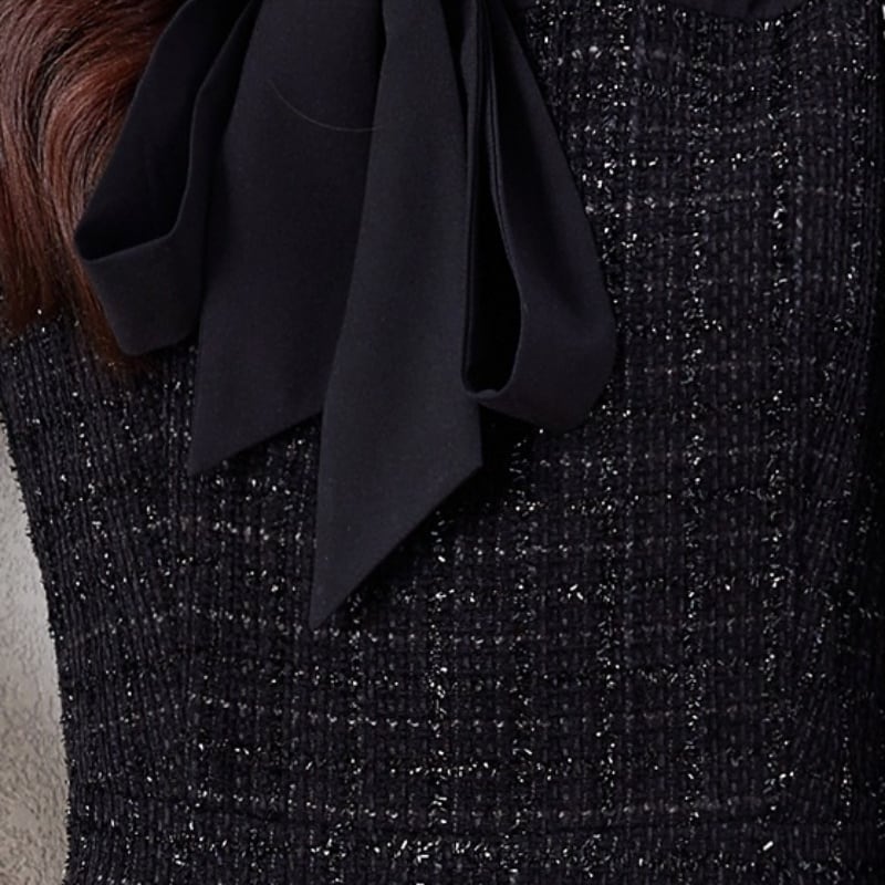 上品なツイード素材と、可愛らしいボウタイが魅力のワンピースです。