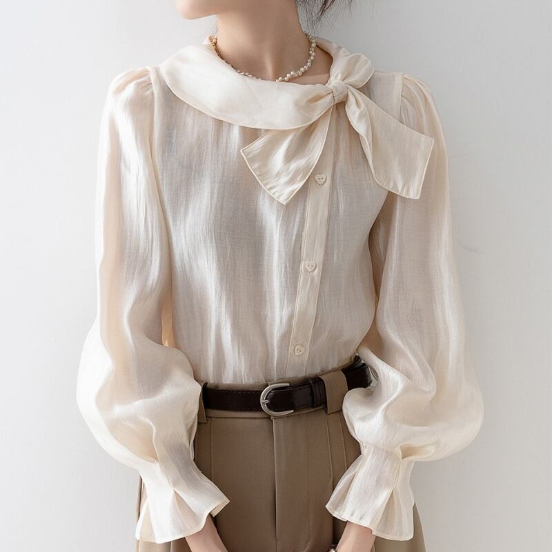 可愛らしいボウタイと、ボリュームのあるバルーンスリーブが魅力のブラウスです。