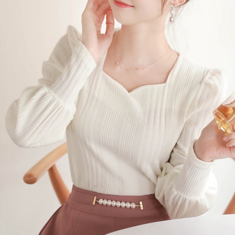 ハートネックの優美なラインとバルーンスリーブの可愛らしさが融合したニットトップスです。