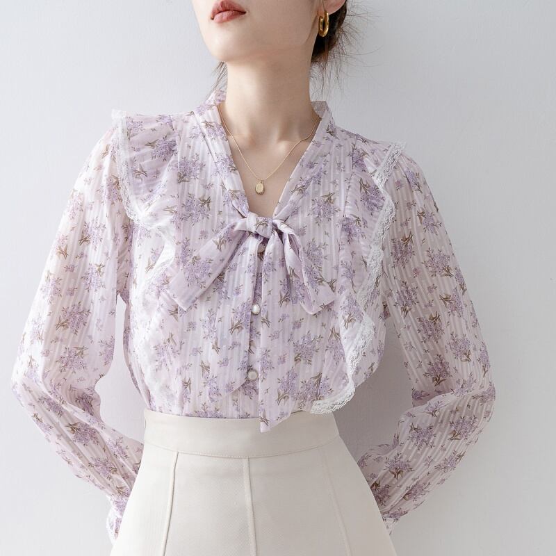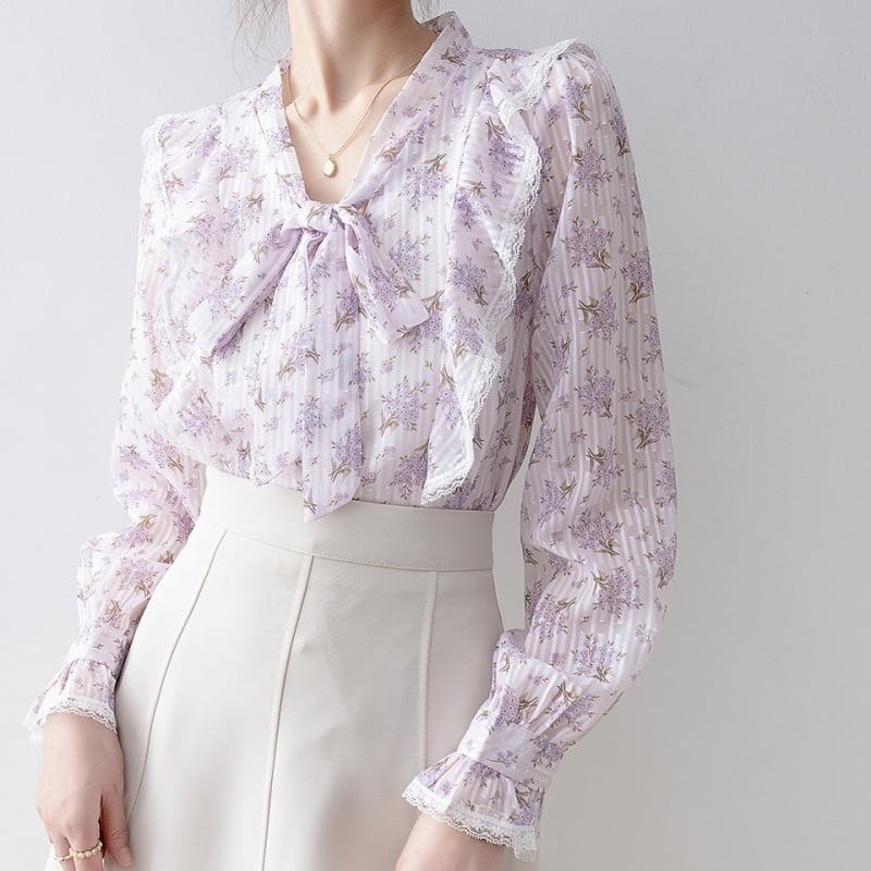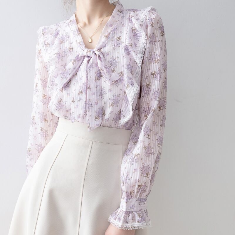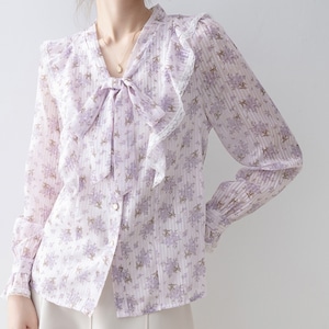 透け感のある素材と、可愛らしい小花柄が魅力のブラウスです。