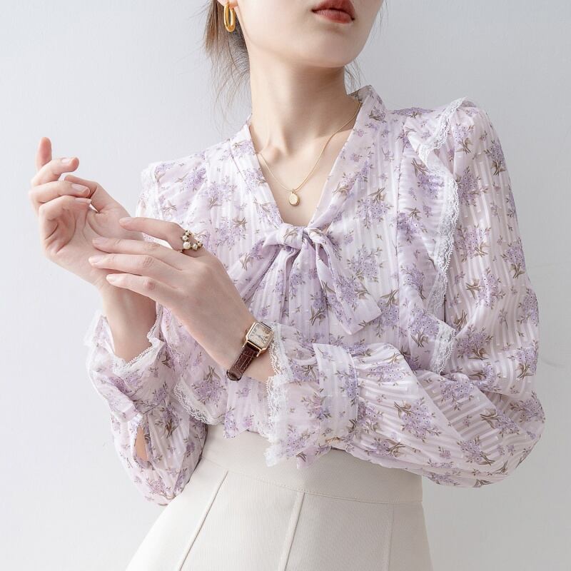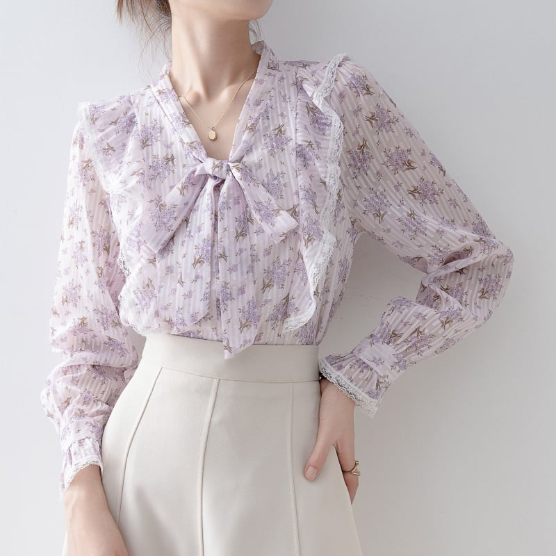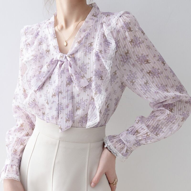 ボウタイと袖口のレースが、女性らしいフェミニンな雰囲気を演出します。
