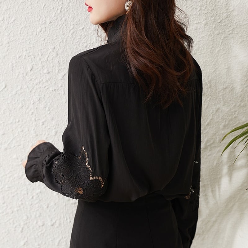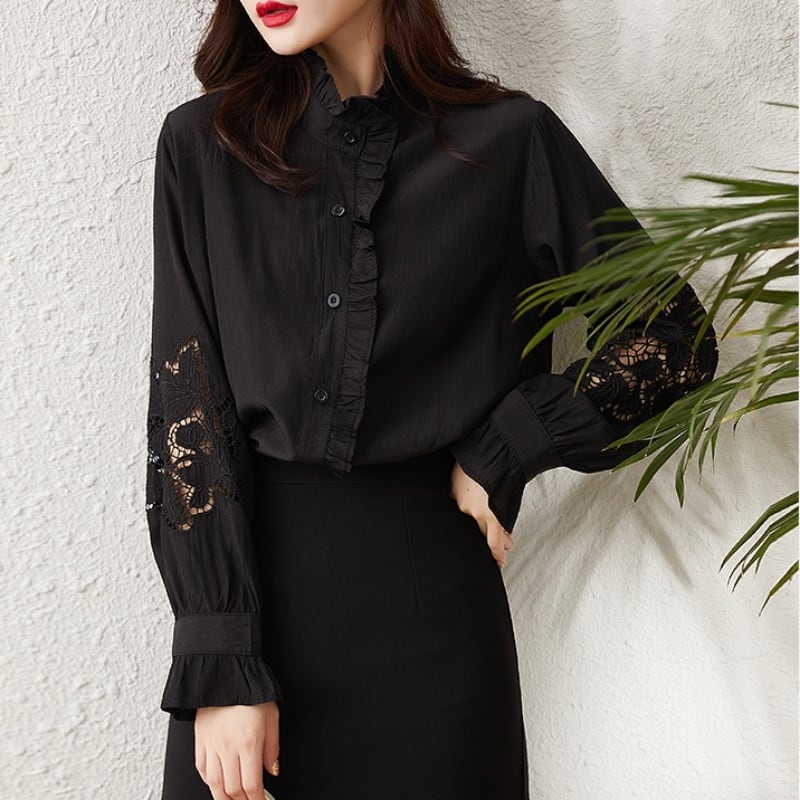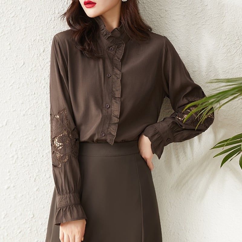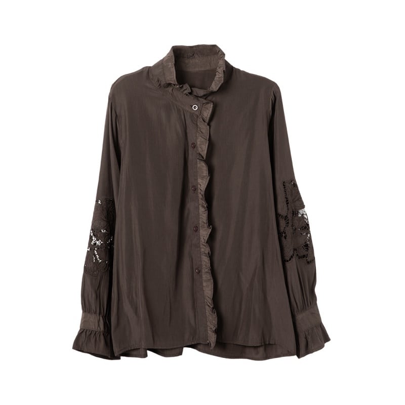 スタンドカラーとフリルが女性らしい印象のシャツです。